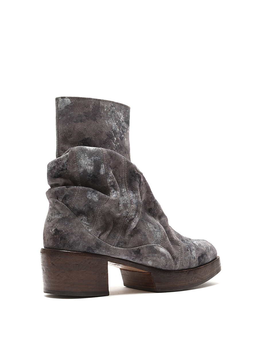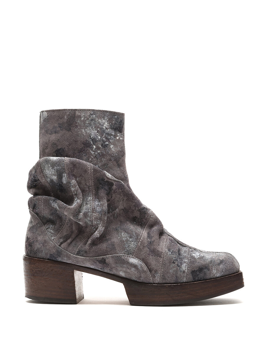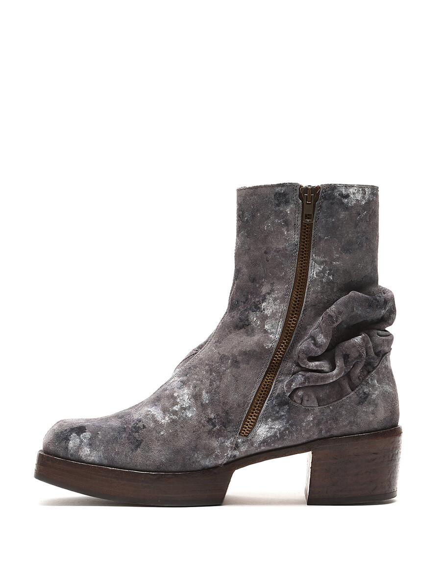 Bottines en daim gris à effet plissé. Bout rond. Fermeture à glissière sur le côté.