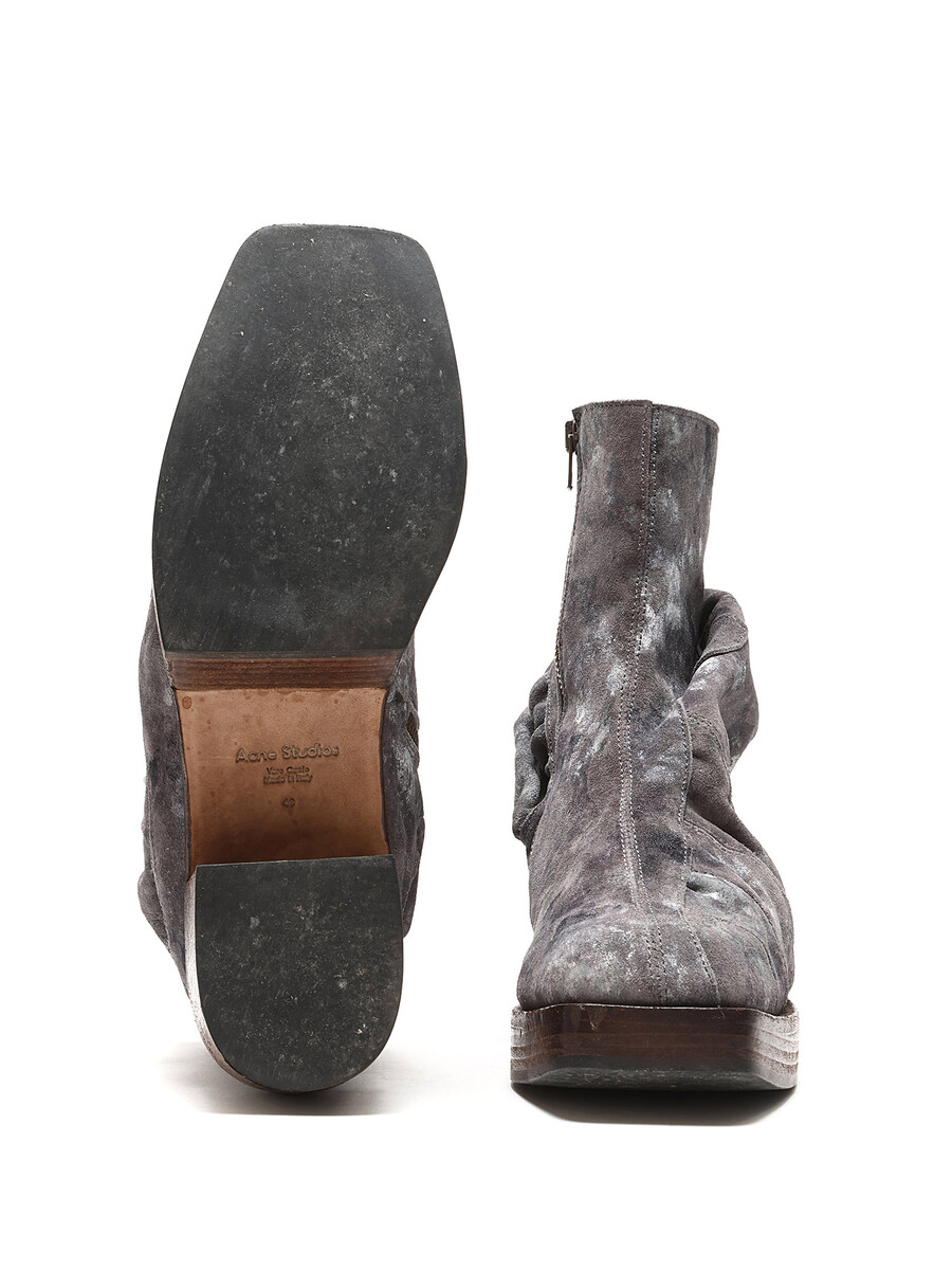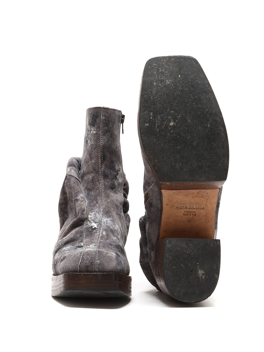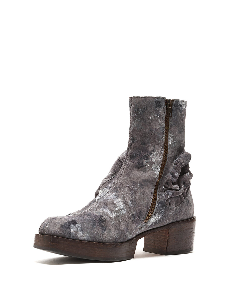 Bottines en daim gris à effet plissé. Bout rond. Fermeture à glissière sur le côté.