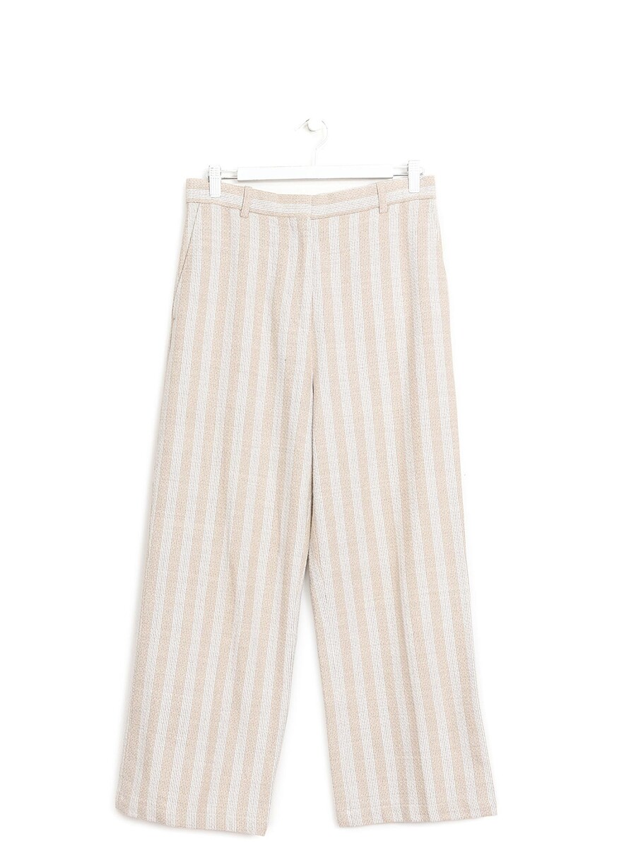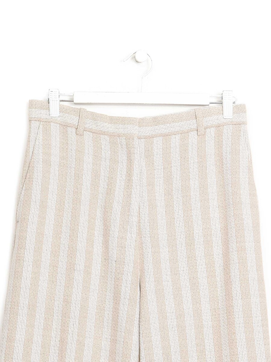 Pantalon en coton mélangé à motif rayé beige et blanc. Fermeture à crochet et à glissière. Passants de ceinture. Deux poches arrière.