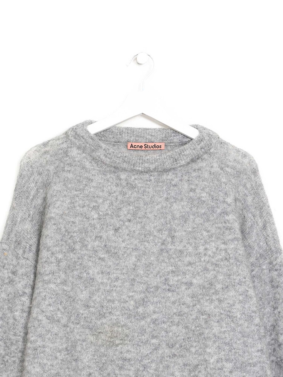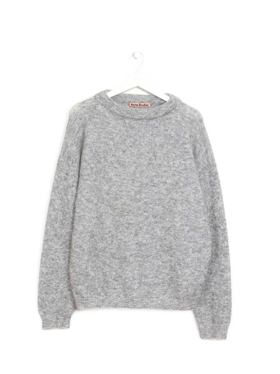 Pull gris en tricot duveteux à manches longues et col ras-du-cou. Tissu doux et confortable, coupe chic et décontractée.