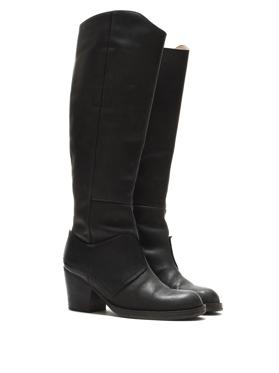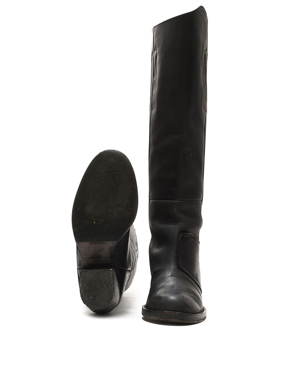 Bottes en cuir grainé jusqu'aux genoux en noir. Fermeture à glissière latérale. Bout rond. Fait en Italie. Resemellées avec des signes visibles d'usure et des plis sur le cuir.