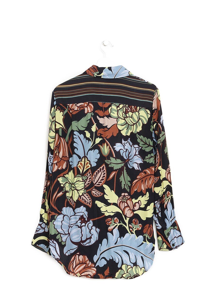 Chemise à manches longues à motif floral dans les tons de noir, bleu, jaune, vert et bleu. Col pointu avec fermeture à boutons devant.