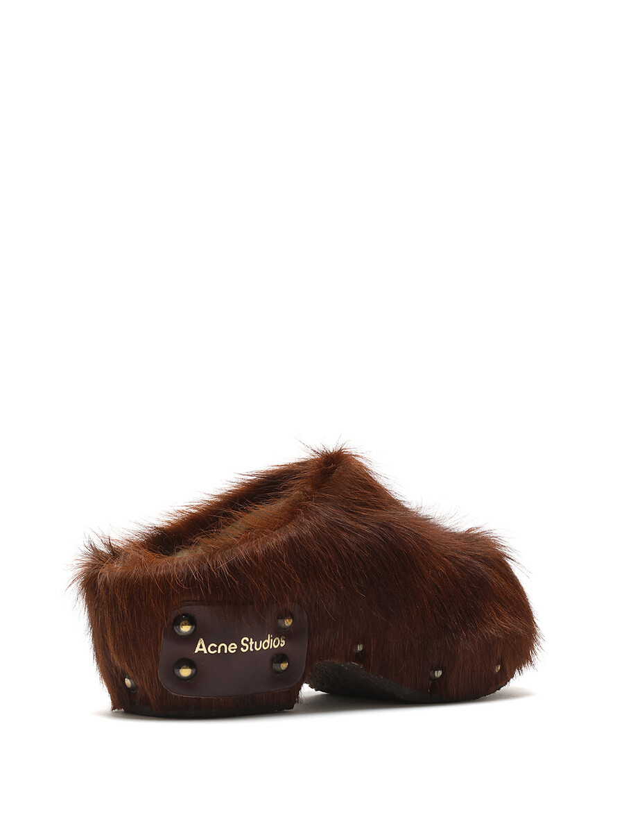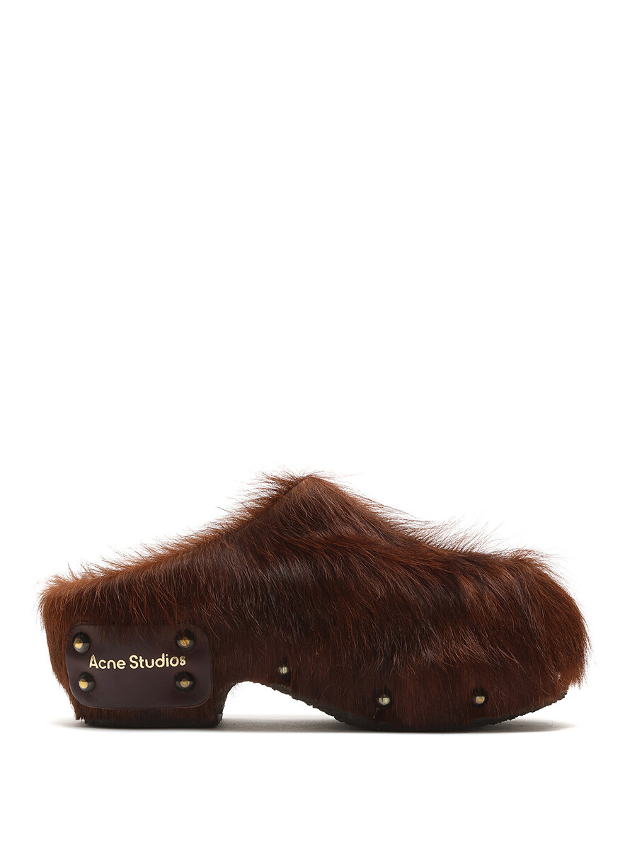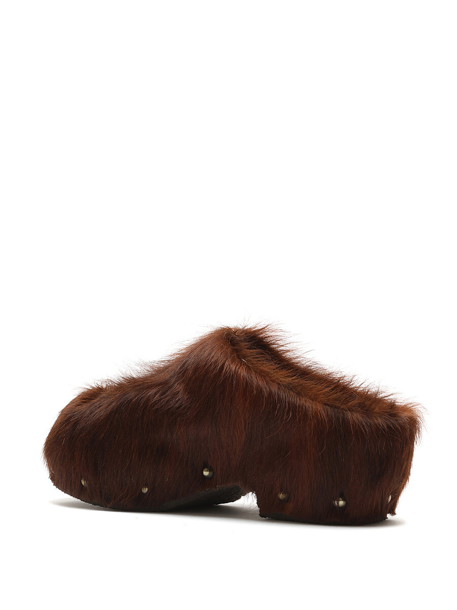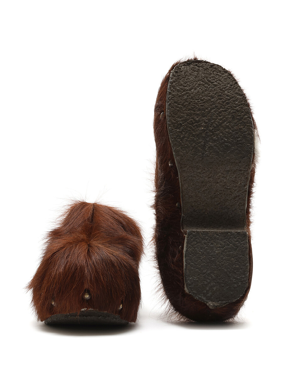 Sabots en fourrure de poney marron avec doublure en sherpa synthétique. Modèle à enfiler avec bout rond et semelle en caoutchouc.