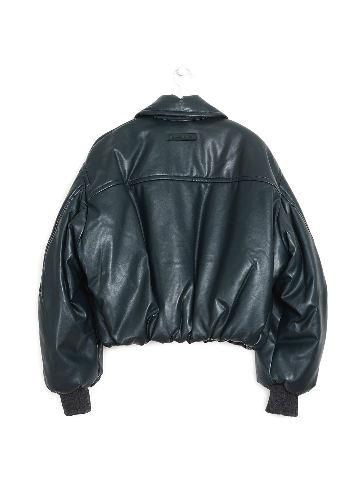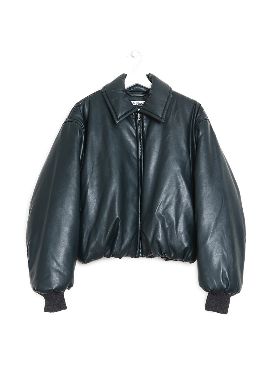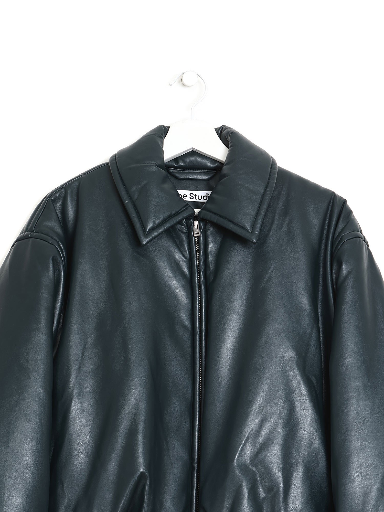 Veste à manches longues en cuir synthétique vert foncé avec une finition élégante. Fermeture à glissière devant et poches latérales pratiques.