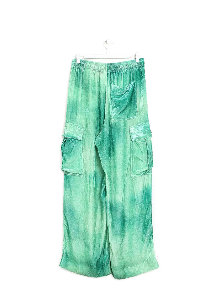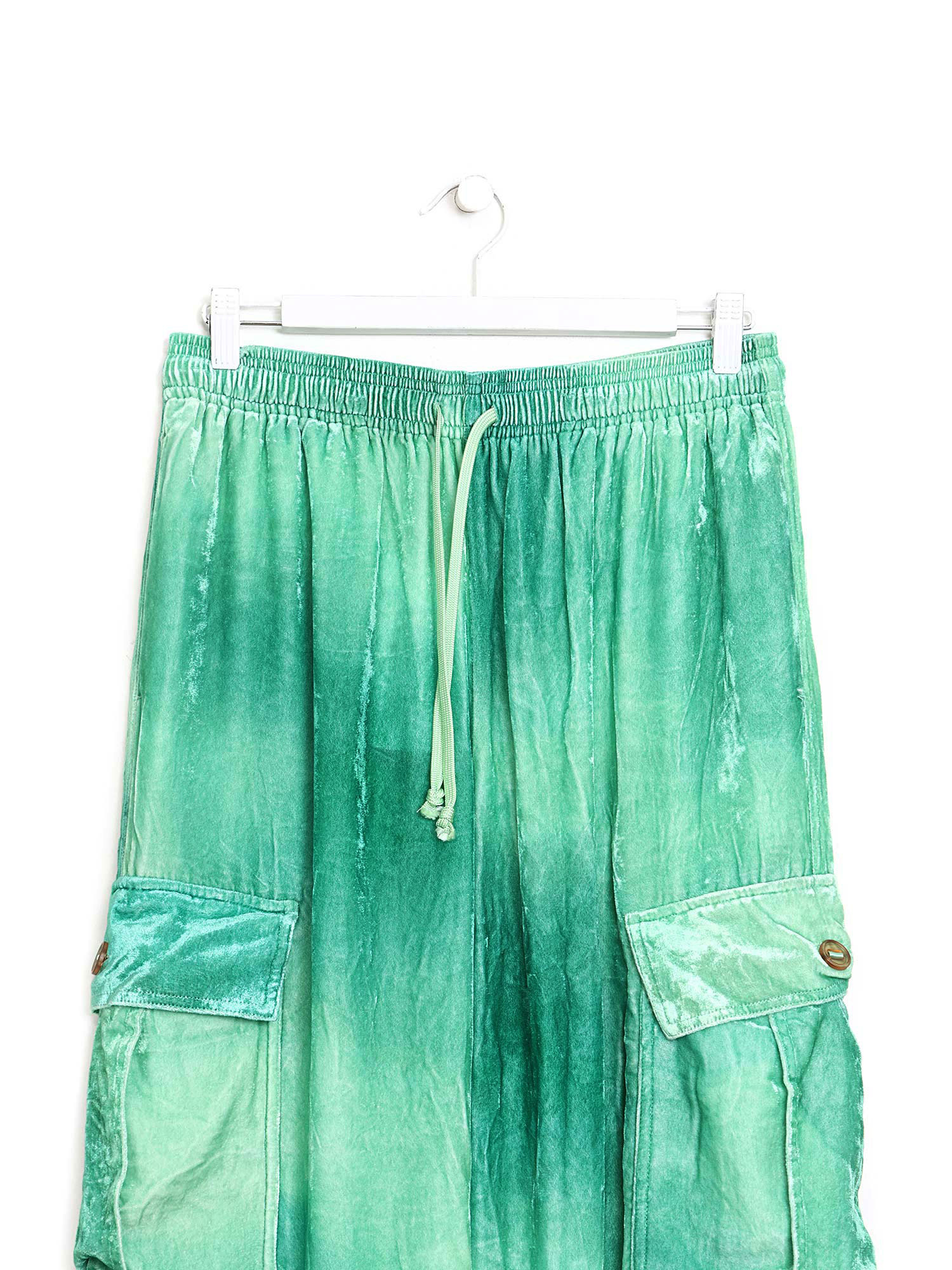 Pantalon cargo à jambes larges en vert. Cordon de serrage ajustable à la taille. Coupe décontractée avec poches utilitaires sur les côtés.