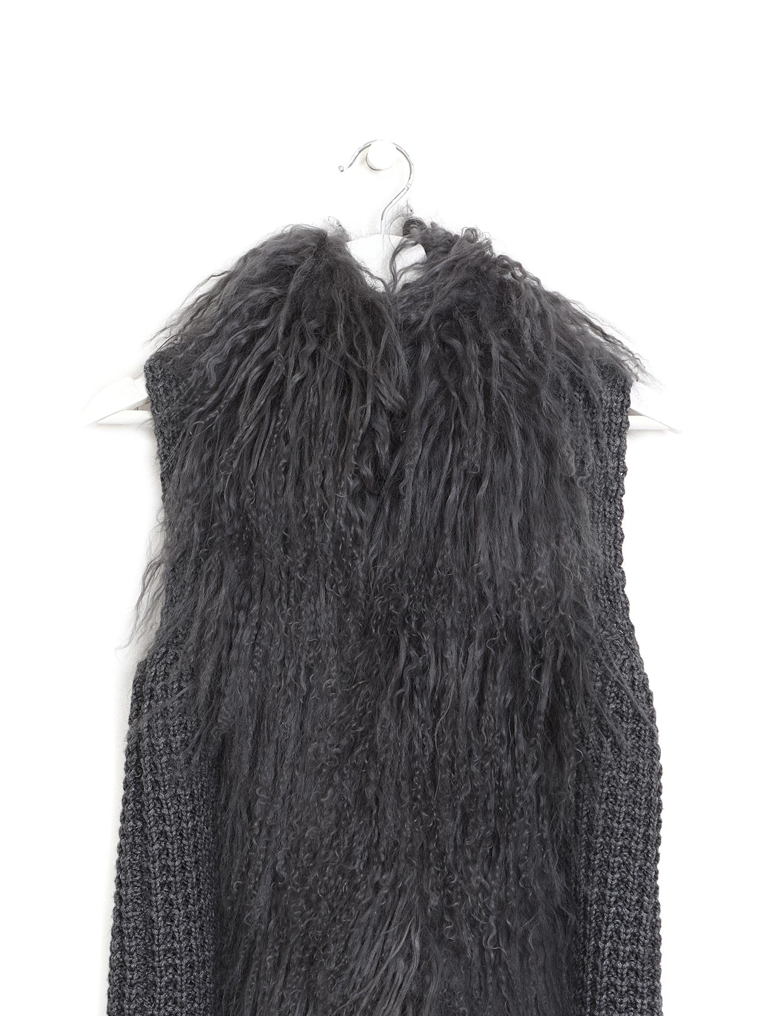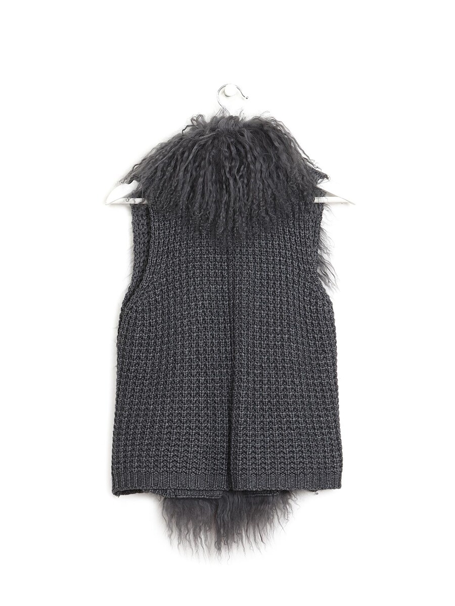 Veste sans manches en mélange de cachemire en gris, avec bordure de mouton de Mongolie. Toucher doux et luxueux.