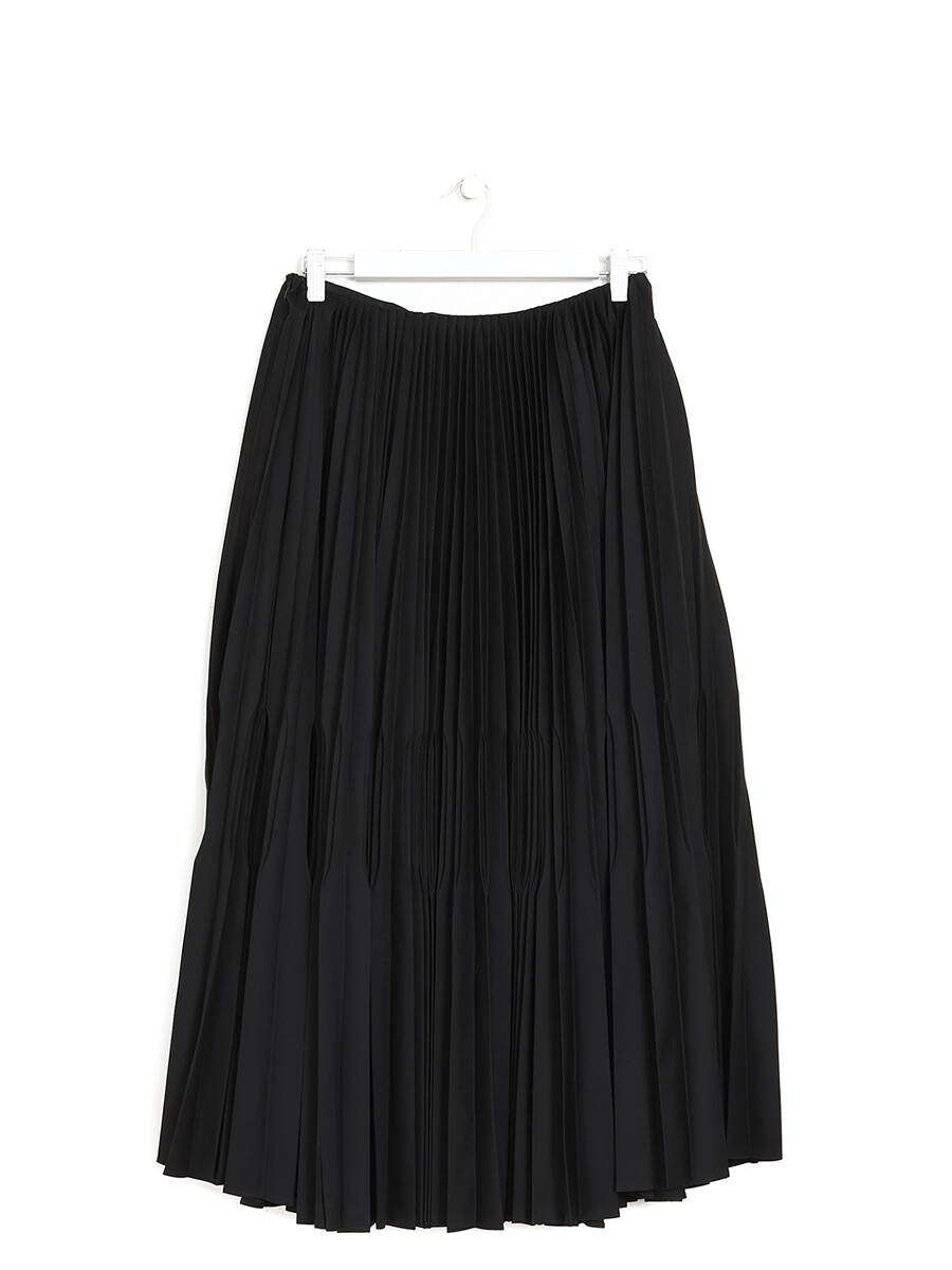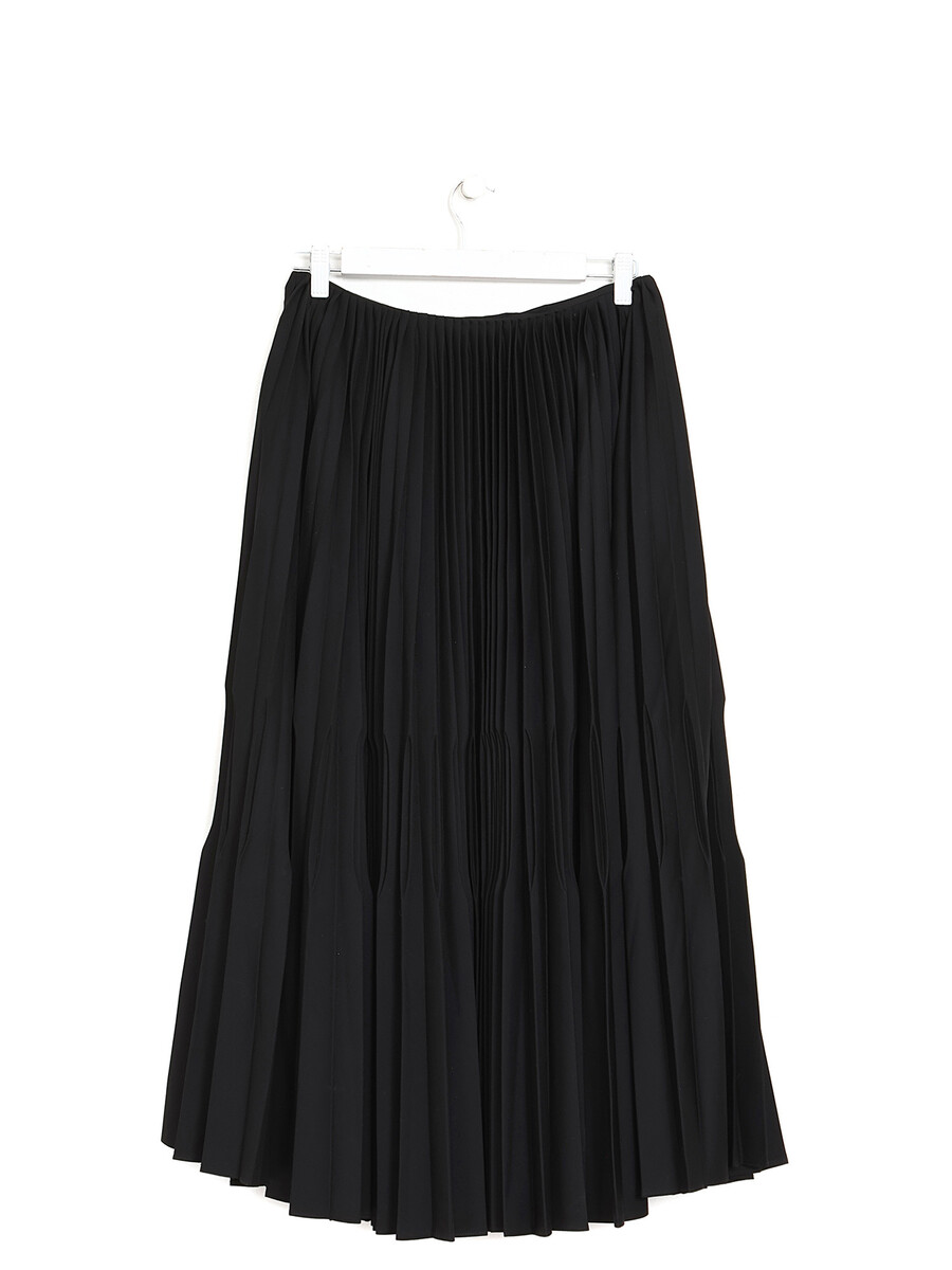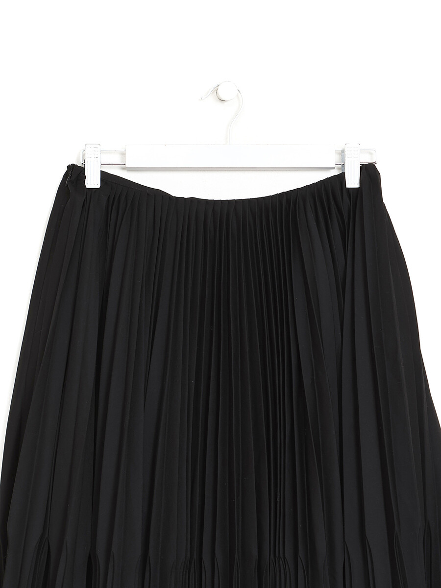 Jupe mi-longue plissée noire. Design entièrement plissé offrant un mouvement fluide et une silhouette élégante. Fermeture éclair latérale dissimulée.