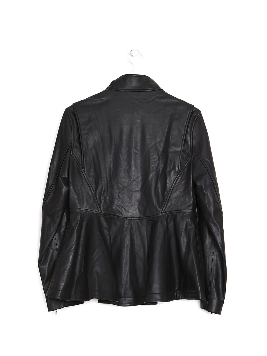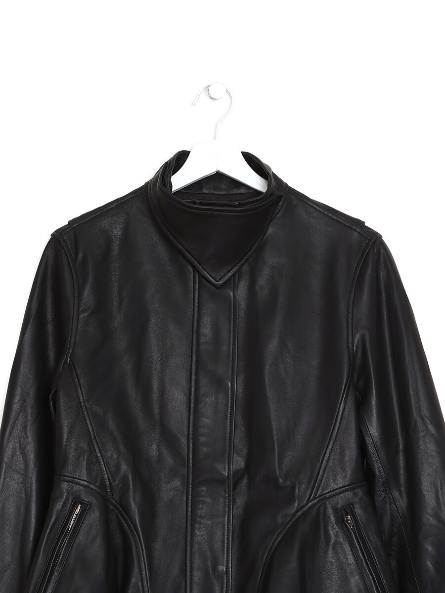 Veste en cuir de mouton noir à manches longues avec fermeture à glissière et col montant. Deux poches.