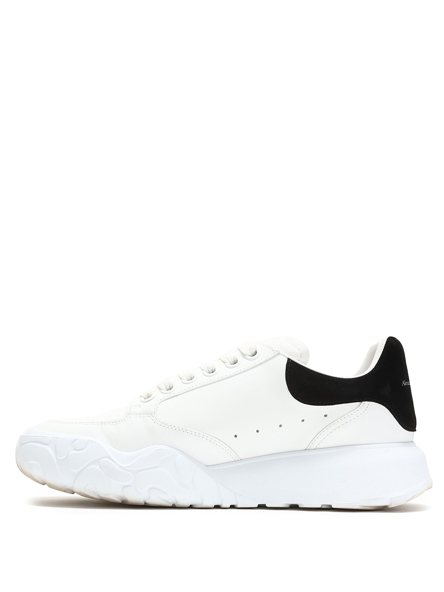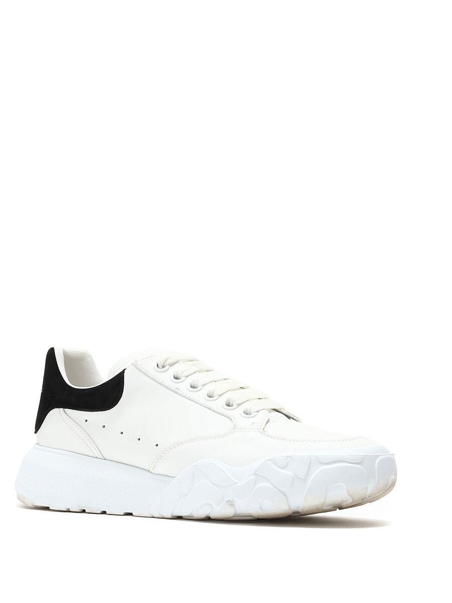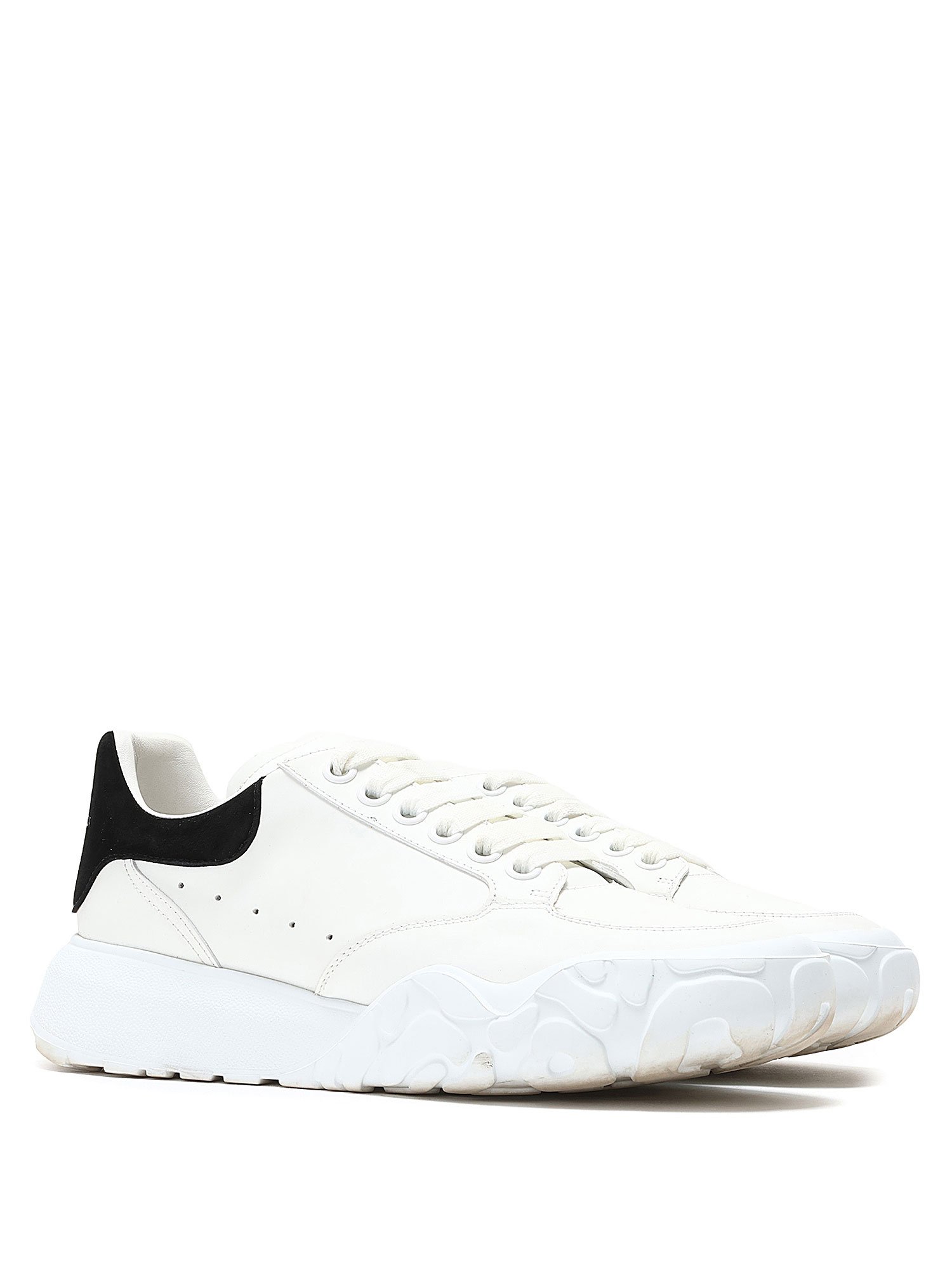 Espadrilles basses en cuir et daim blanc et noir. Fermeture à lacets. Bout rond fermé. Semelle crantée en caoutchouc.