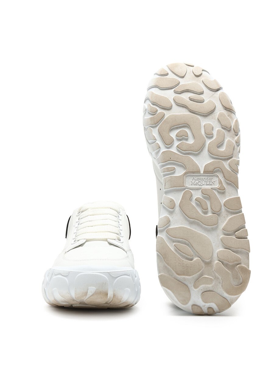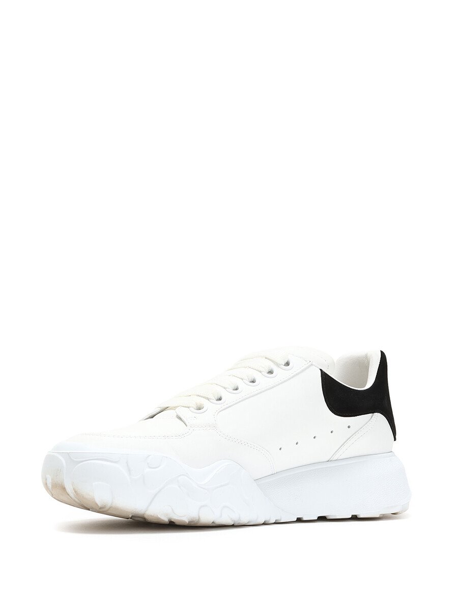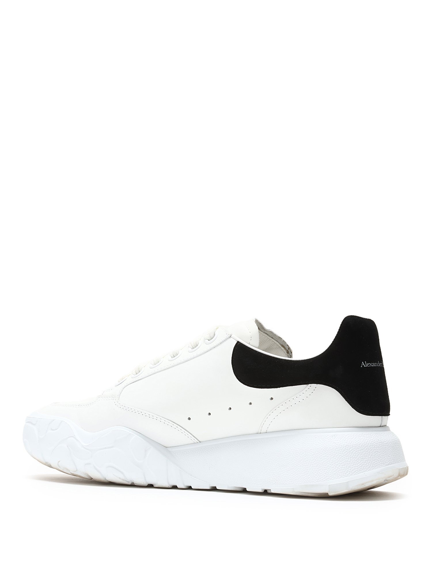Espadrilles basses en cuir et daim blanc et noir. Fermeture à lacets. Bout rond fermé. Semelle crantée en caoutchouc.