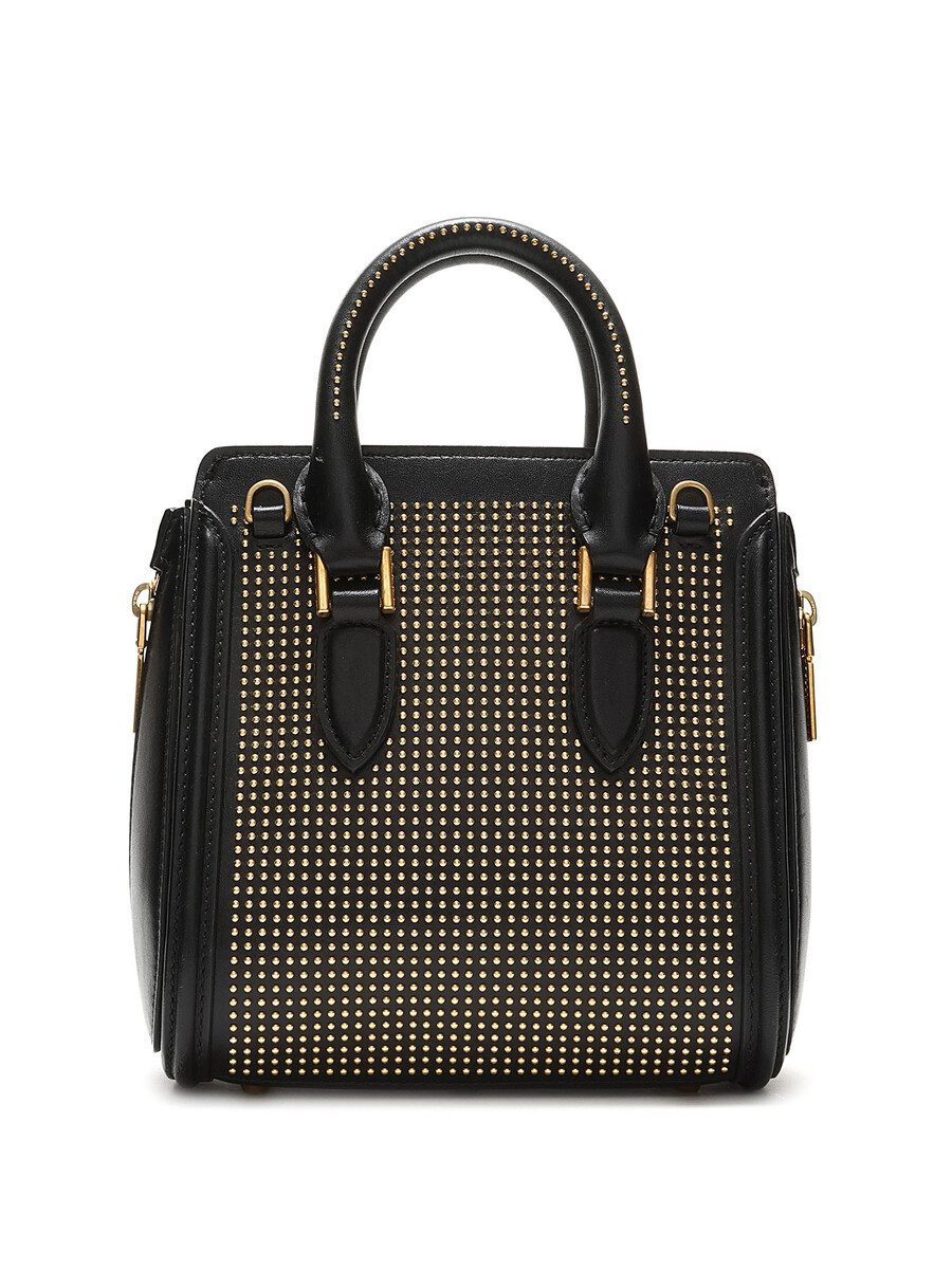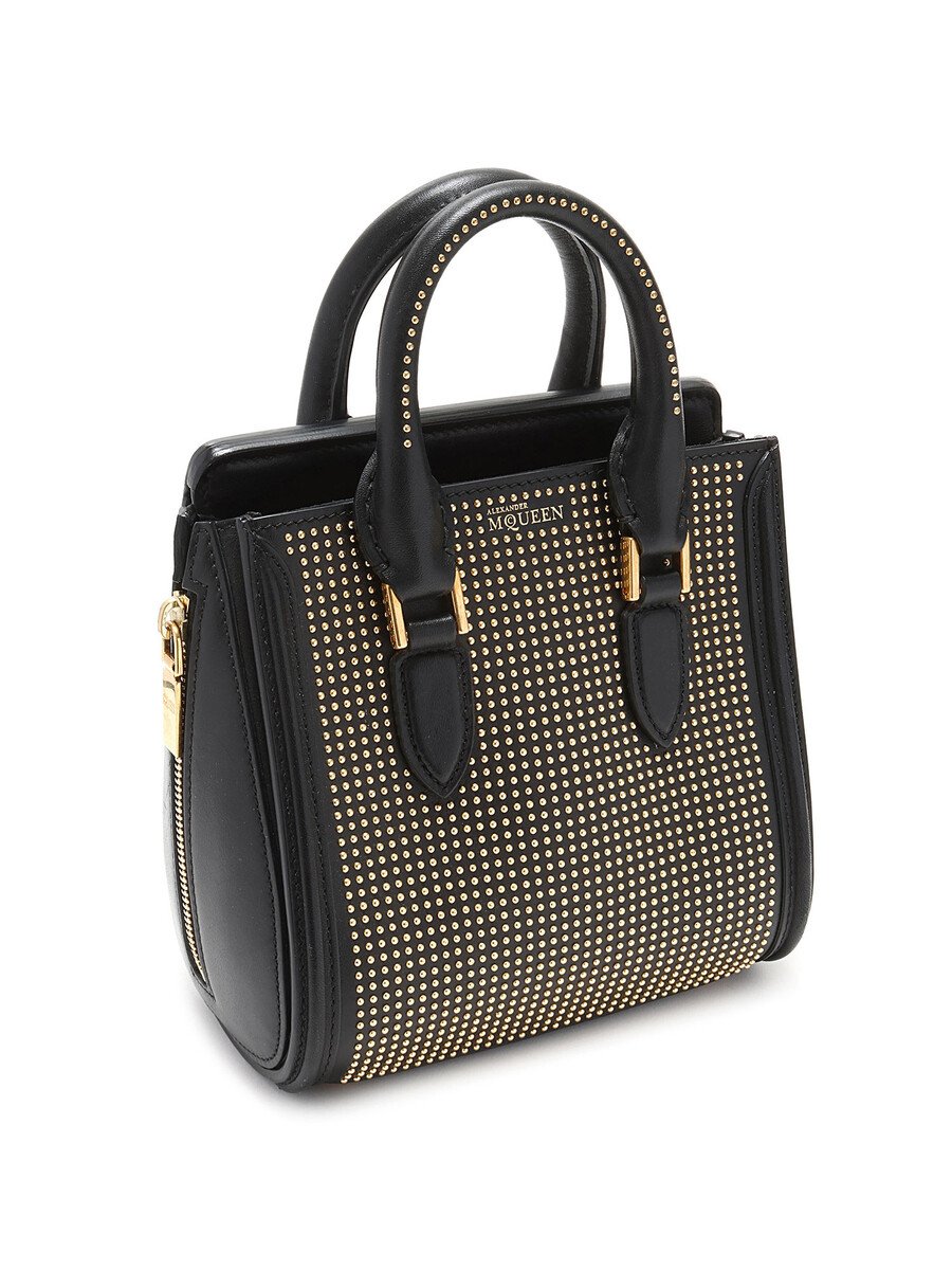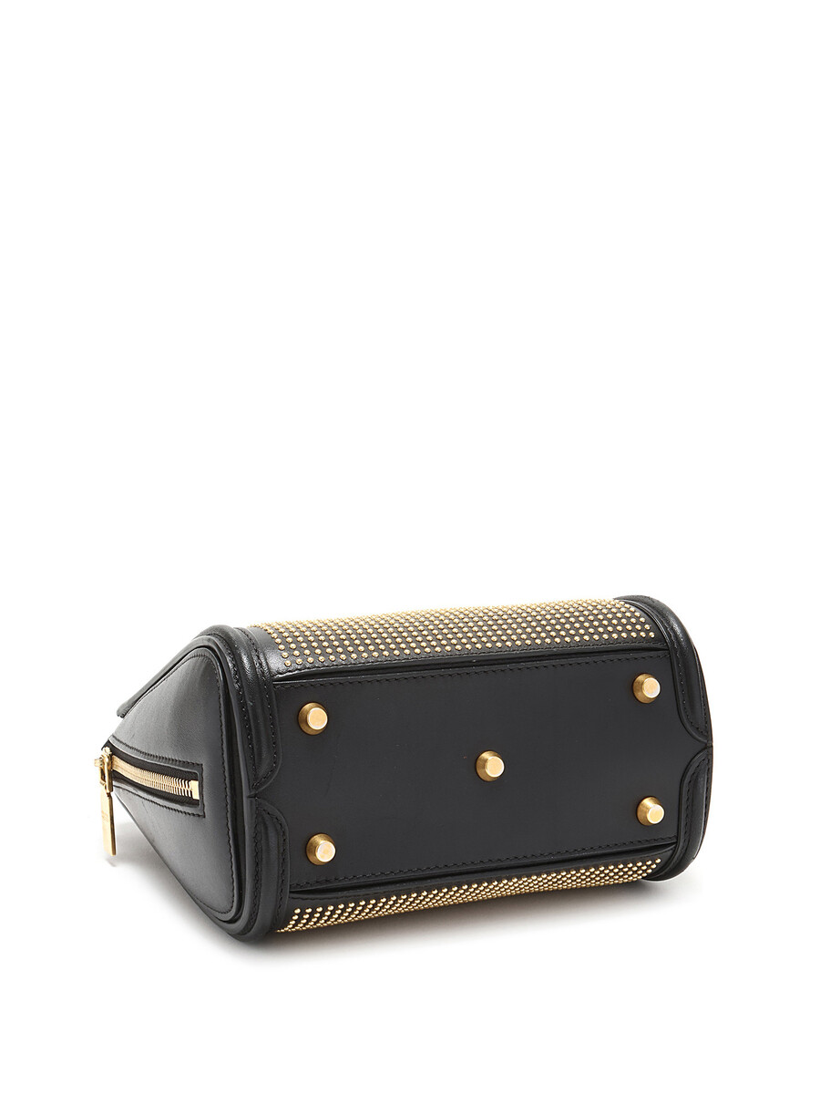 Mini sac en cuir noir avec clous dorés. Ganses supérieures et quincaillerie dorée.