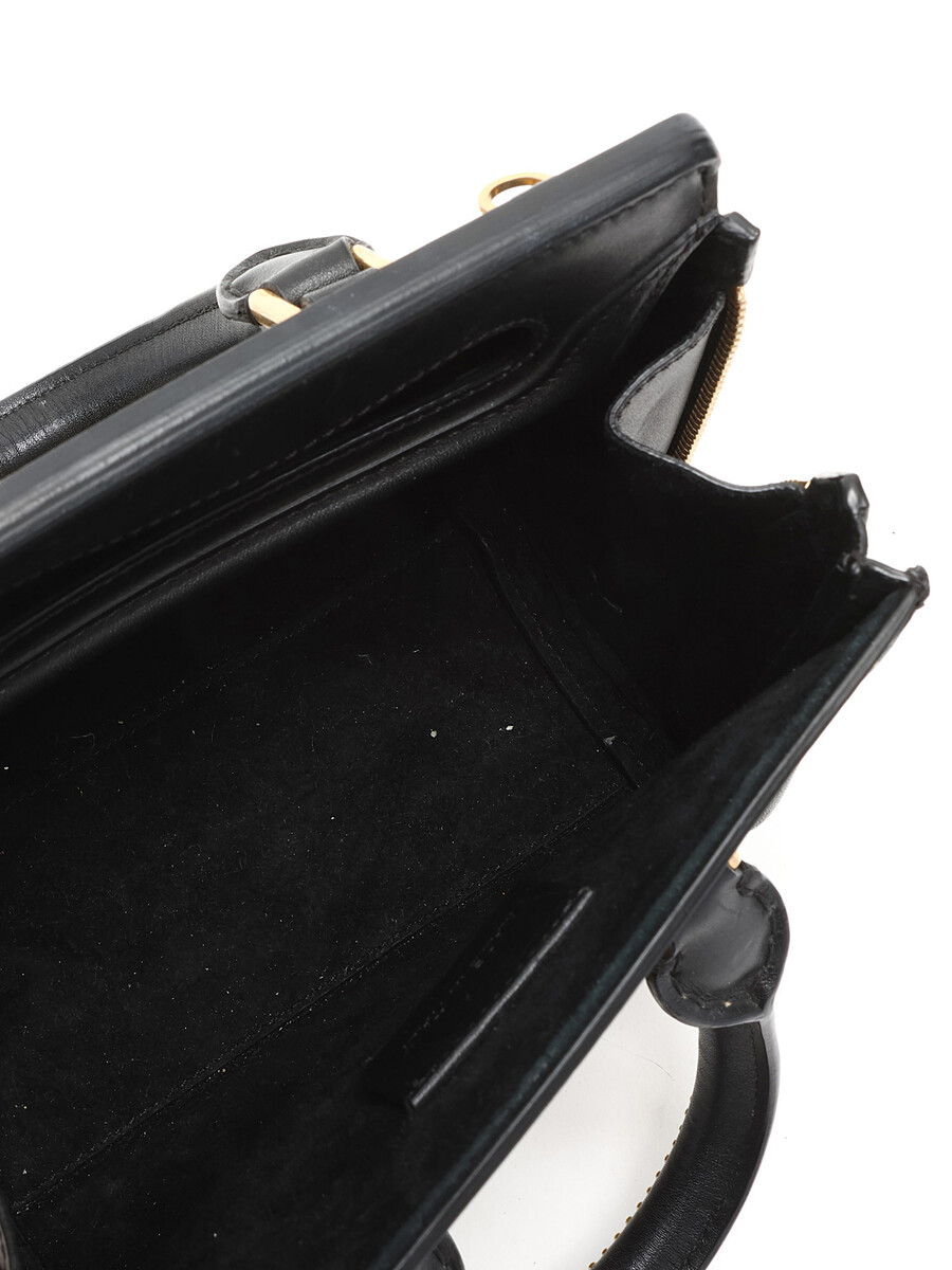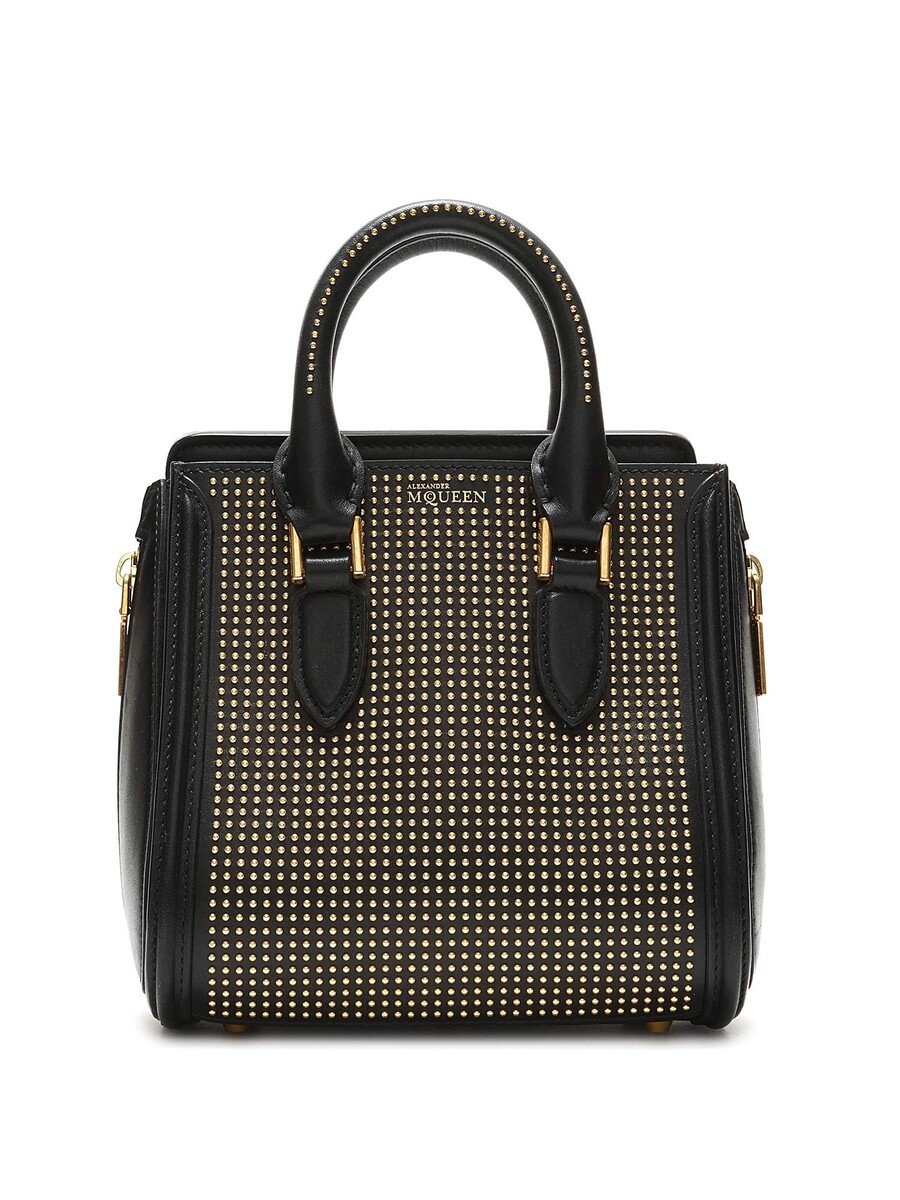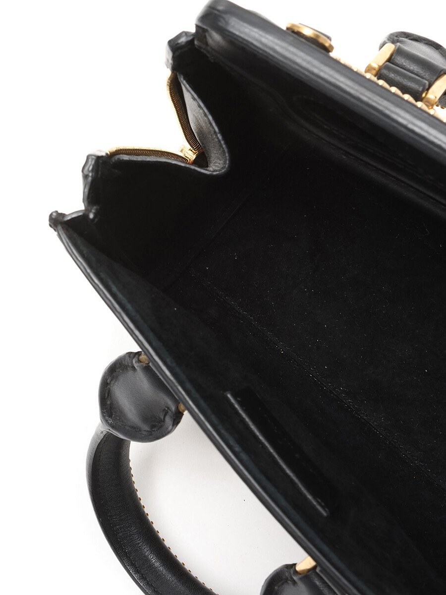 Mini sac en cuir noir avec clous dorés. Ganses supérieures et quincaillerie dorée.