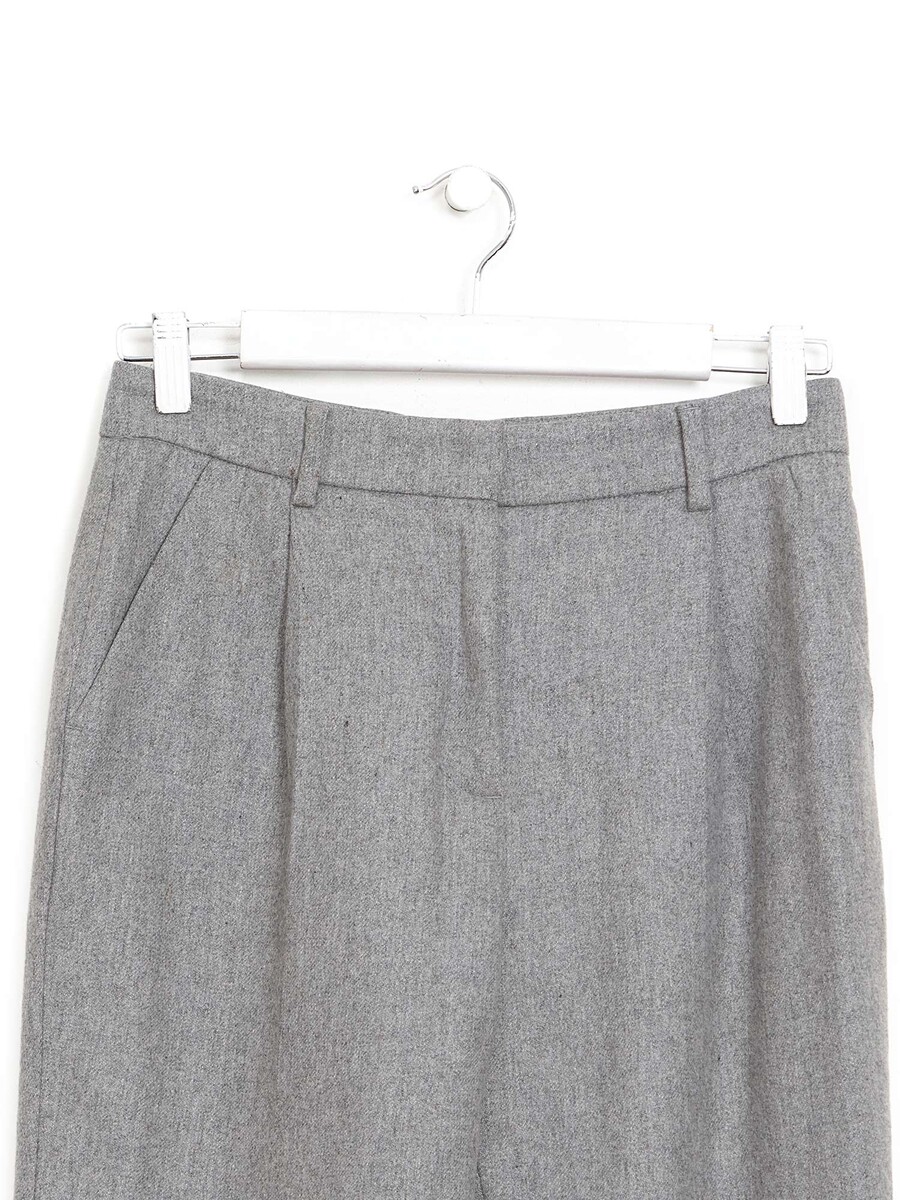 Pantalon à jambe étroite en gris. Fermeture avant à glissière avec languette. Poches passepoilées à l'arrière. Confectionné dans un mélange de laine doux.