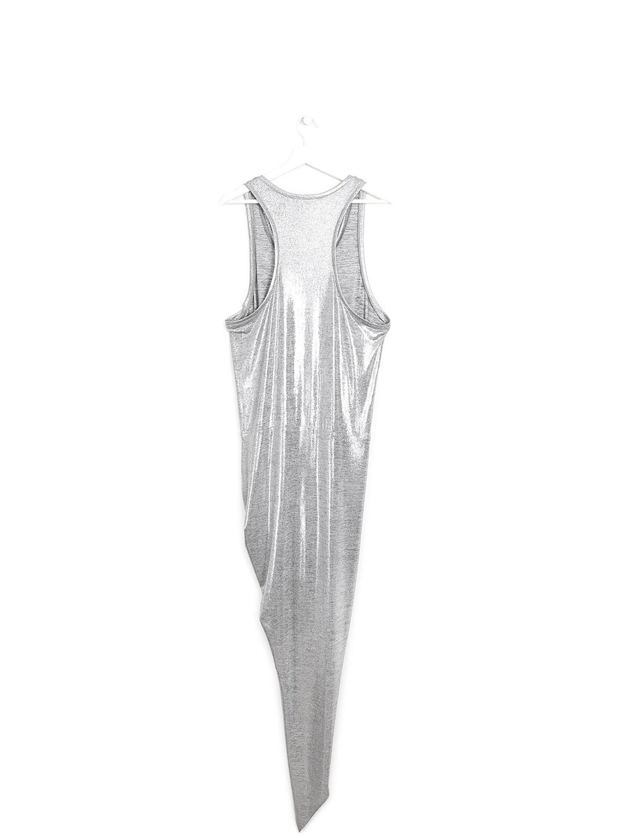 Robe sans manches avec effet métallique en gris. Encolure dégagée avec détails froncés. Sans fermeture.