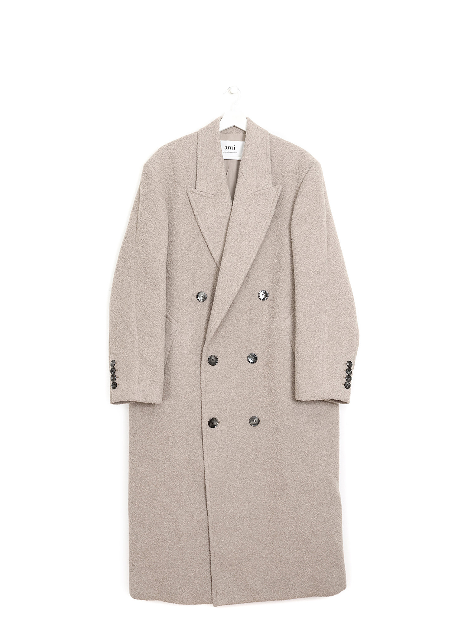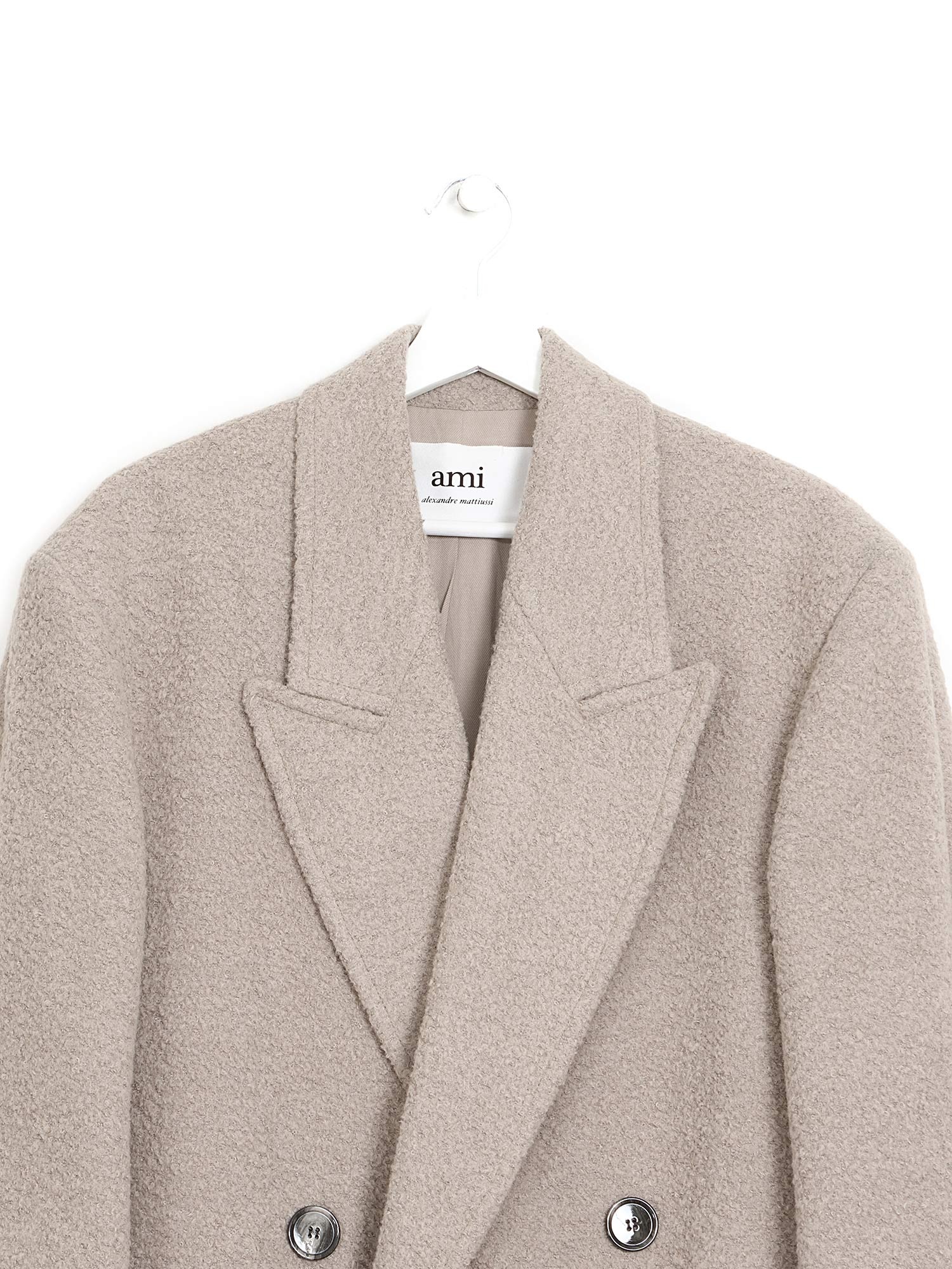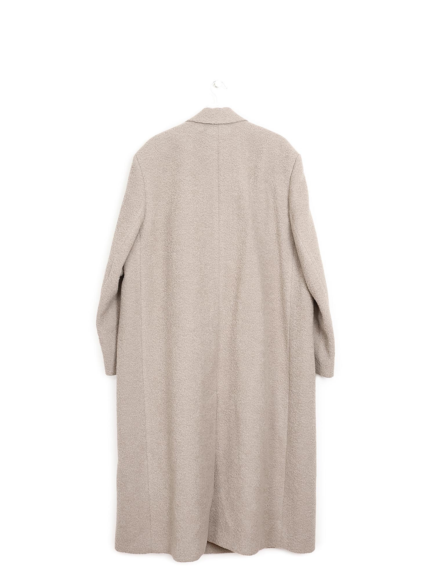 Manteau en laine à double boutonnage beige. Fermeture à boutons au devant et col à revers. Poches plaquées avec rabats.
