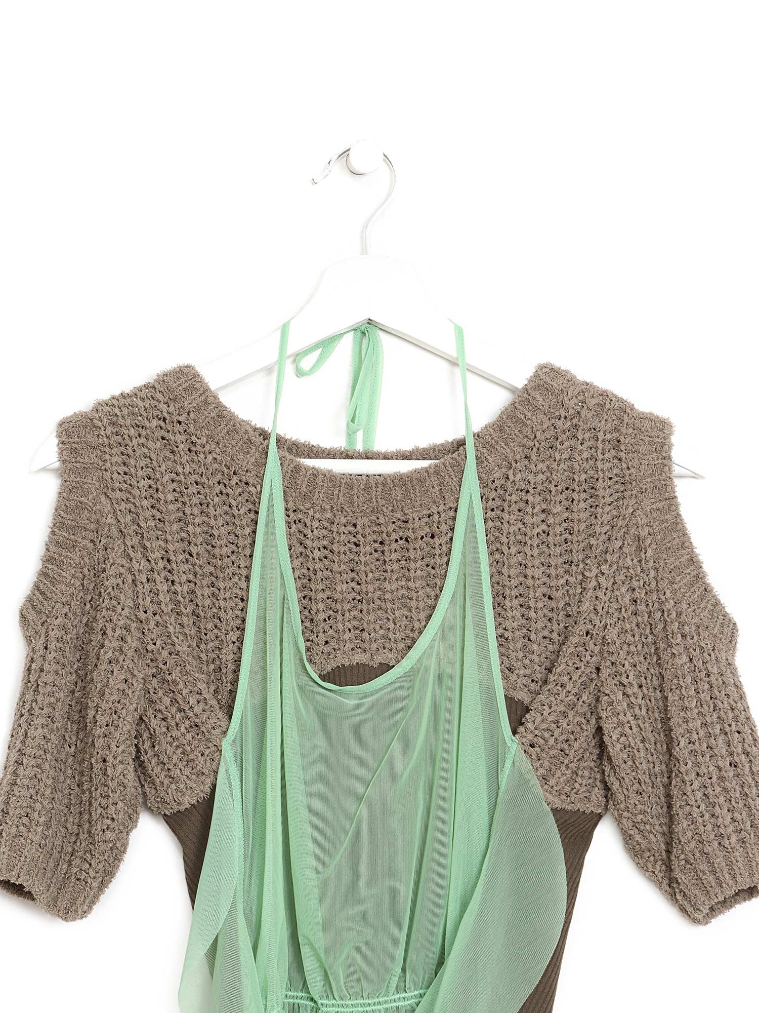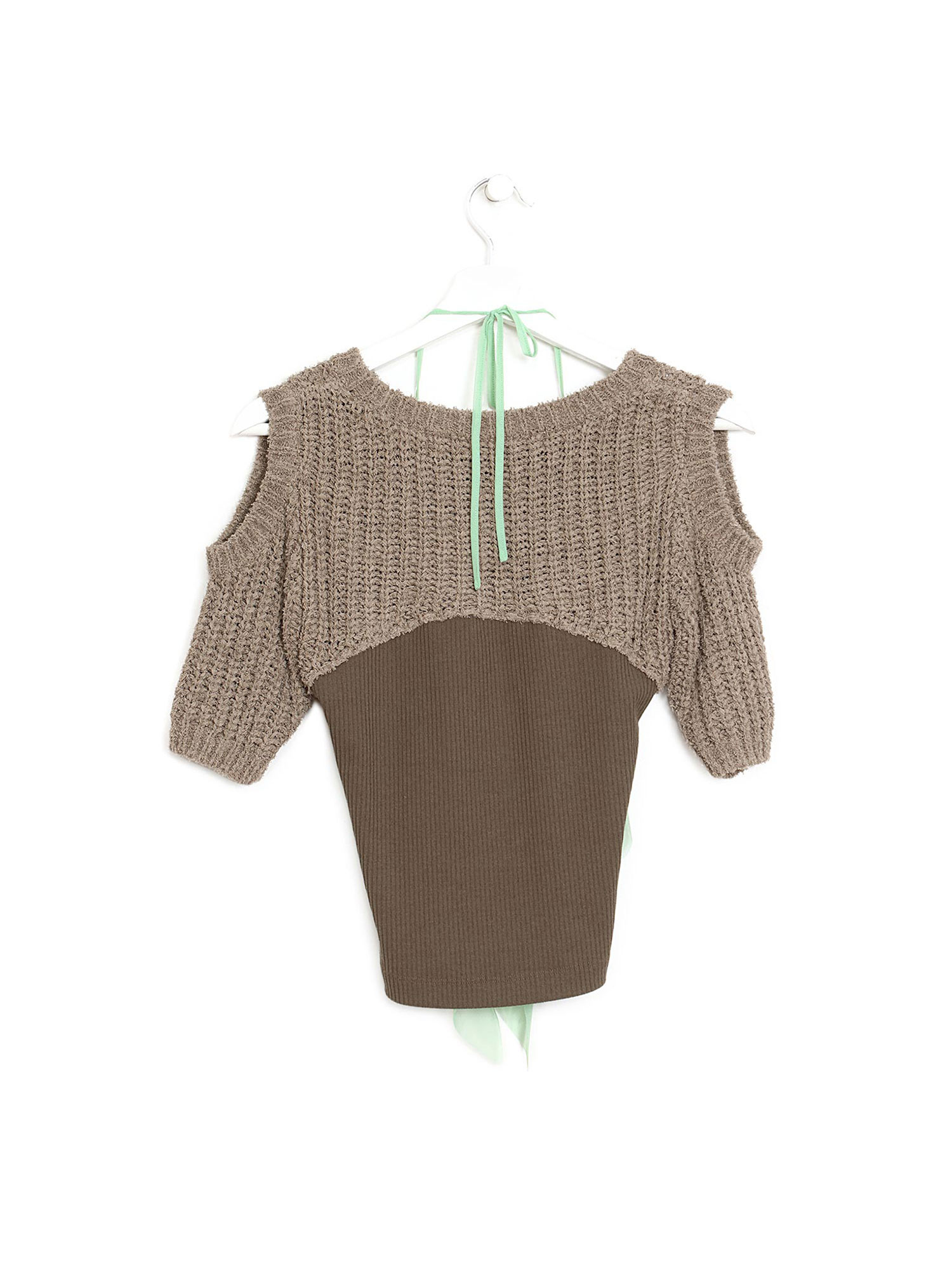Haut en tricot superposé à manches courtes dans les tons de brun et vert. Col rond avec surcol encolure licou. Textures contrastantes.