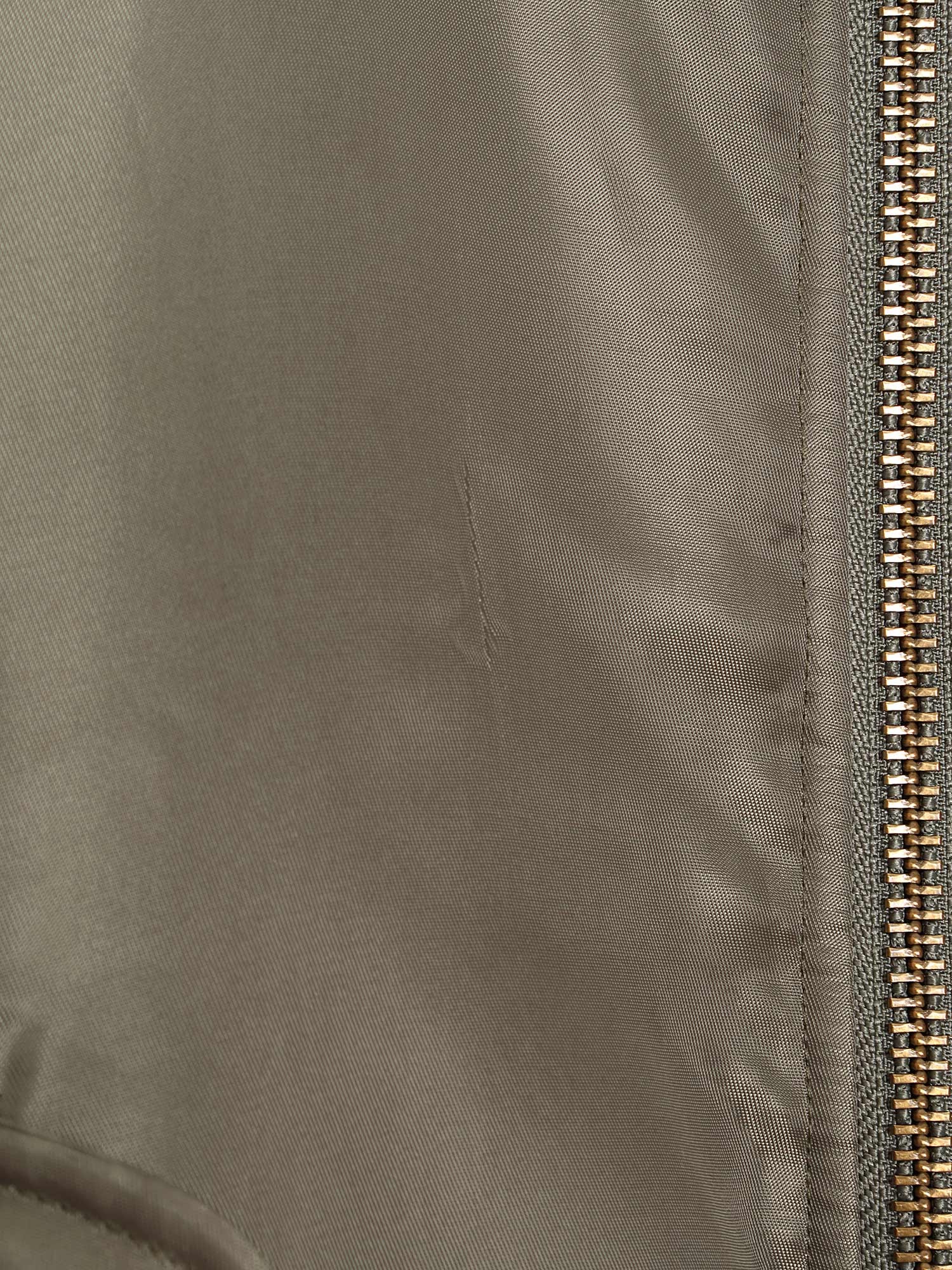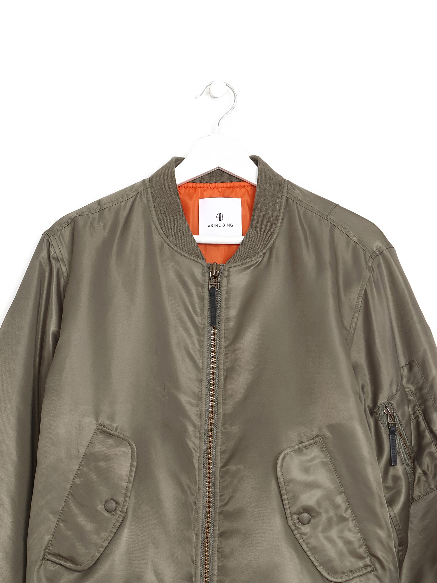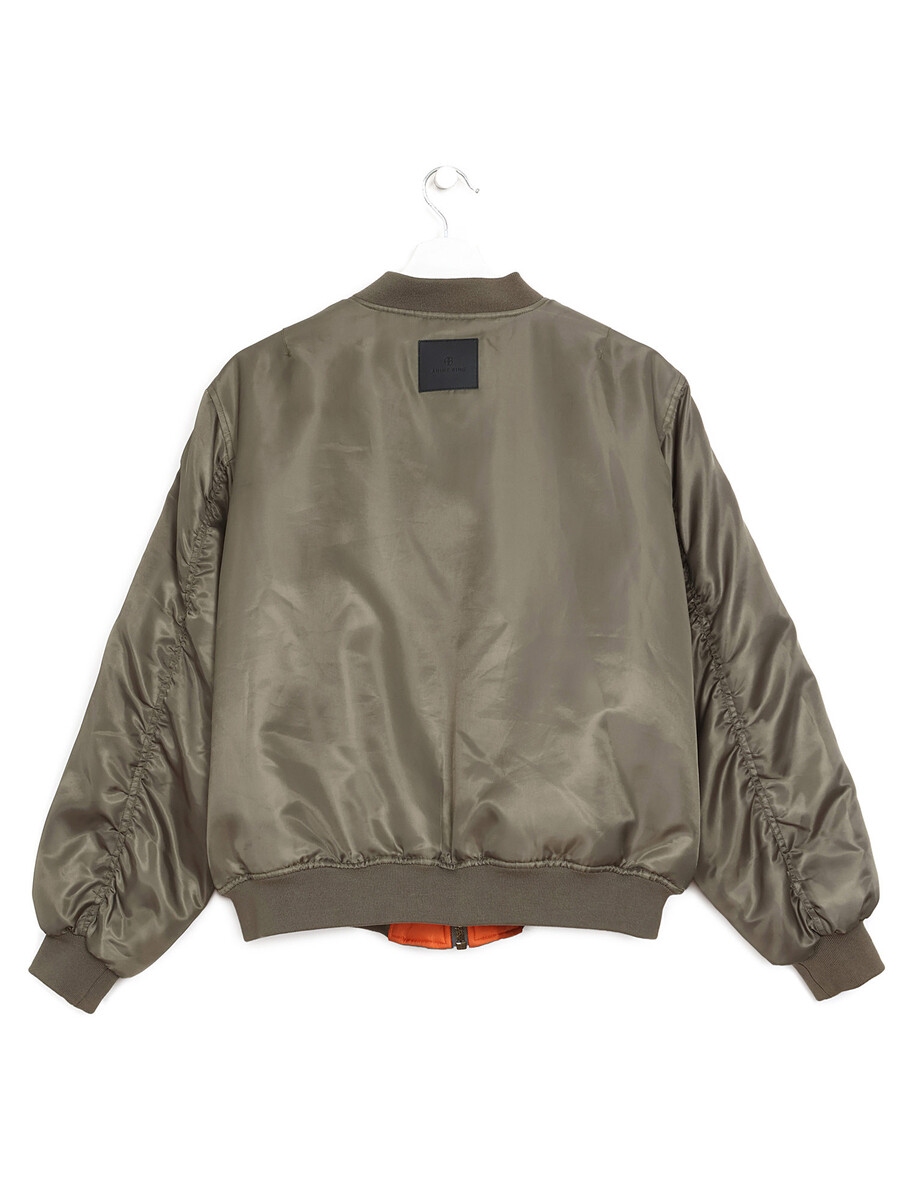 Veste bomber en vert olive à manches longues. Fermeture à glissière et poches latérales. Doublure orange contrastante.