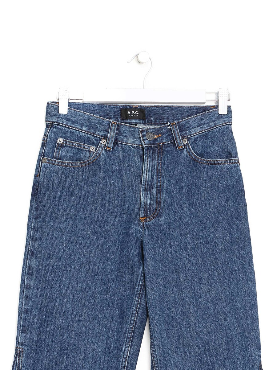 Jeans court à coupe droite en bleu. Taille mi-haute. Braguette à glissière avec bouton. Cinq poches avec poches arrière appliquées et poches avant en biais.