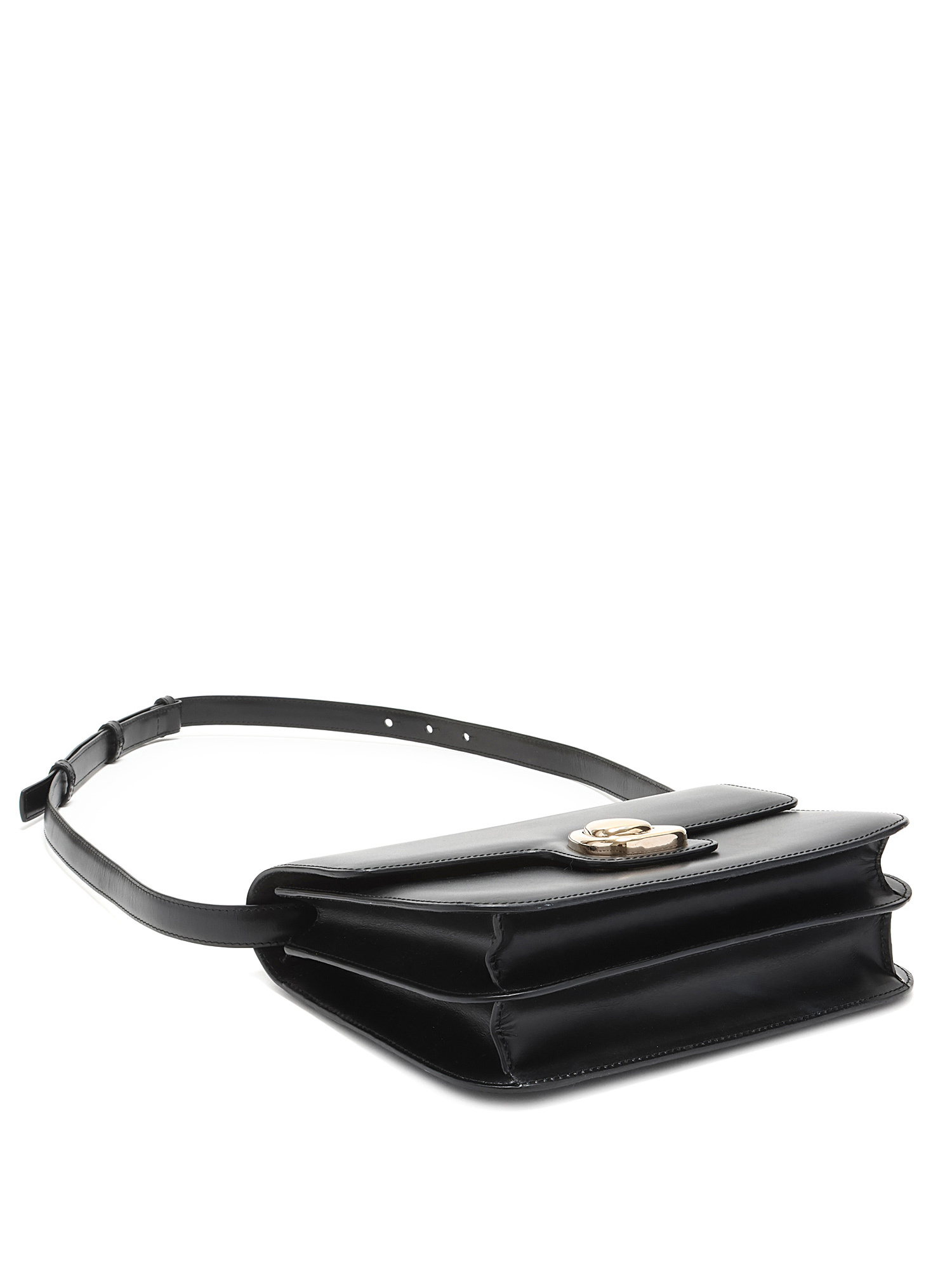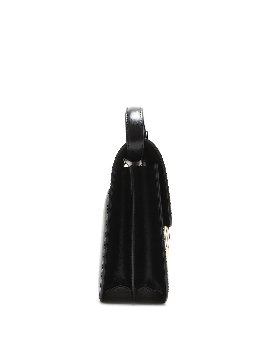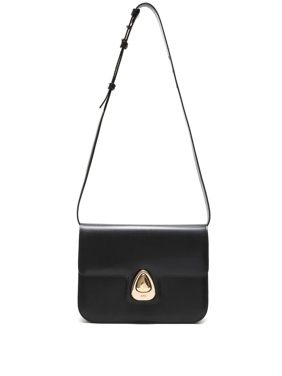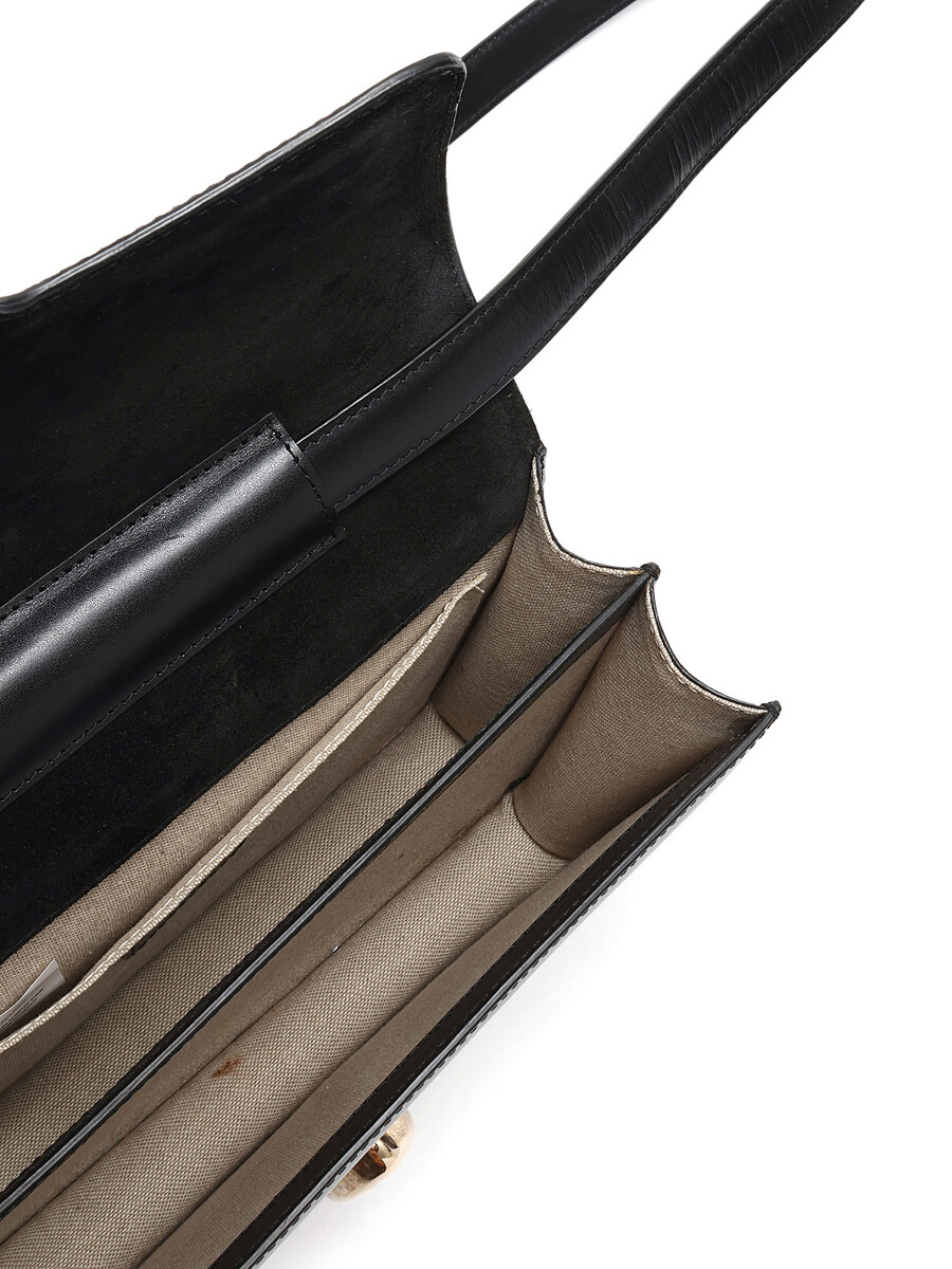 Sac à bandoulière en cuir noir avec quincaillerie argentée. Fermeture à verrouillage par pression. Bandoulière ajustable. Coutures ton sur ton. Intérieur doublé de tissu.