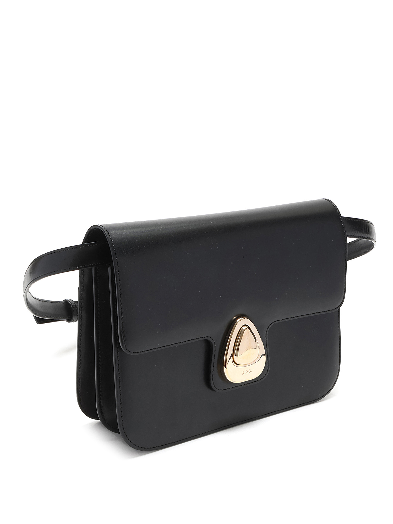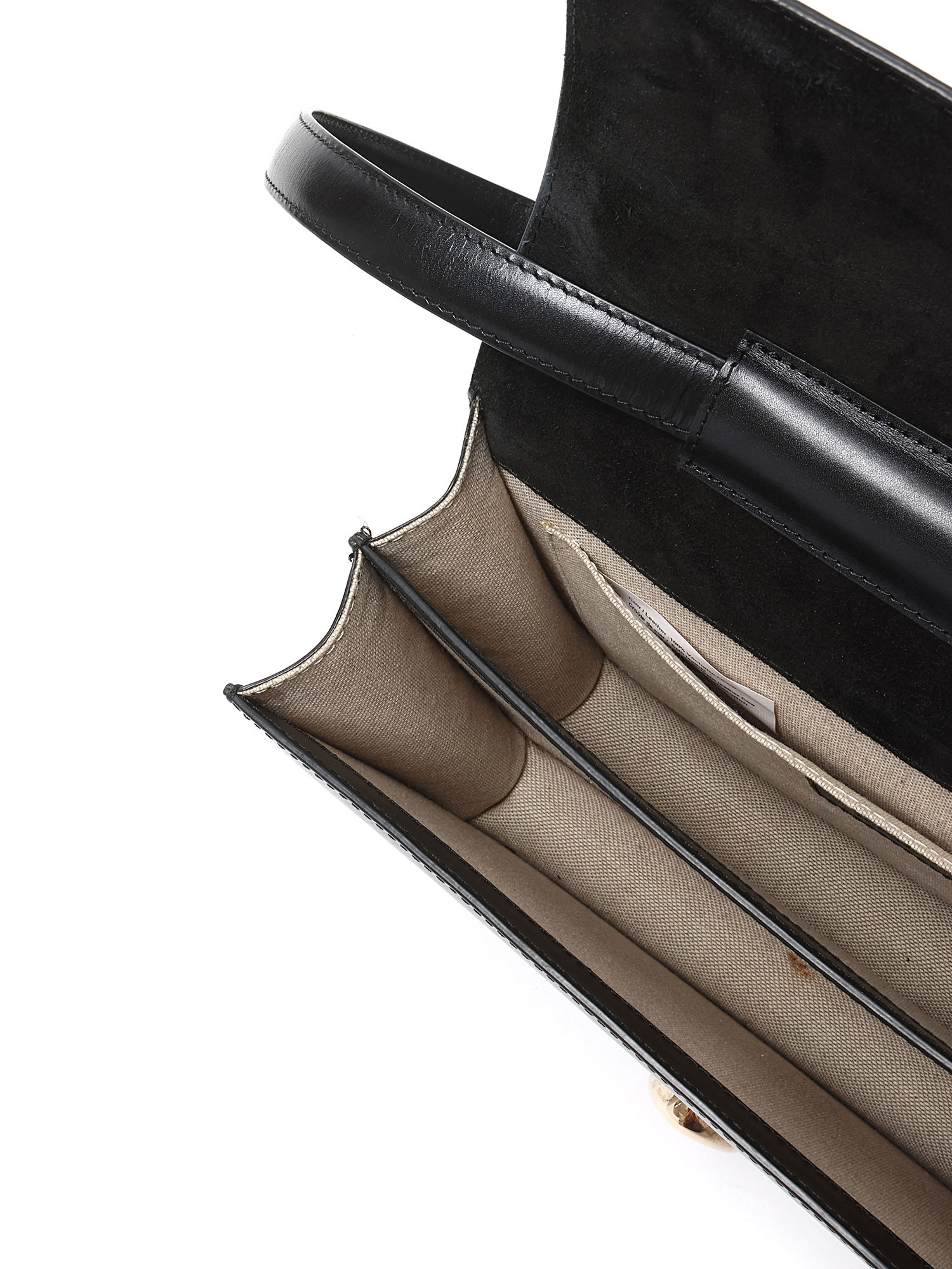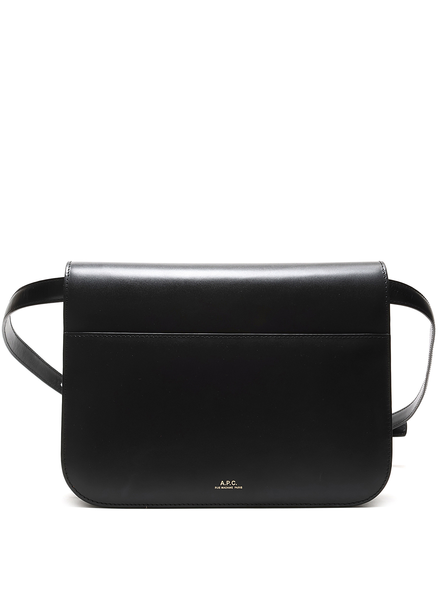 Sac à bandoulière en cuir noir avec quincaillerie argentée. Fermeture à verrouillage par pression. Bandoulière ajustable. Coutures ton sur ton. Intérieur doublé de tissu.
