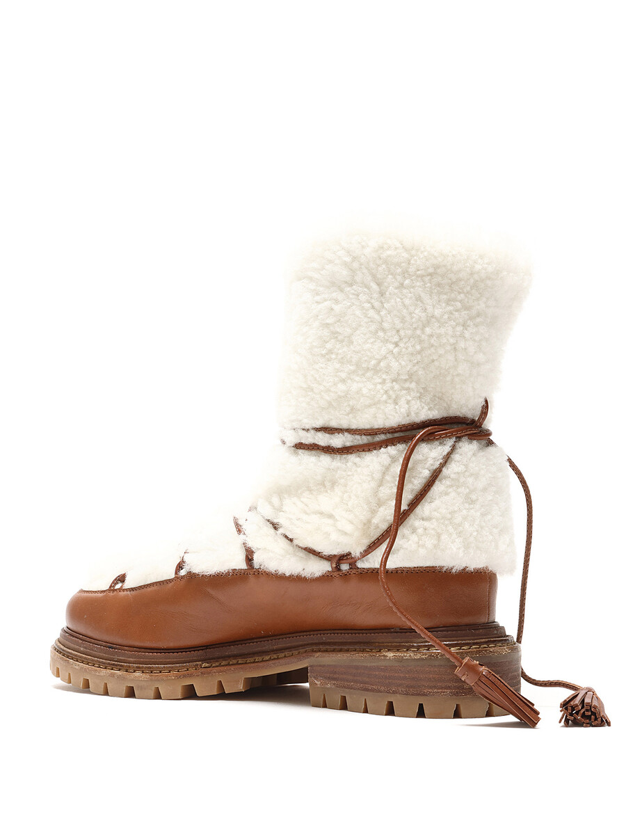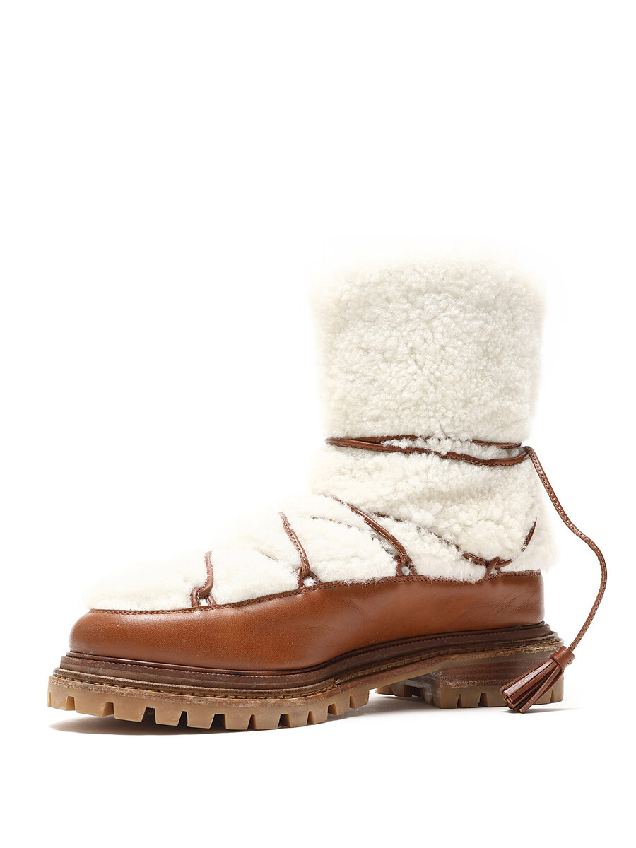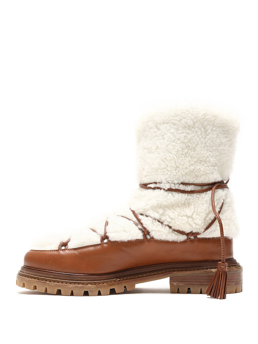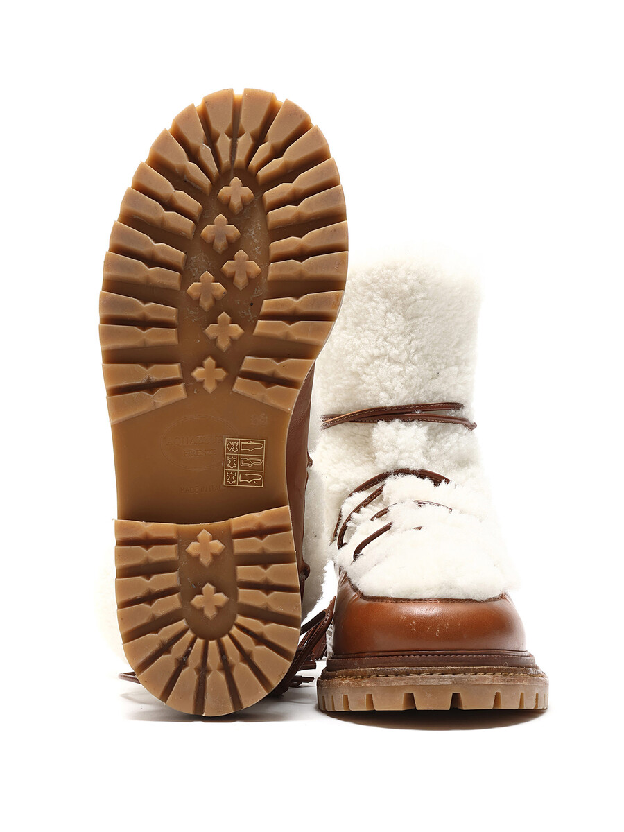 Bottes en cuir et peau retournée en brun et blanc. Fermeture à lacets. Bout rond. Semelle en caoutchouc crantée pour une meilleure adhérence.