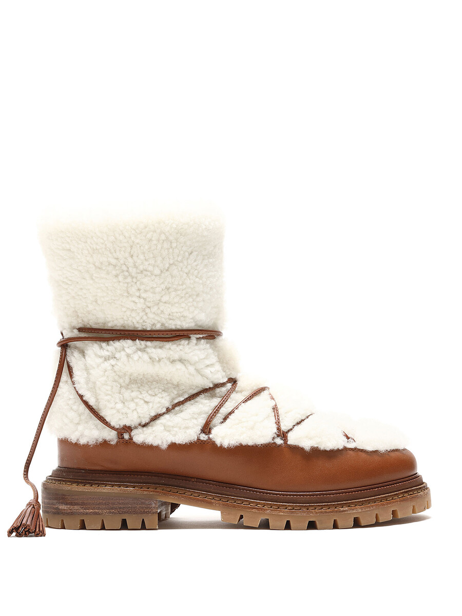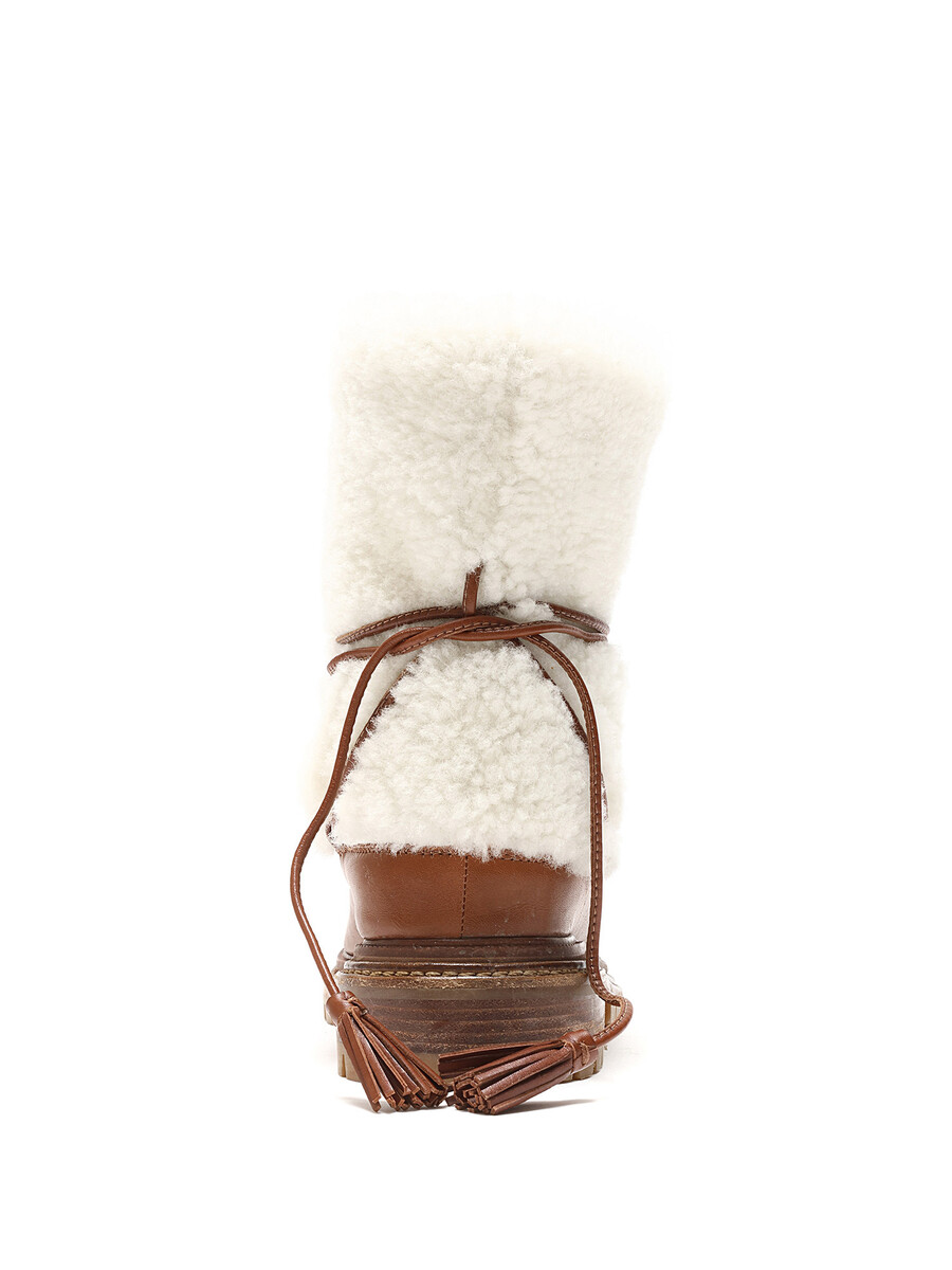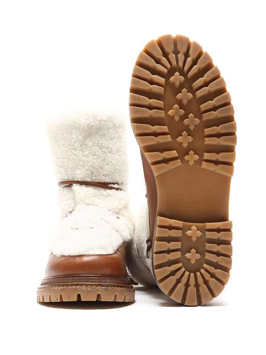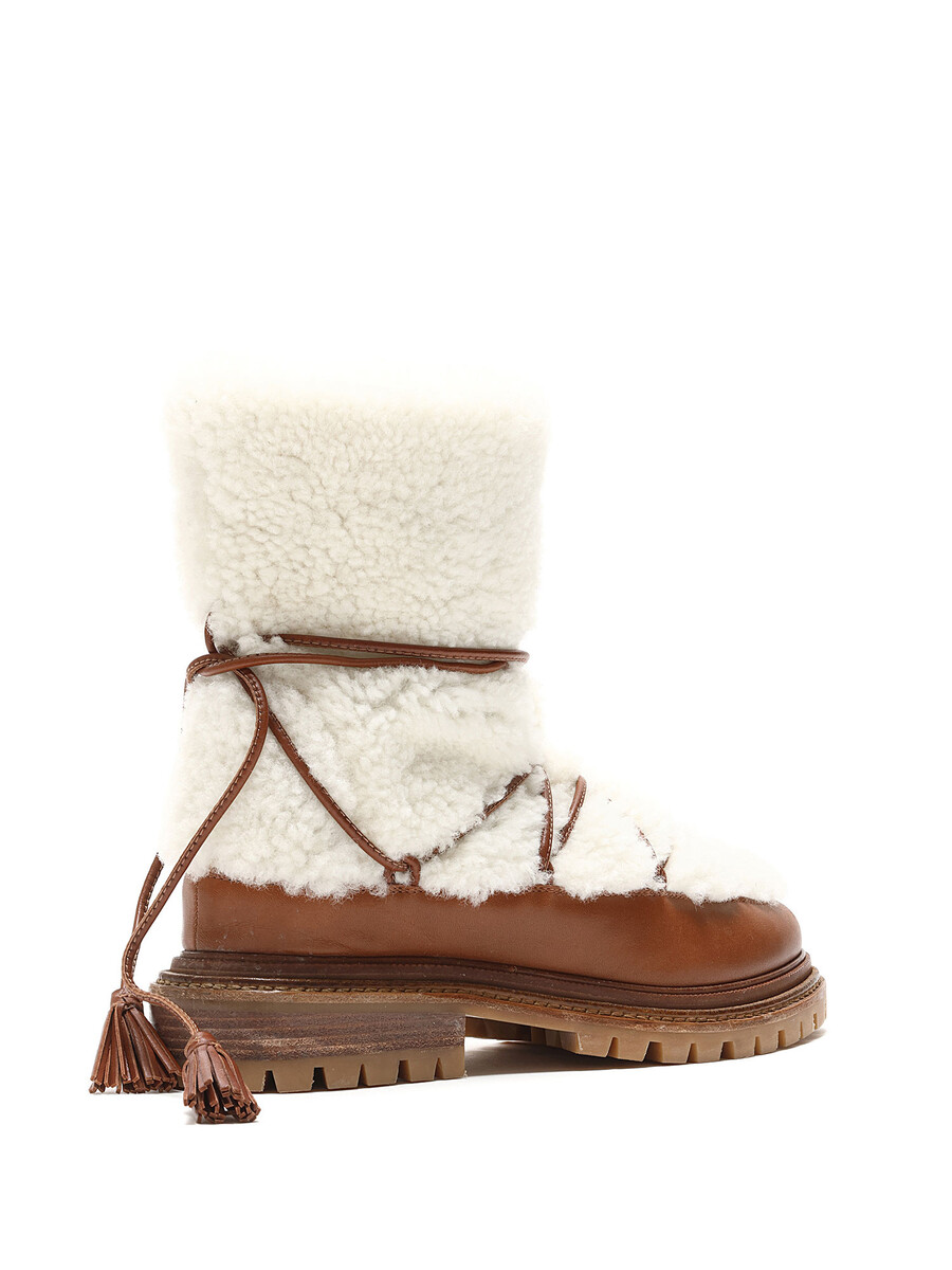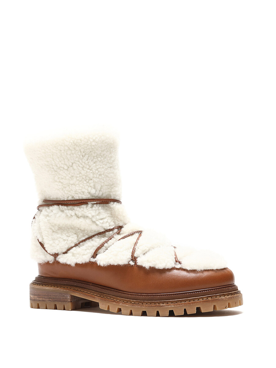 Bottes en cuir et peau retournée en brun et blanc. Fermeture à lacets. Bout rond. Semelle en caoutchouc crantée pour une meilleure adhérence.