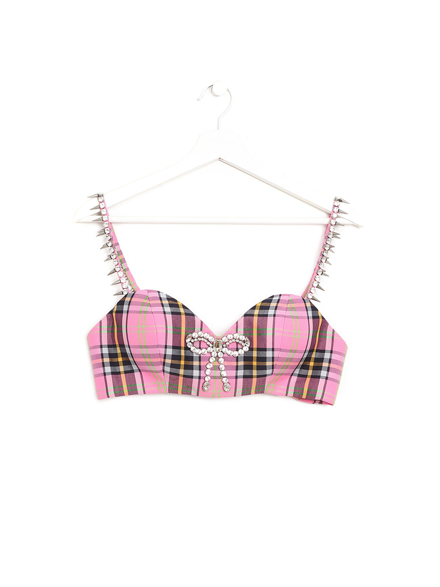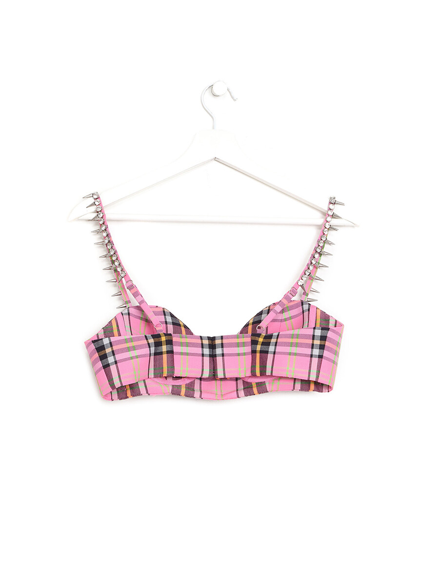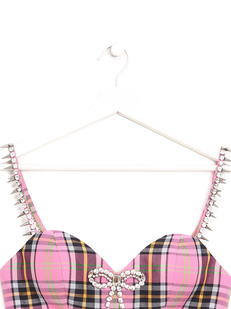 Bustier sans manches à motif carreaux dans les tons de rose, noir, orange et vert. Fermeture à glissière. Bretelles ornées de strass et clous.