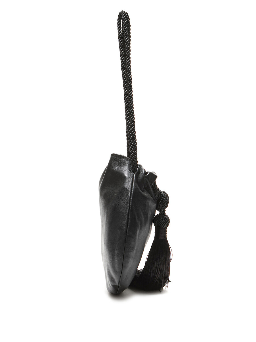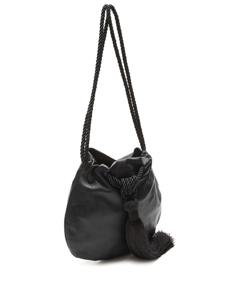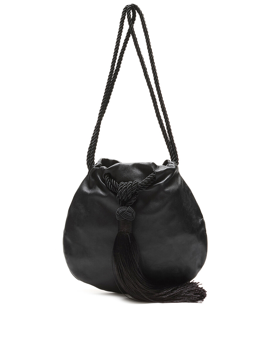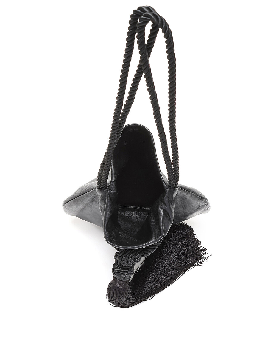 Sac à bandoulière en cuir noir minimaliste avec cordon de serrage, détails de pompons et bandoulières tressées. Coutures ton sur ton.
