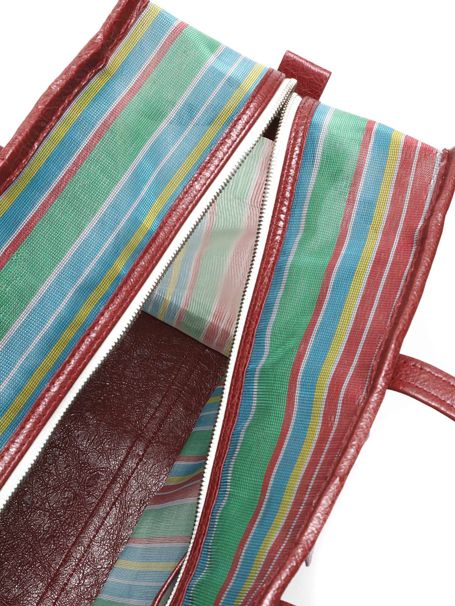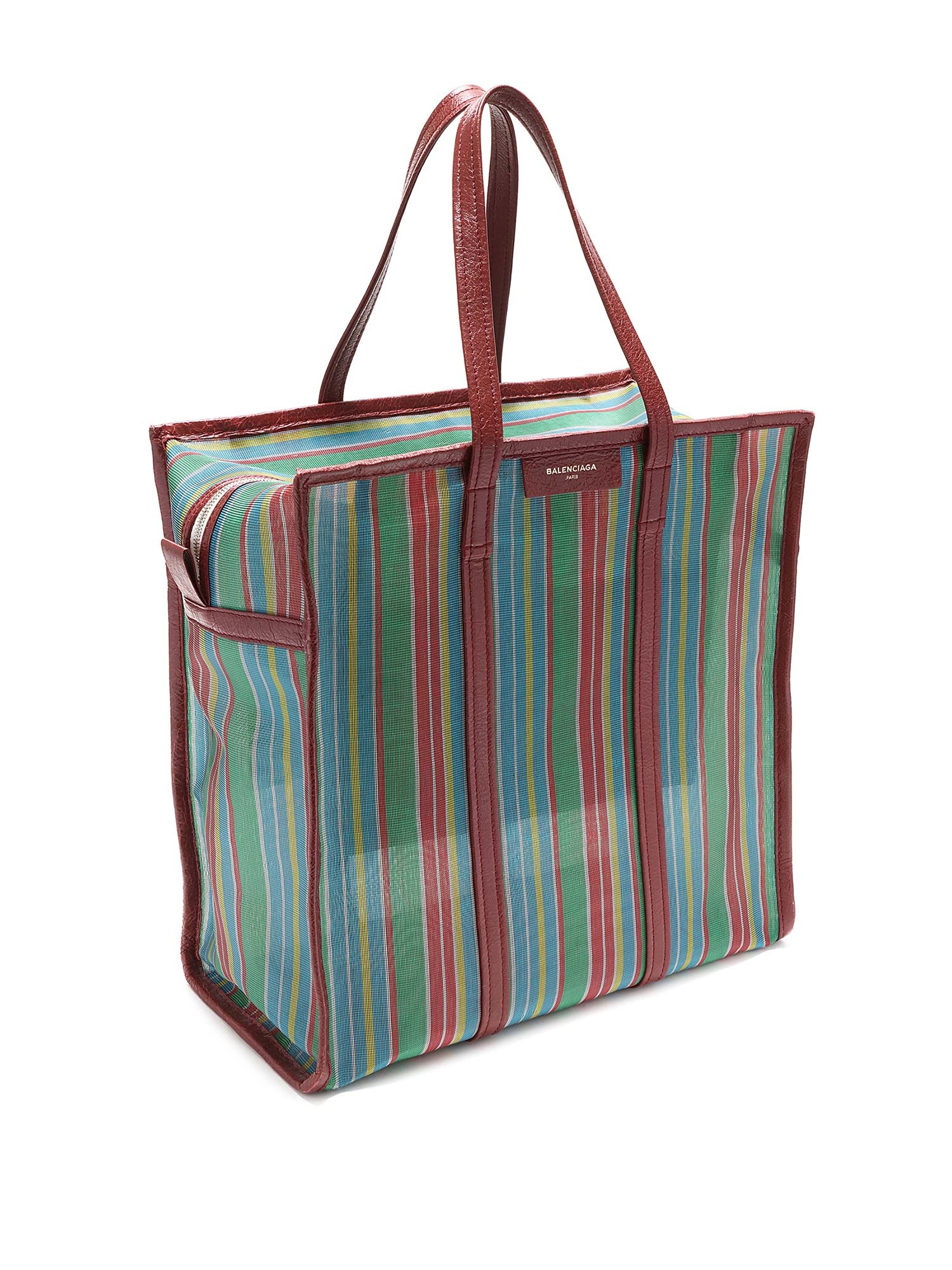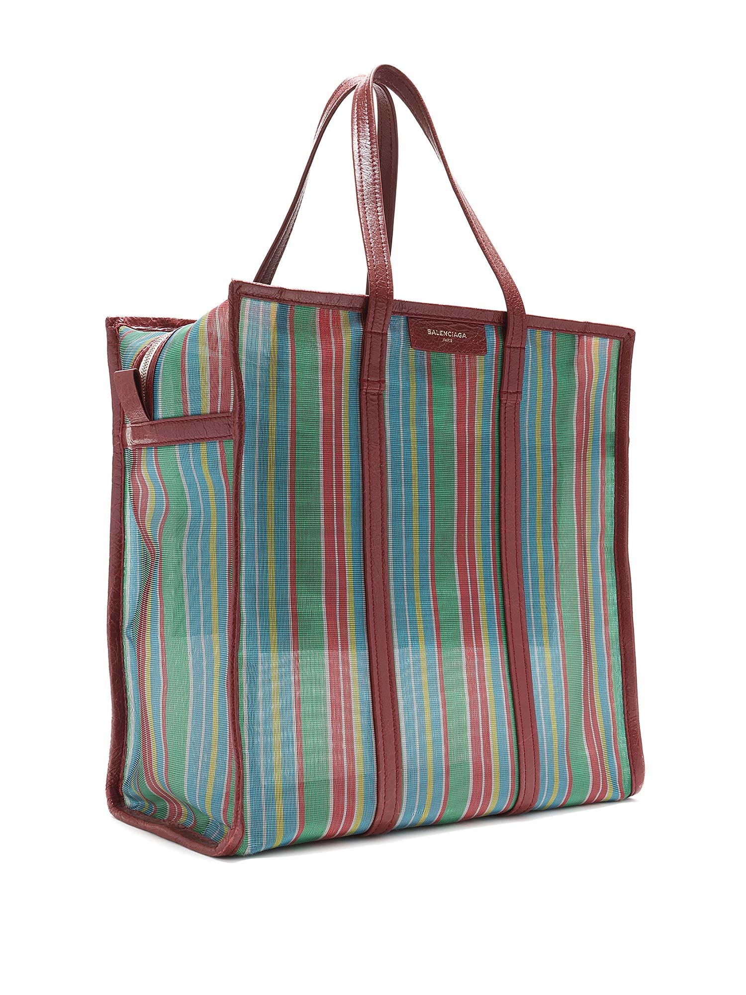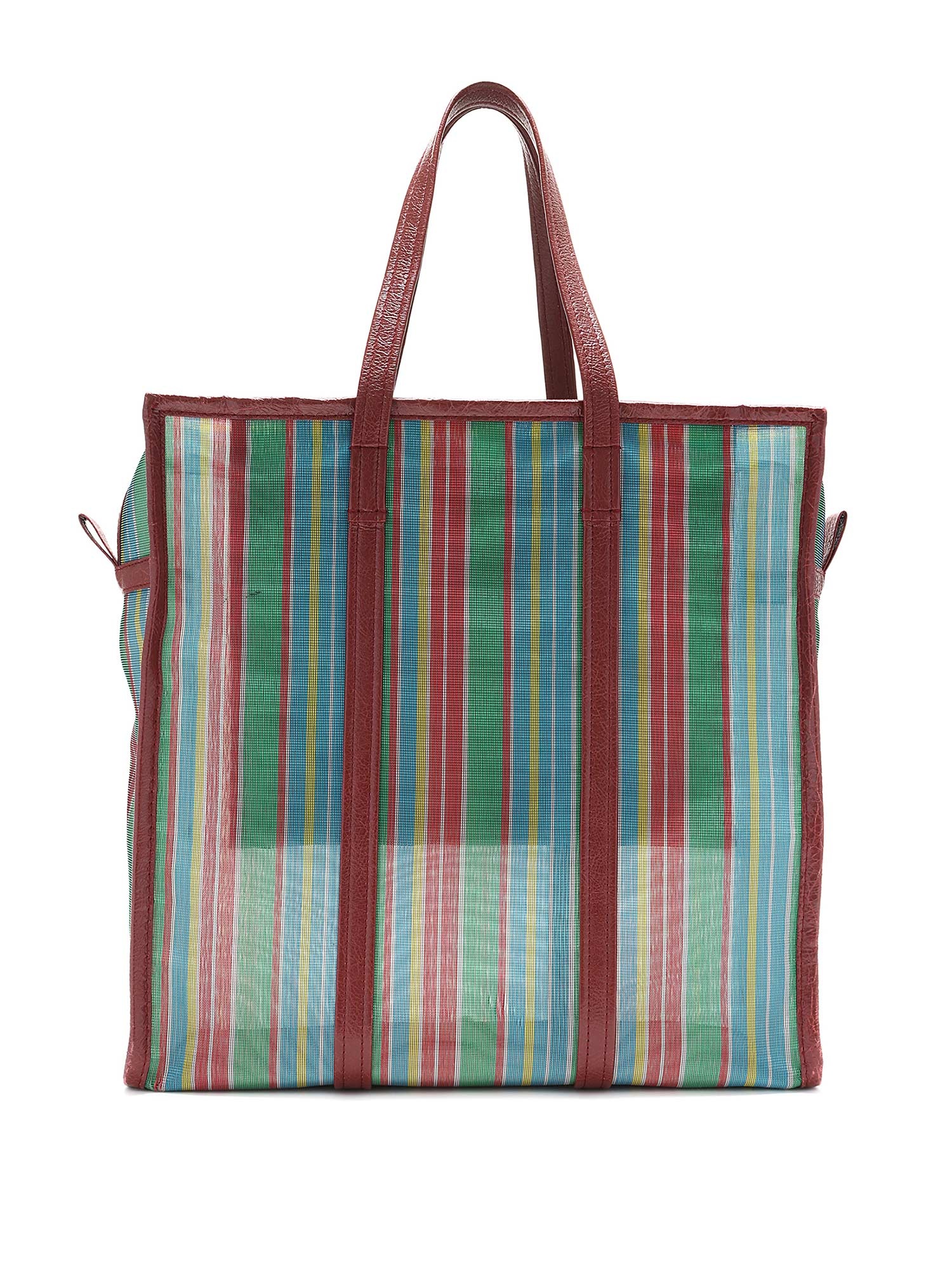 Sac cabas en filet à rayures multicolores. Fermeture à glissière. Deux anses supérieures. Garnitures en cuir.