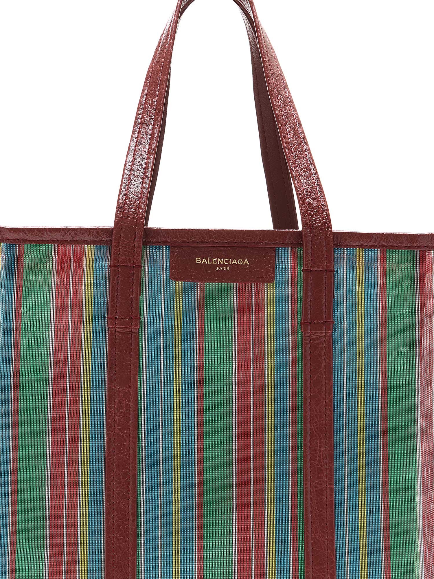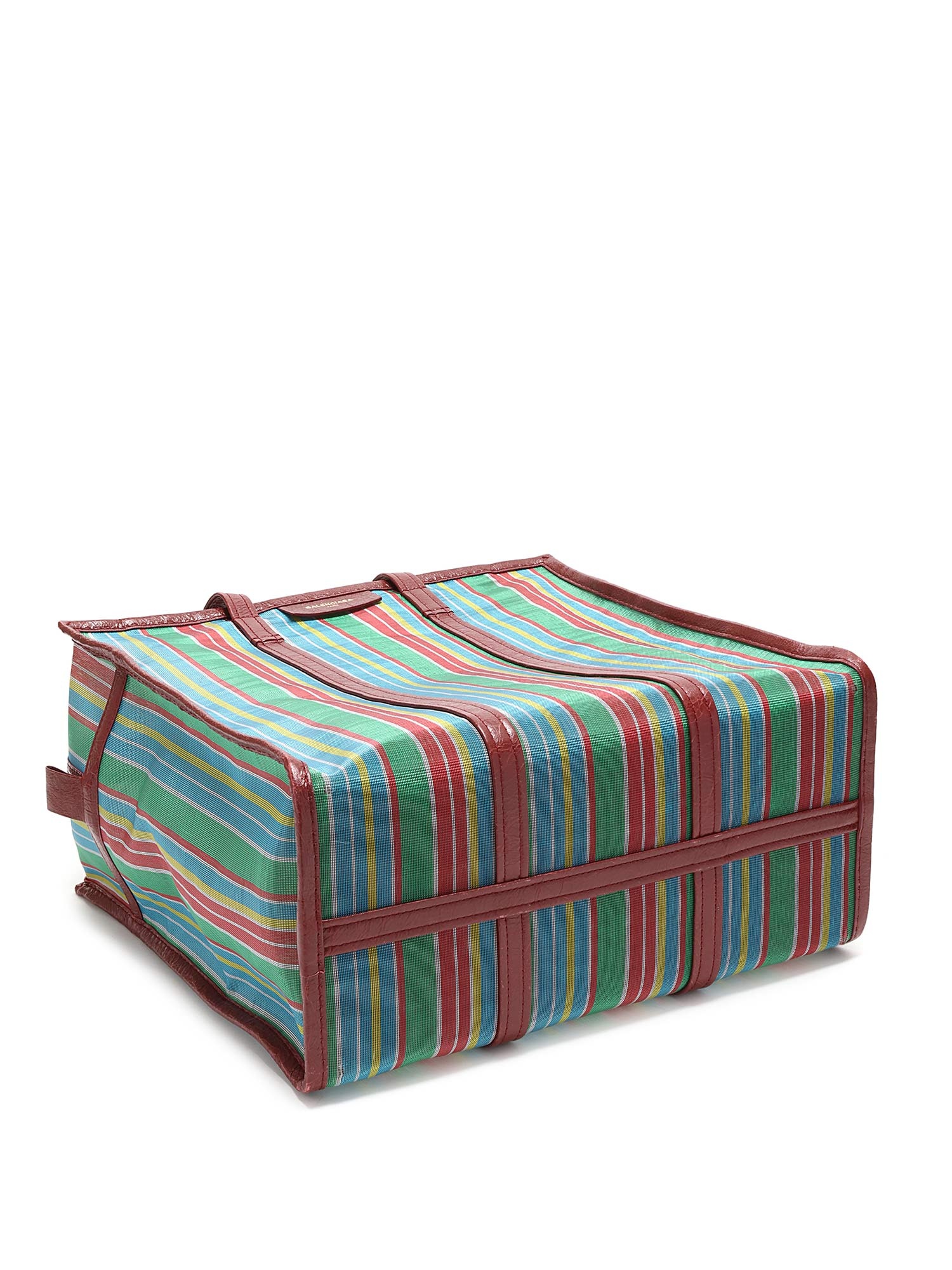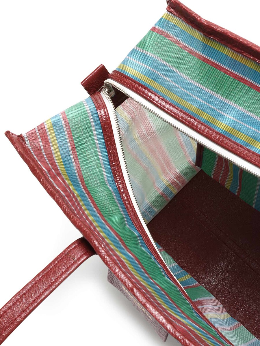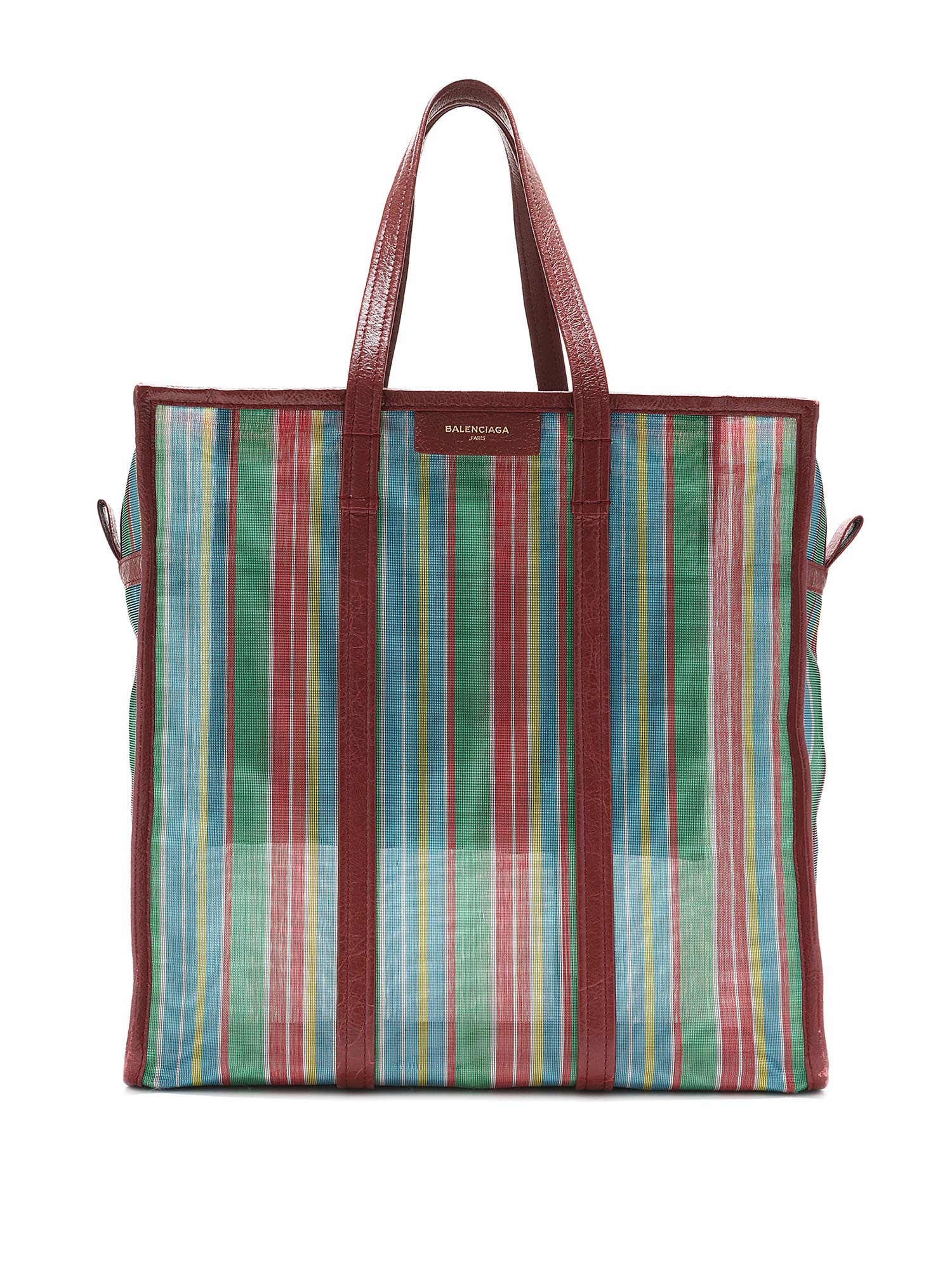 Sac cabas en filet à rayures multicolores. Fermeture à glissière. Deux anses supérieures. Garnitures en cuir.