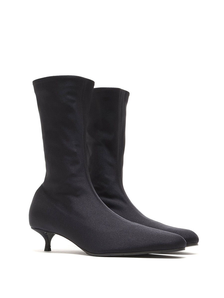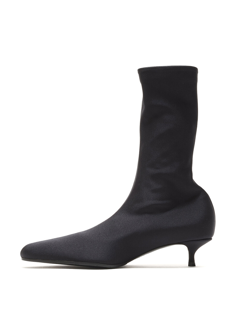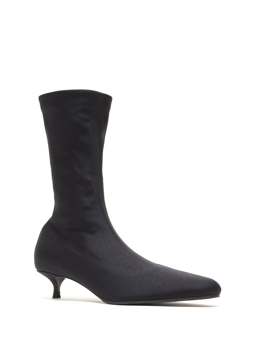 Bottes chaussettes en tissu technique noir. Style à enfiler avec bout pointu. Semelle en caoutchouc pour une adhérence améliorée. Design élégant et épuré.
