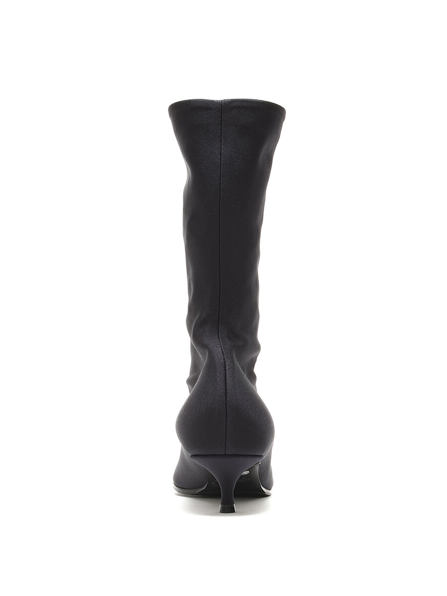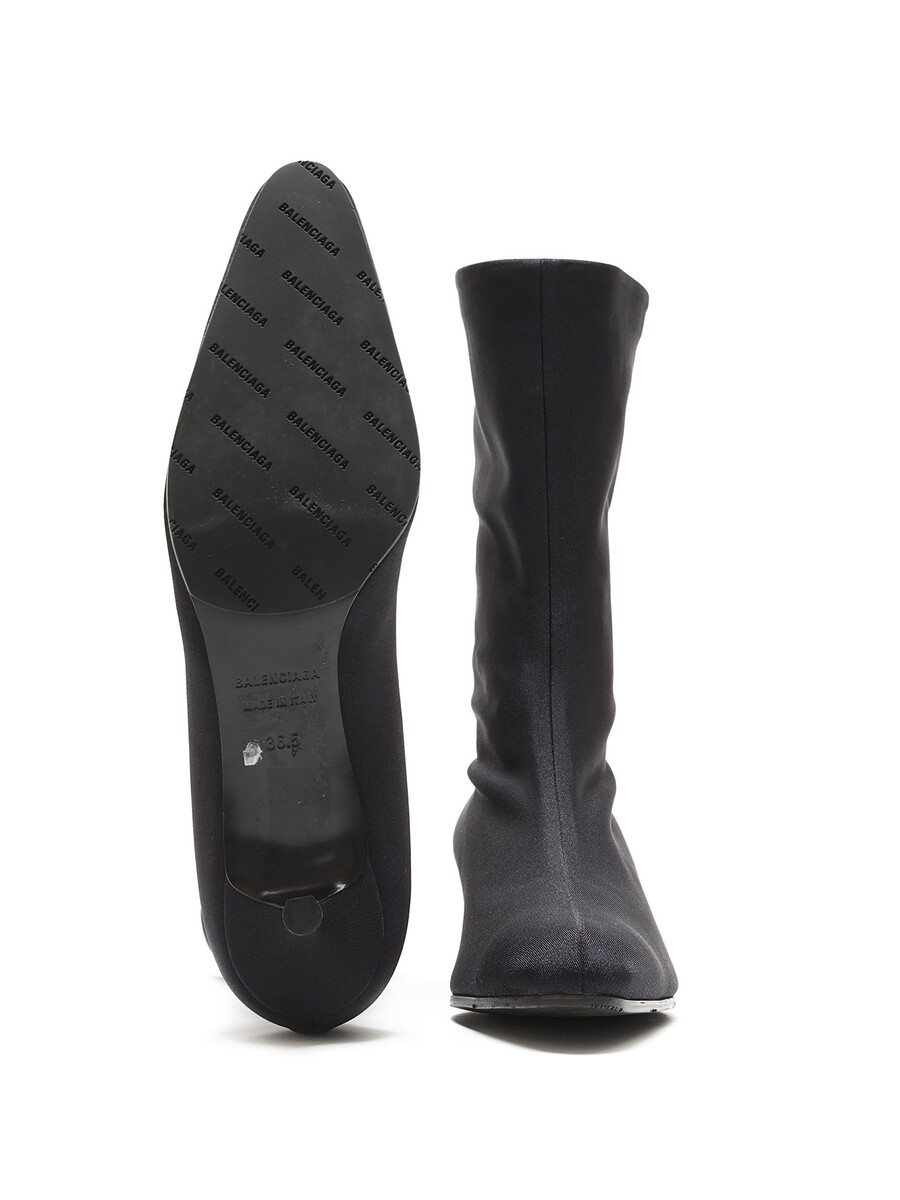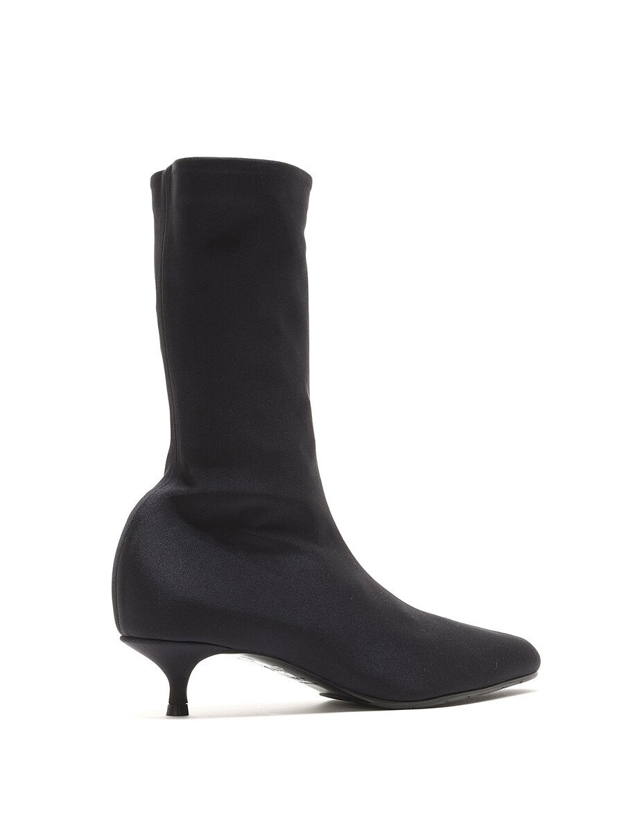 Bottes chaussettes en tissu technique noir. Style à enfiler avec bout pointu. Semelle en caoutchouc pour une adhérence améliorée. Design élégant et épuré.