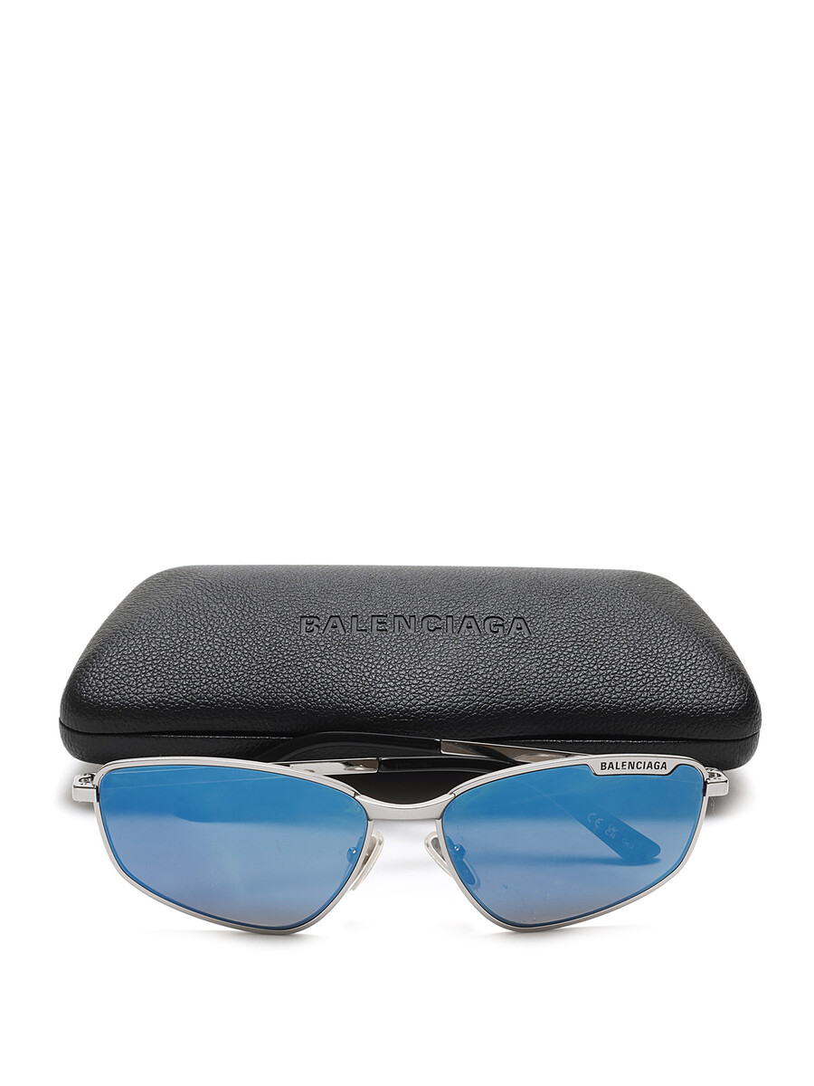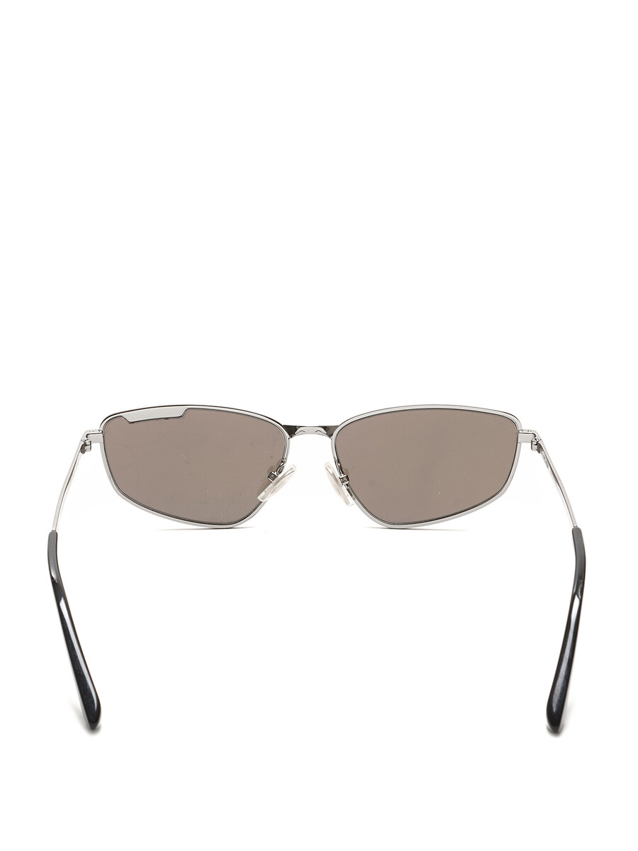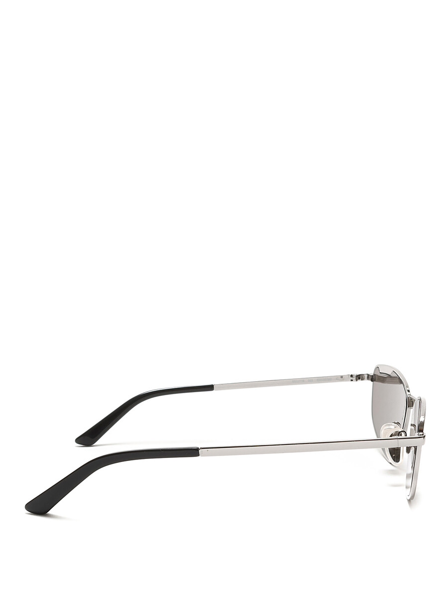 Lunettes de soleil rectangulaires en métal argenté avec verres gris. Avec un étui de protection.