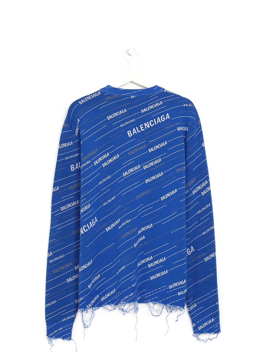Chandail à rayures avec logo dans les tons de blanc, gris et bleu à effet affligé. Col rond.