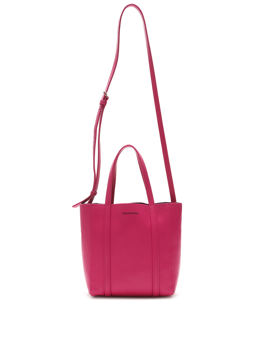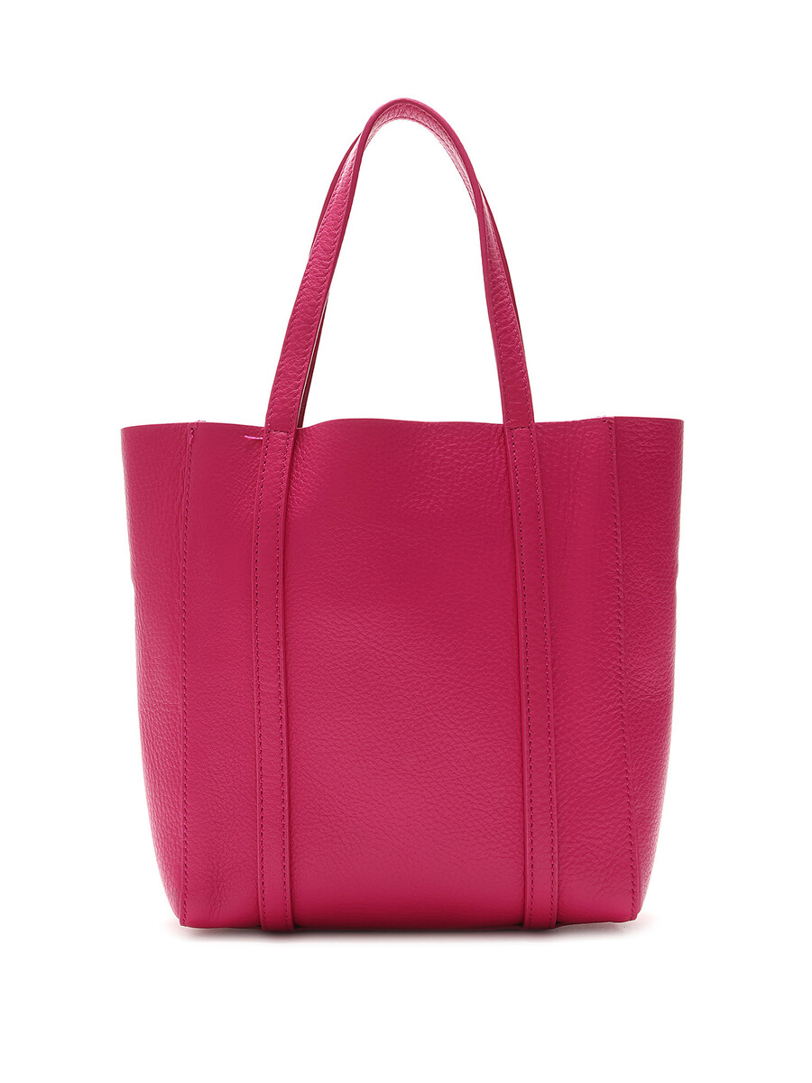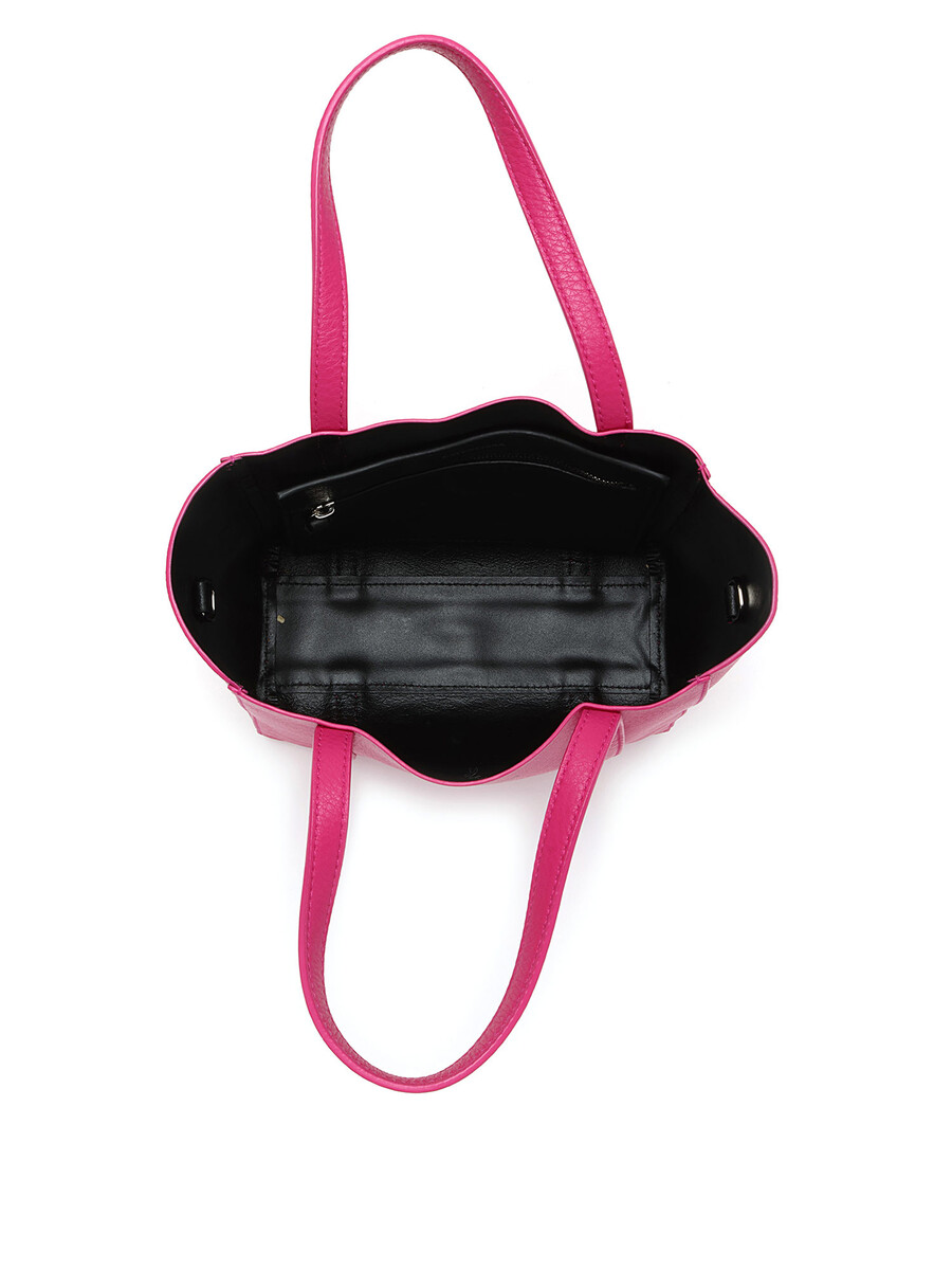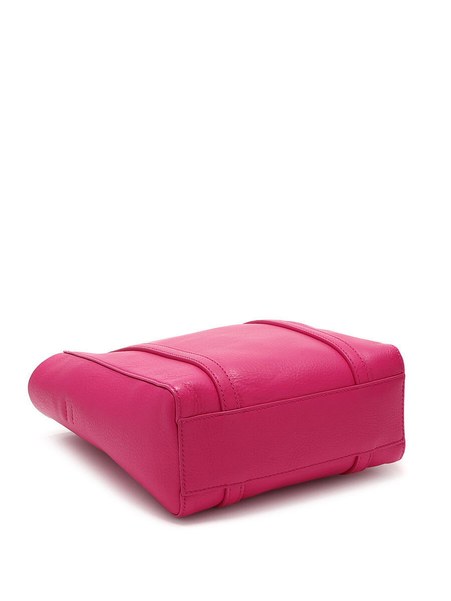 Mini sac à main en cuir fuchsia éclatant. Haut ouvert avec fermeture à cordon. Poignées doubles et bandoulière amovible.