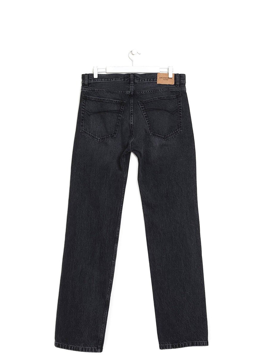 Jean coupe droite en finition noire délavée. Fermeture à bouton frontal avec bouton supérieur. Taille mi-haute. Style classique à cinq poches.