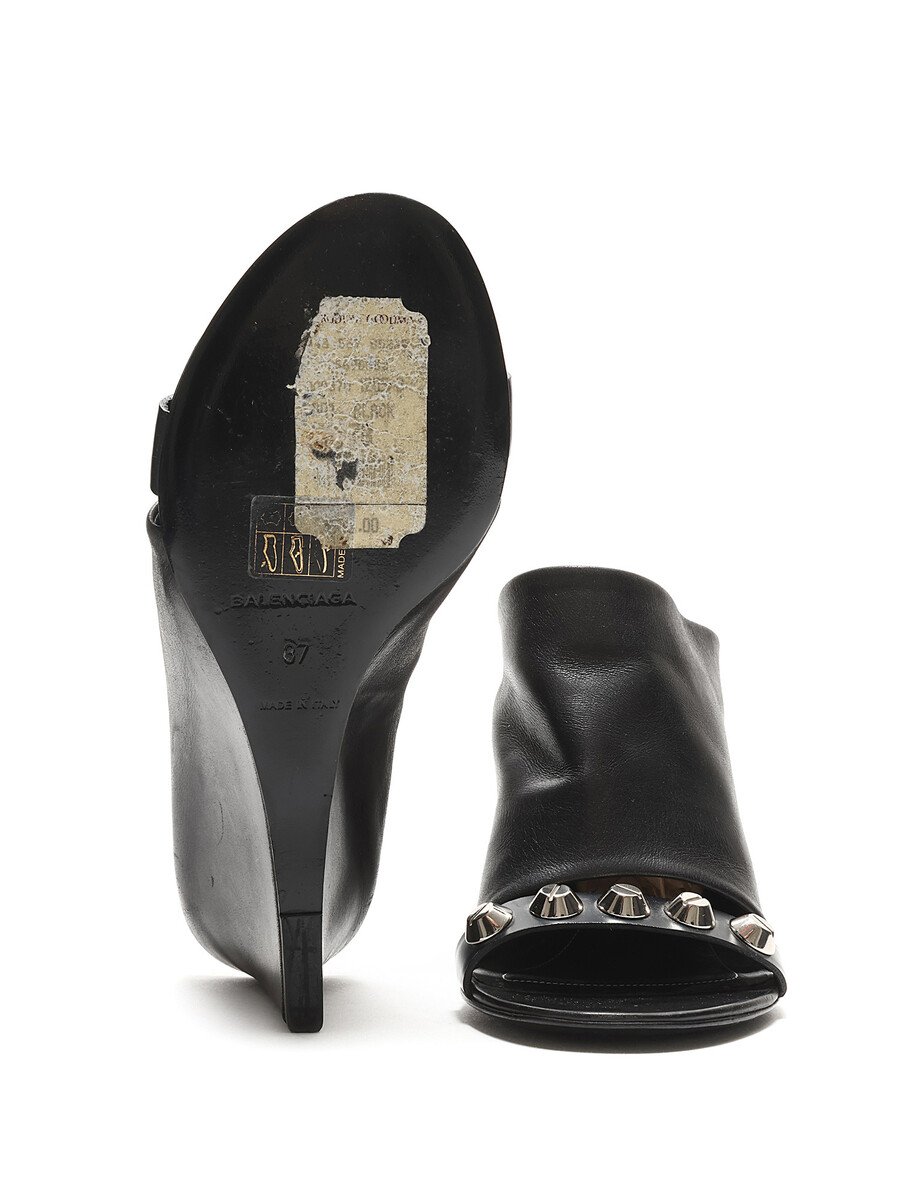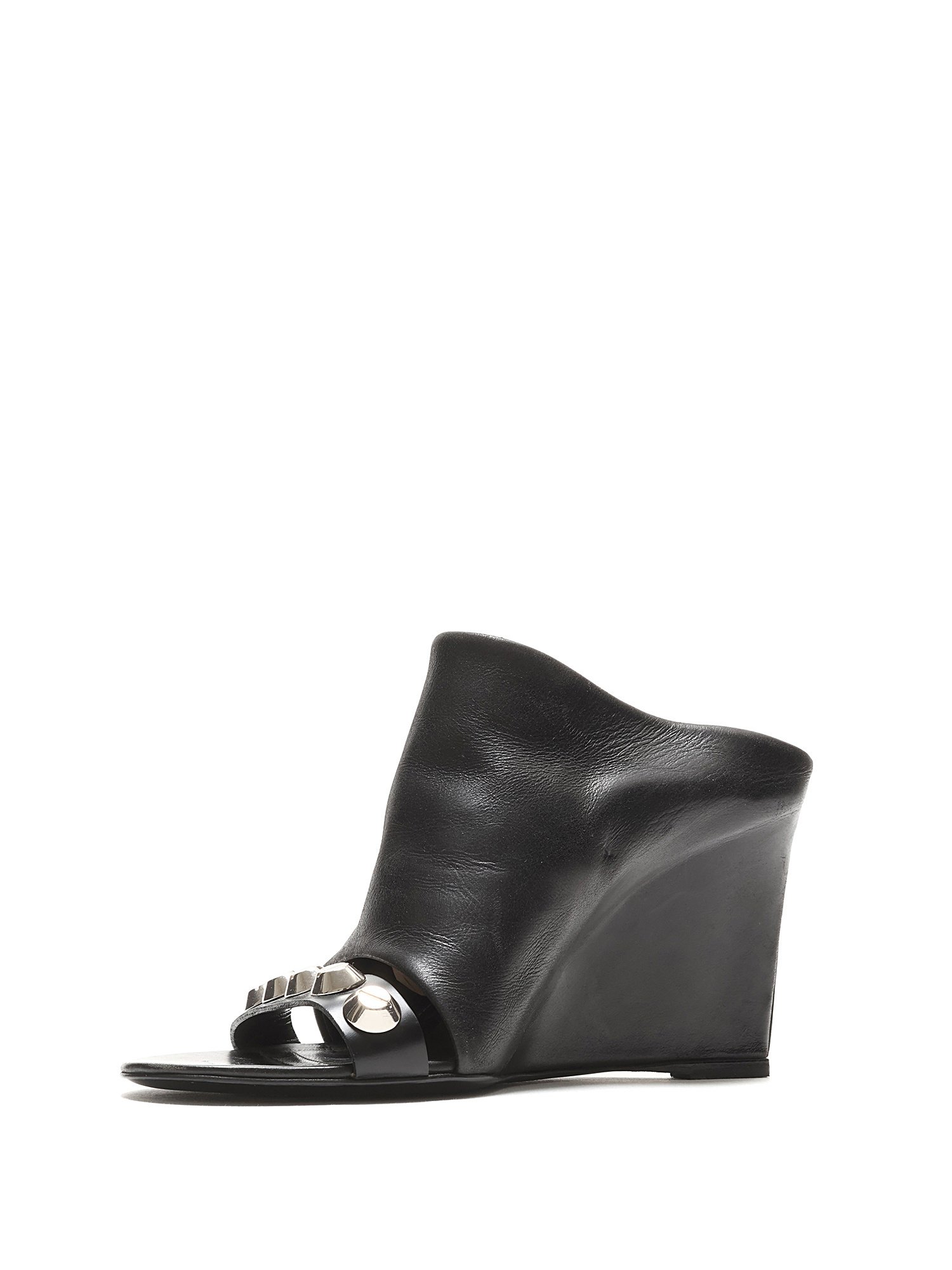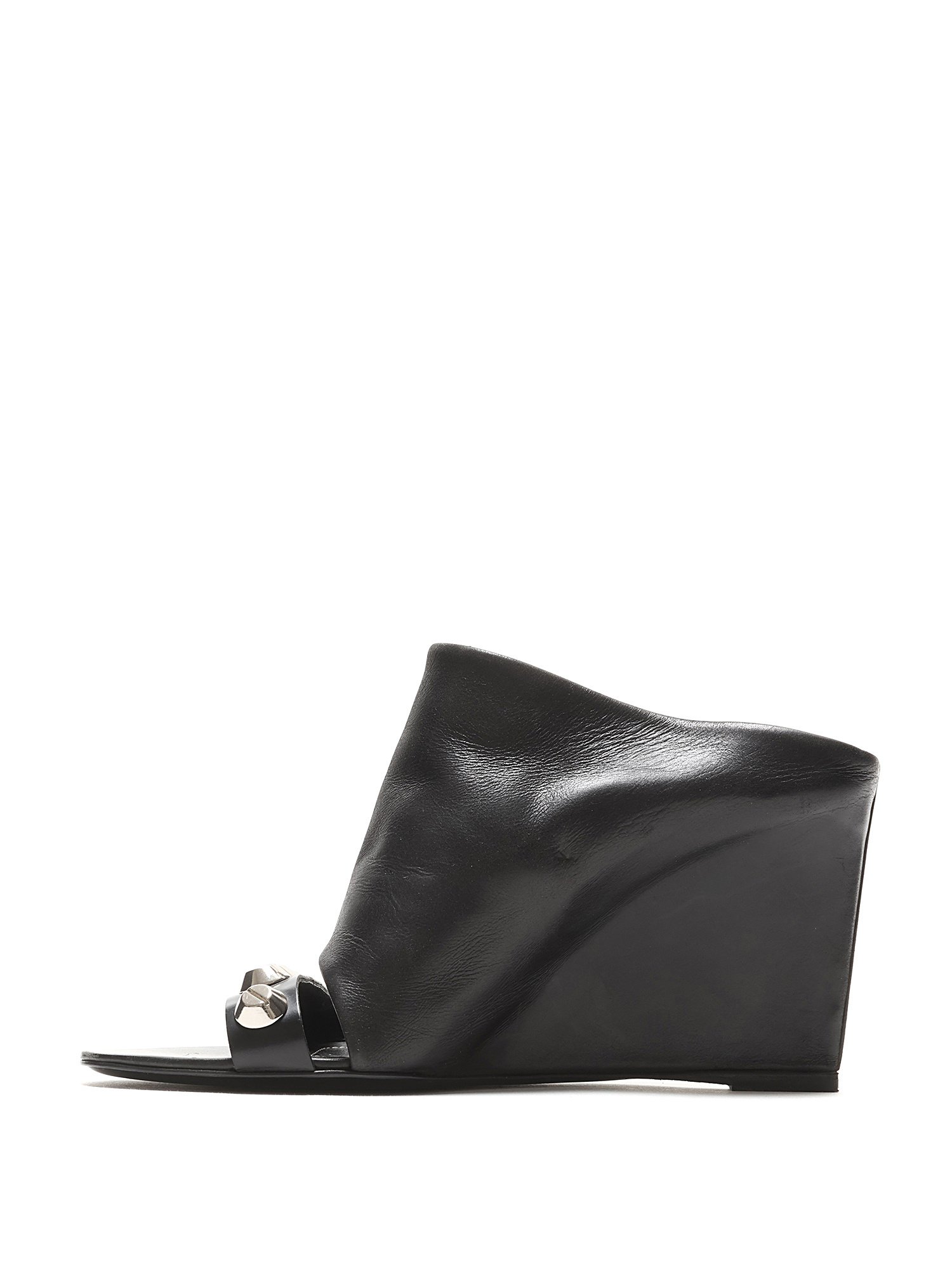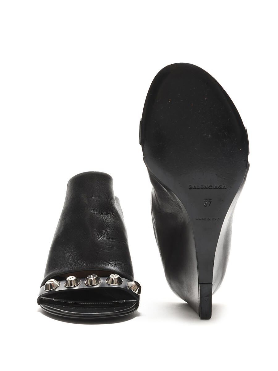 Mules à talon compensé en cuir avec un design de brides cloutées en noir. Style à bout ouvert avec une finition élégante. Semelle en cuir.