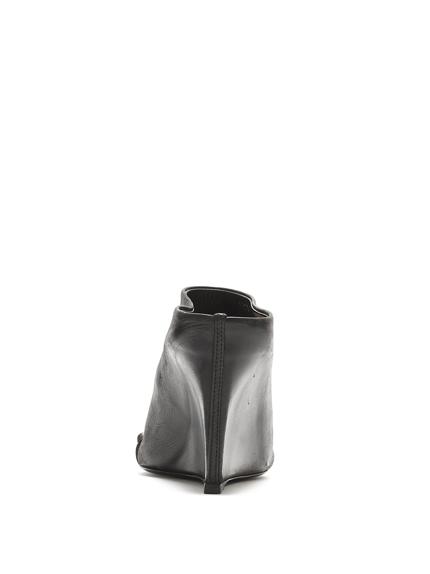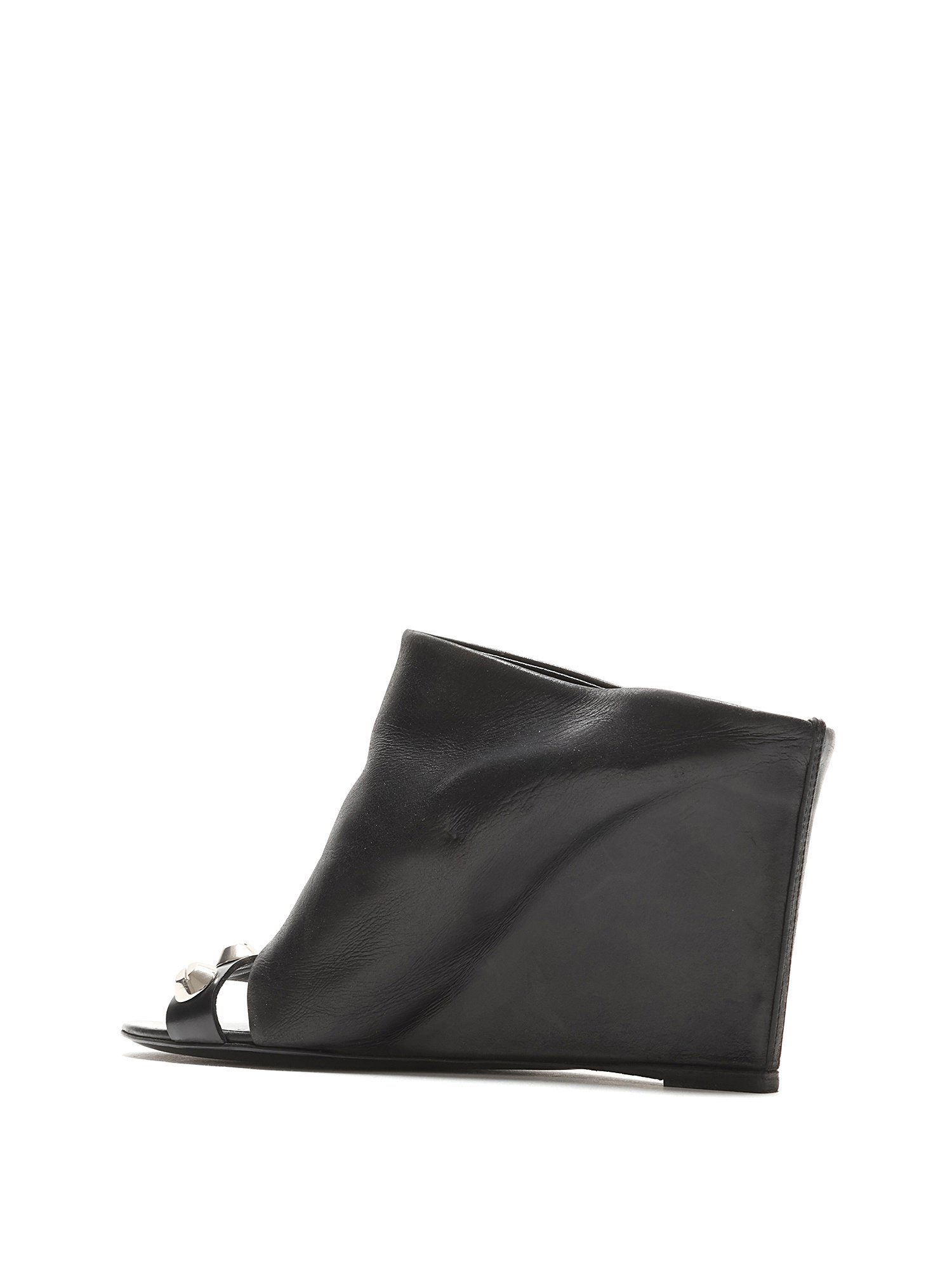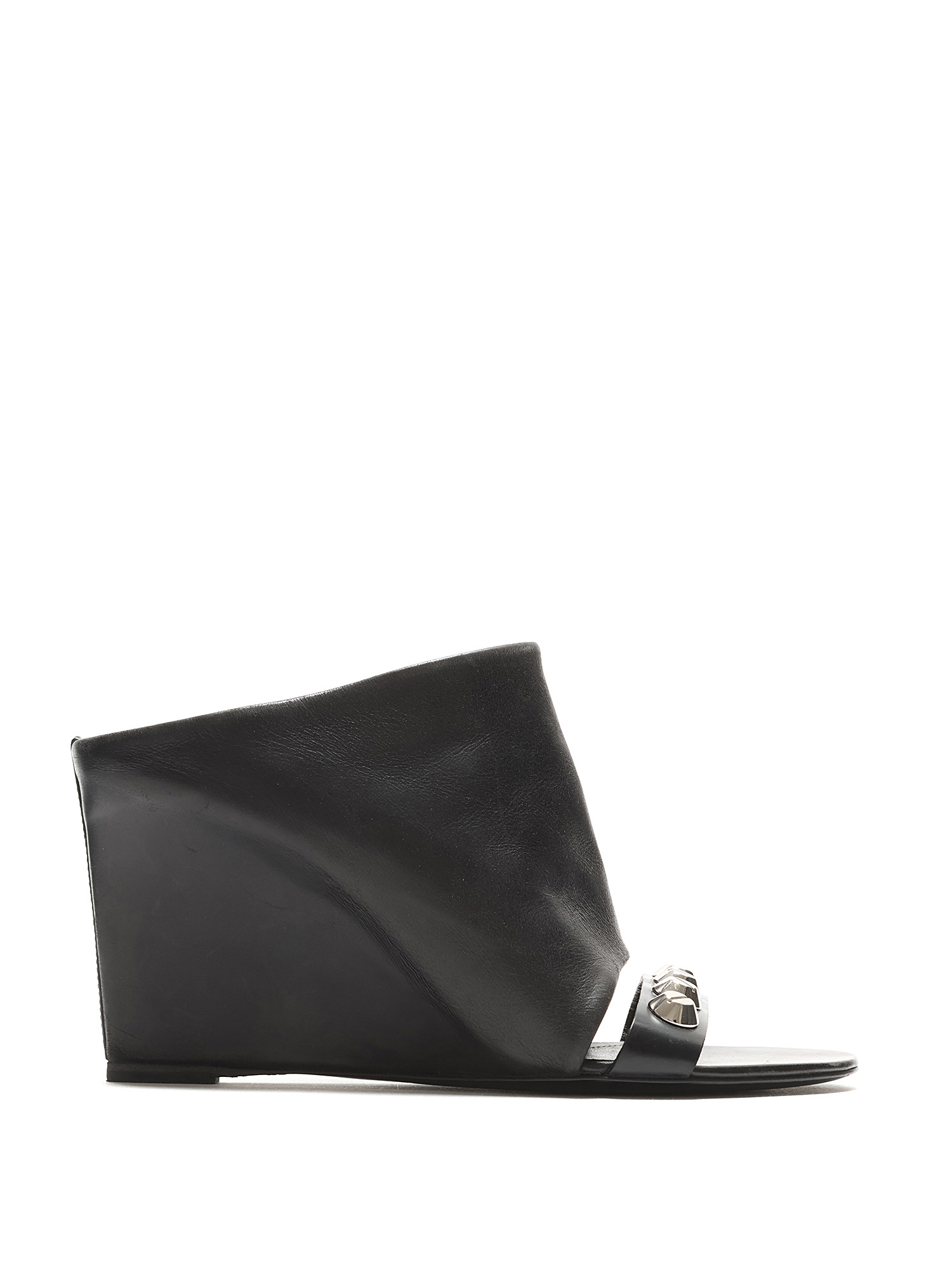 Mules à talon compensé en cuir avec un design de brides cloutées en noir. Style à bout ouvert avec une finition élégante. Semelle en cuir.