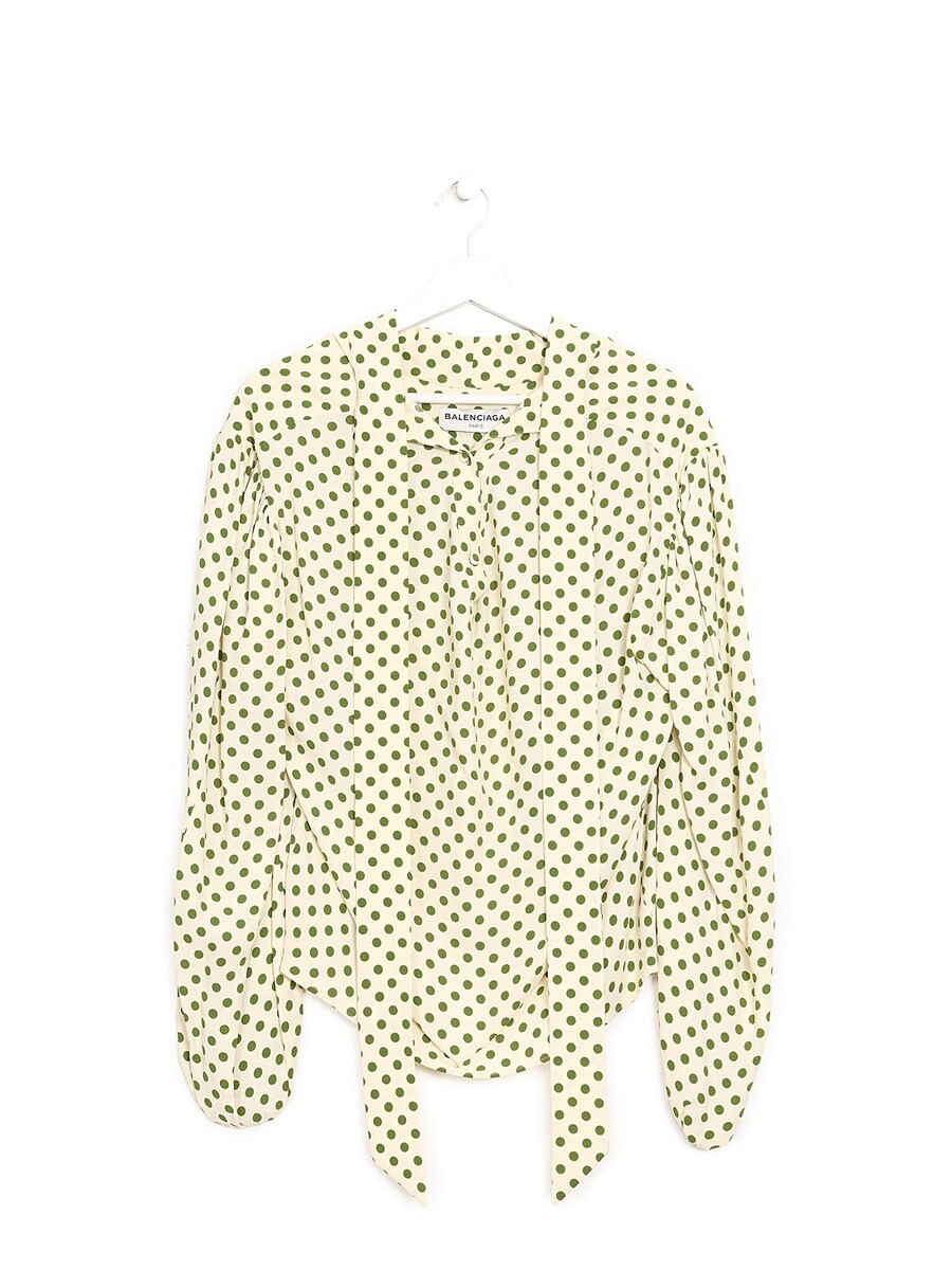 Blouse à manches longues avec motif à pois verts et crème. Tissu léger. Encolure ronde.