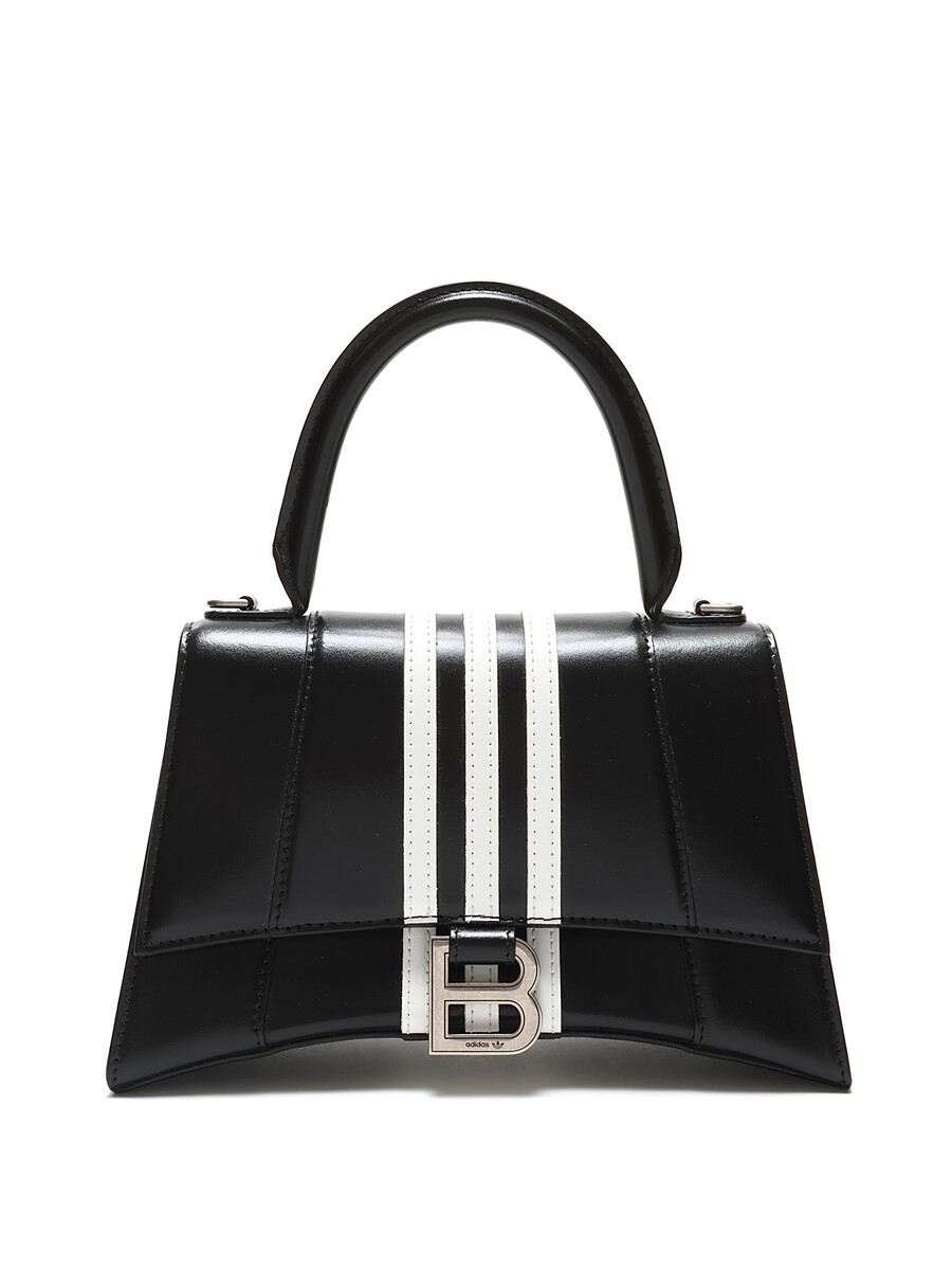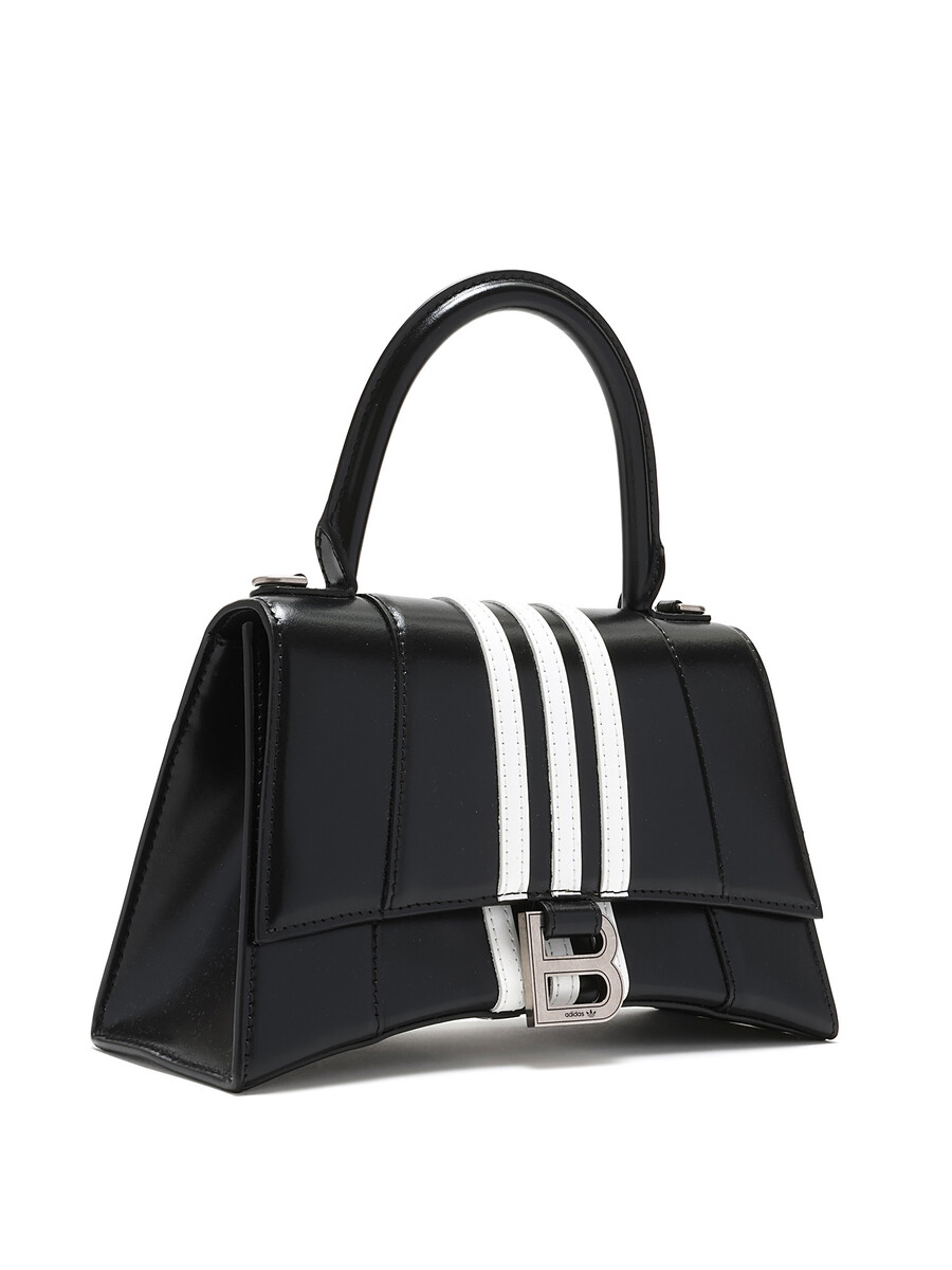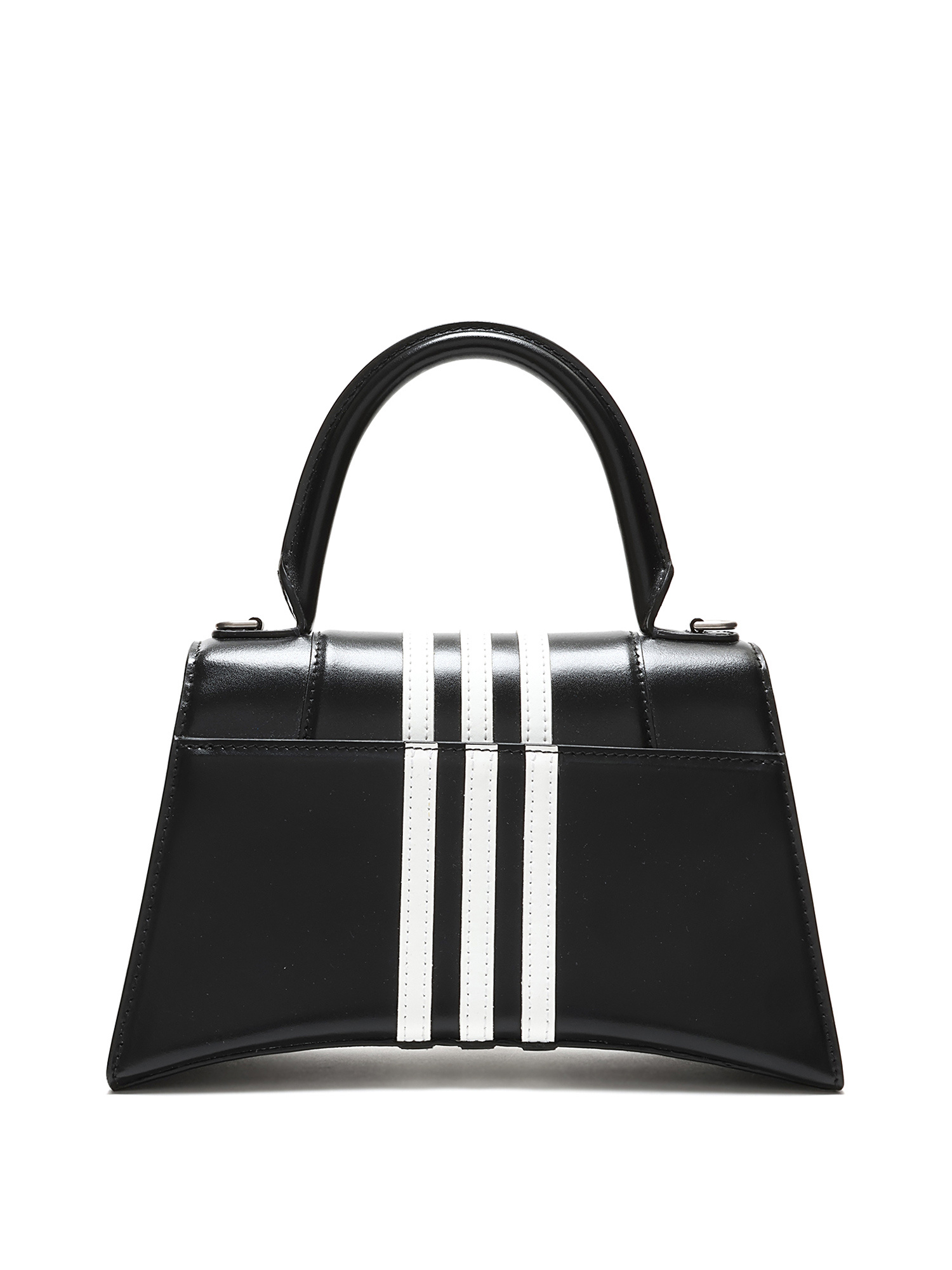 Petit sac à main en forme de sablier avec motif à rayures noires et blanches. Fermeture par bouton-pression magnétique. Poignées doubles roulées et bandoulière amovible et réglable en métal argenté. Livré avec dust bag.