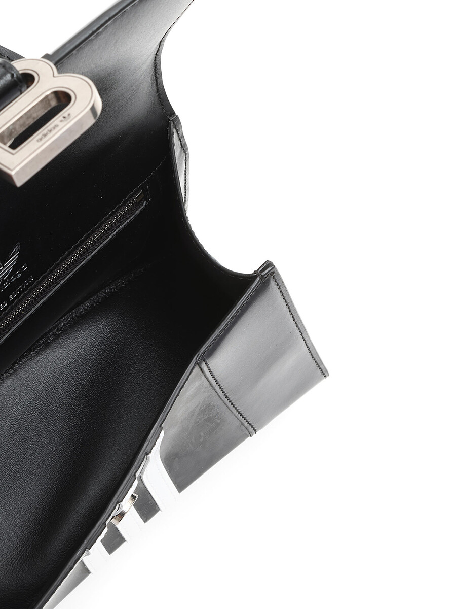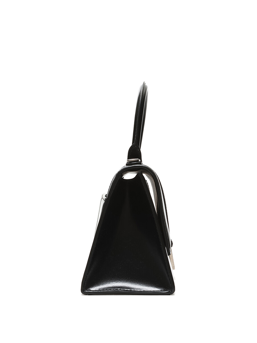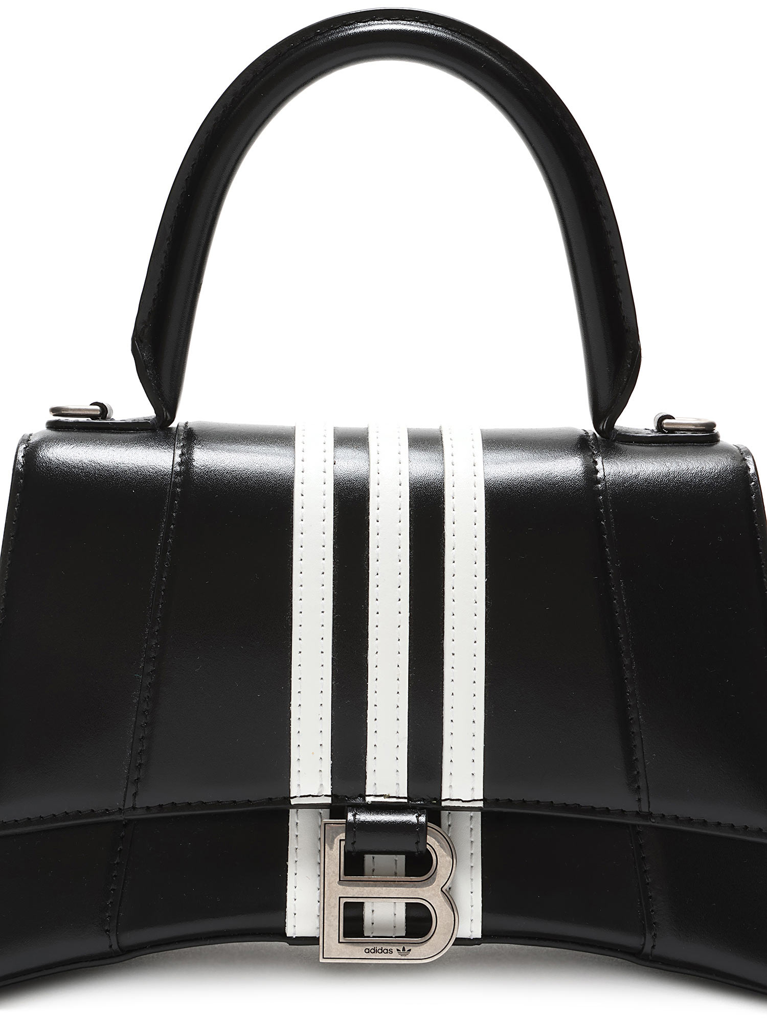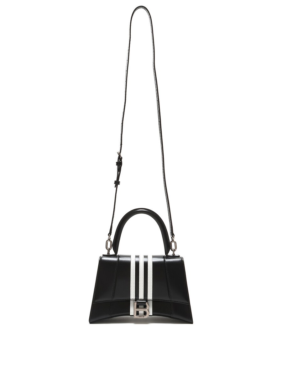 Petit sac à main en forme de sablier avec motif à rayures noires et blanches. Fermeture par bouton-pression magnétique. Poignées doubles roulées et bandoulière amovible et réglable en métal argenté. Livré avec dust bag.