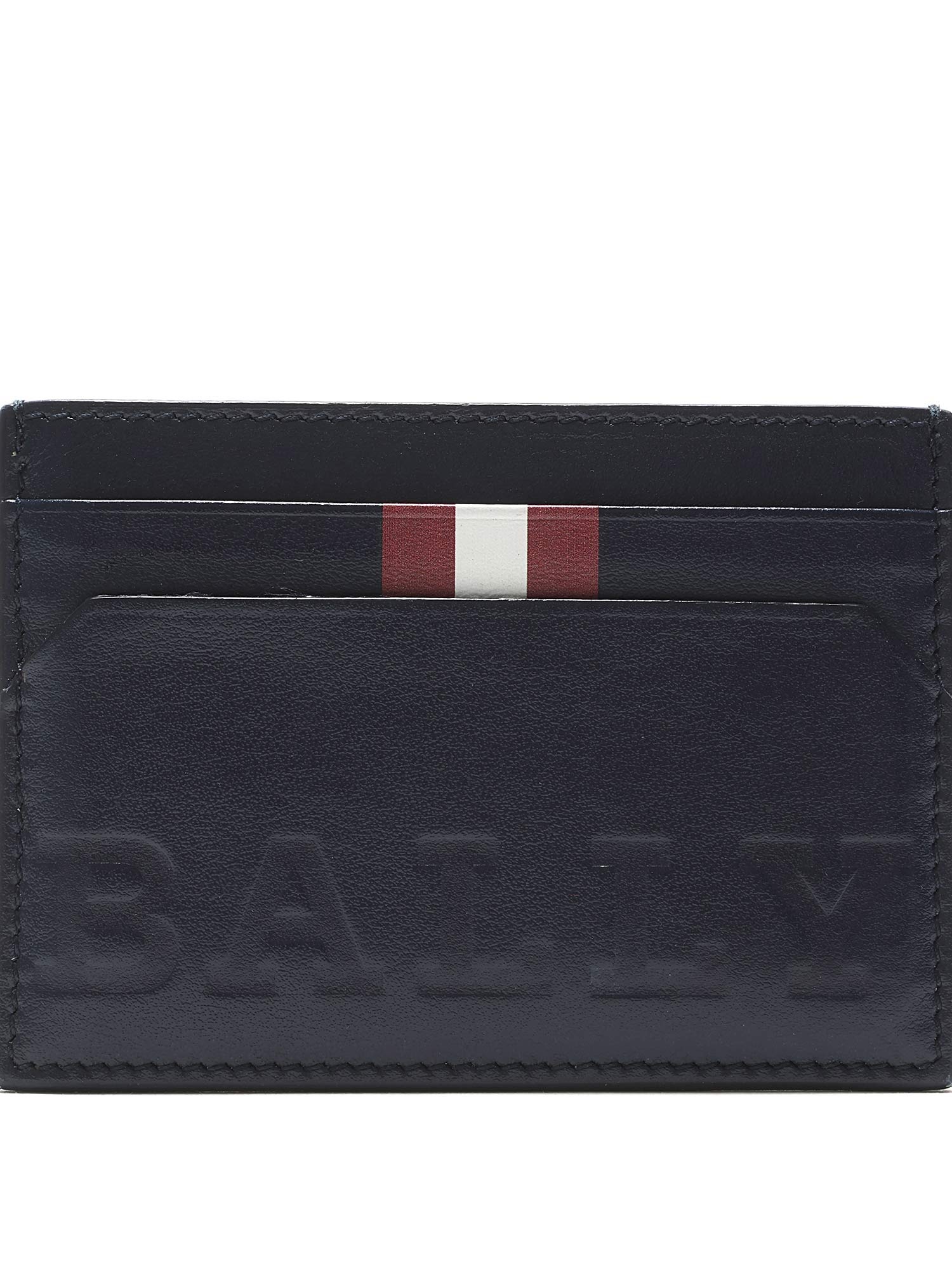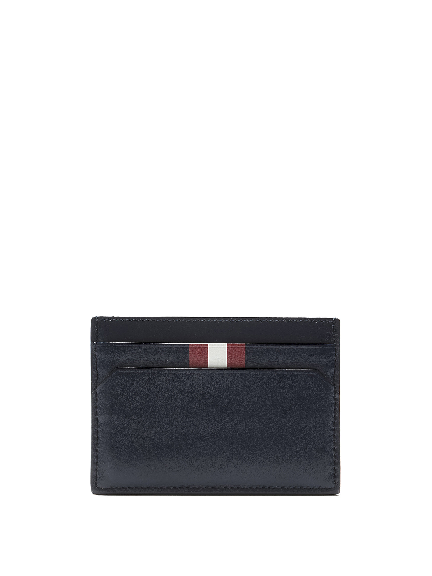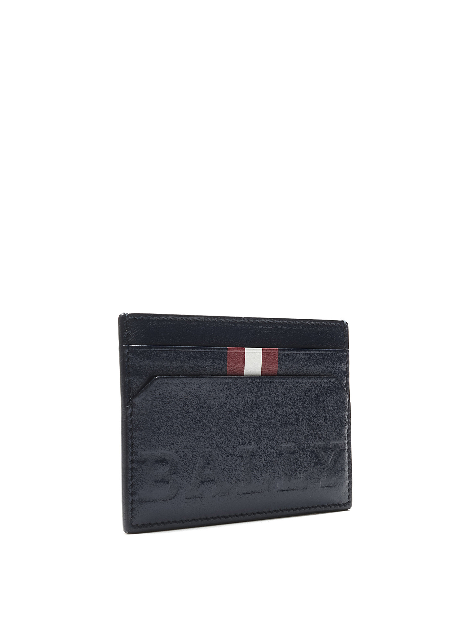 Porte-cartes en cuir grainé bleu avec logo embossé. Bande signature rouge et blanche. Coutures ton sur ton.