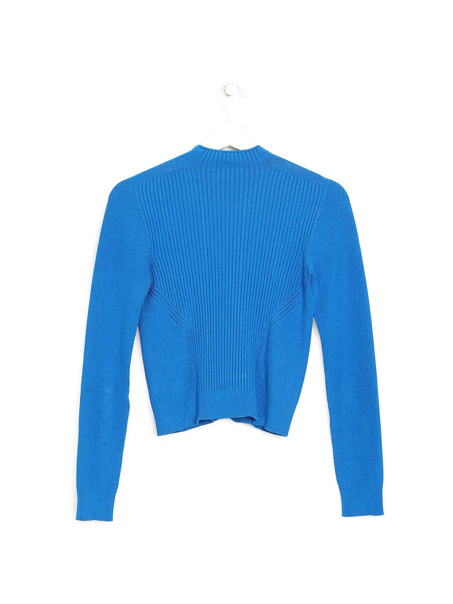 Haut à manches longues en texture côtelée, bleu. Boutons décoratifs dorés au devant. Encolure en V.