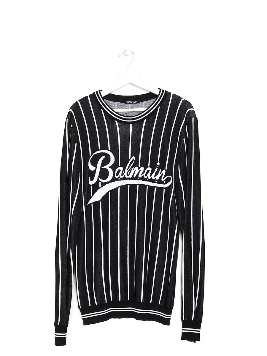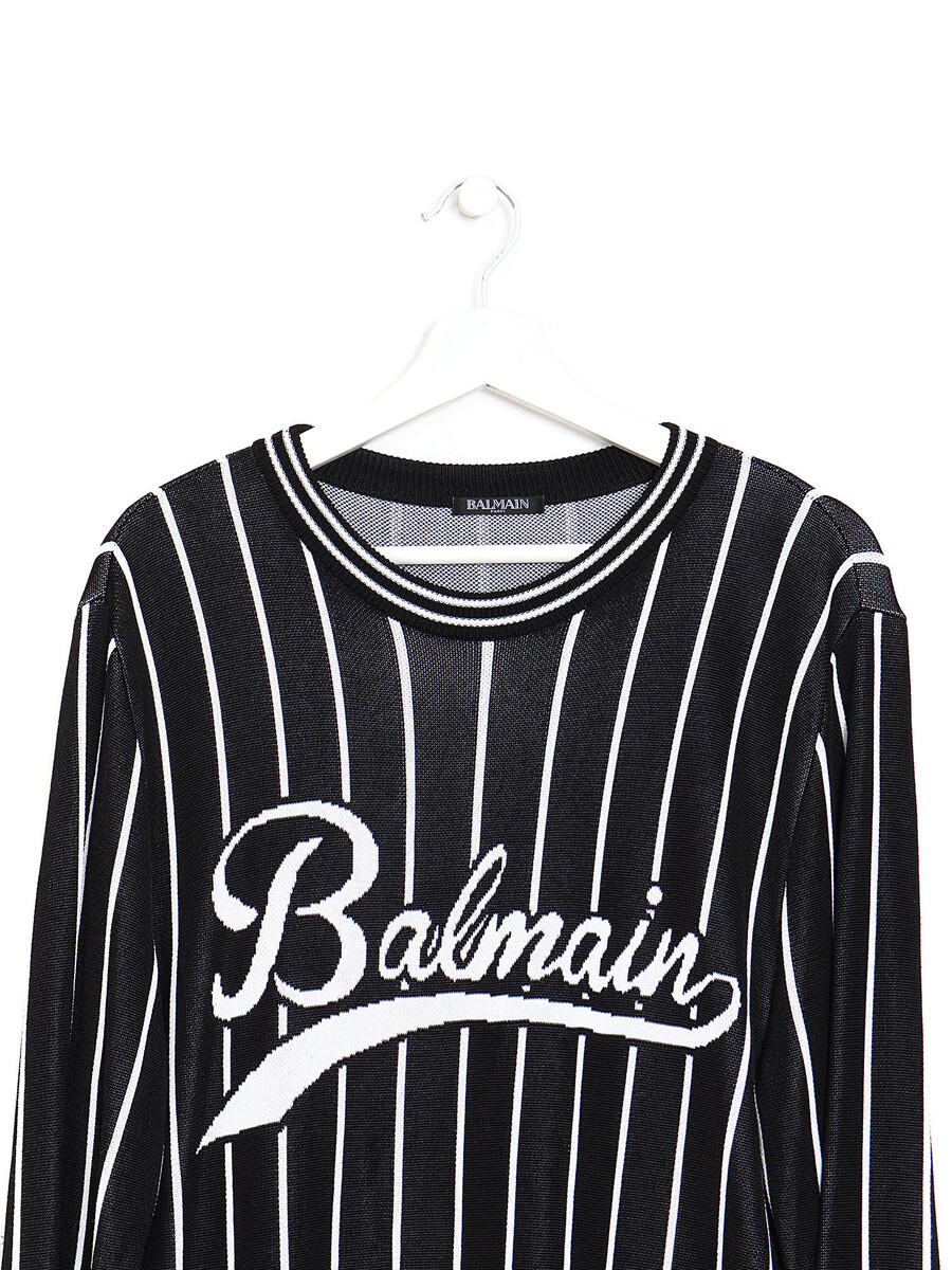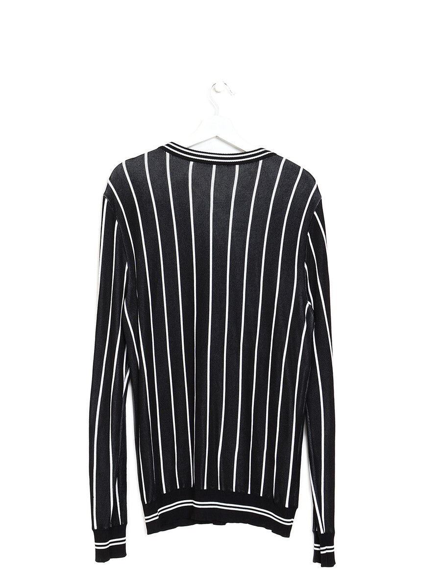 Pull en tricot à manches longues noir avec rayures verticales blanches et logo sur la poitrine.