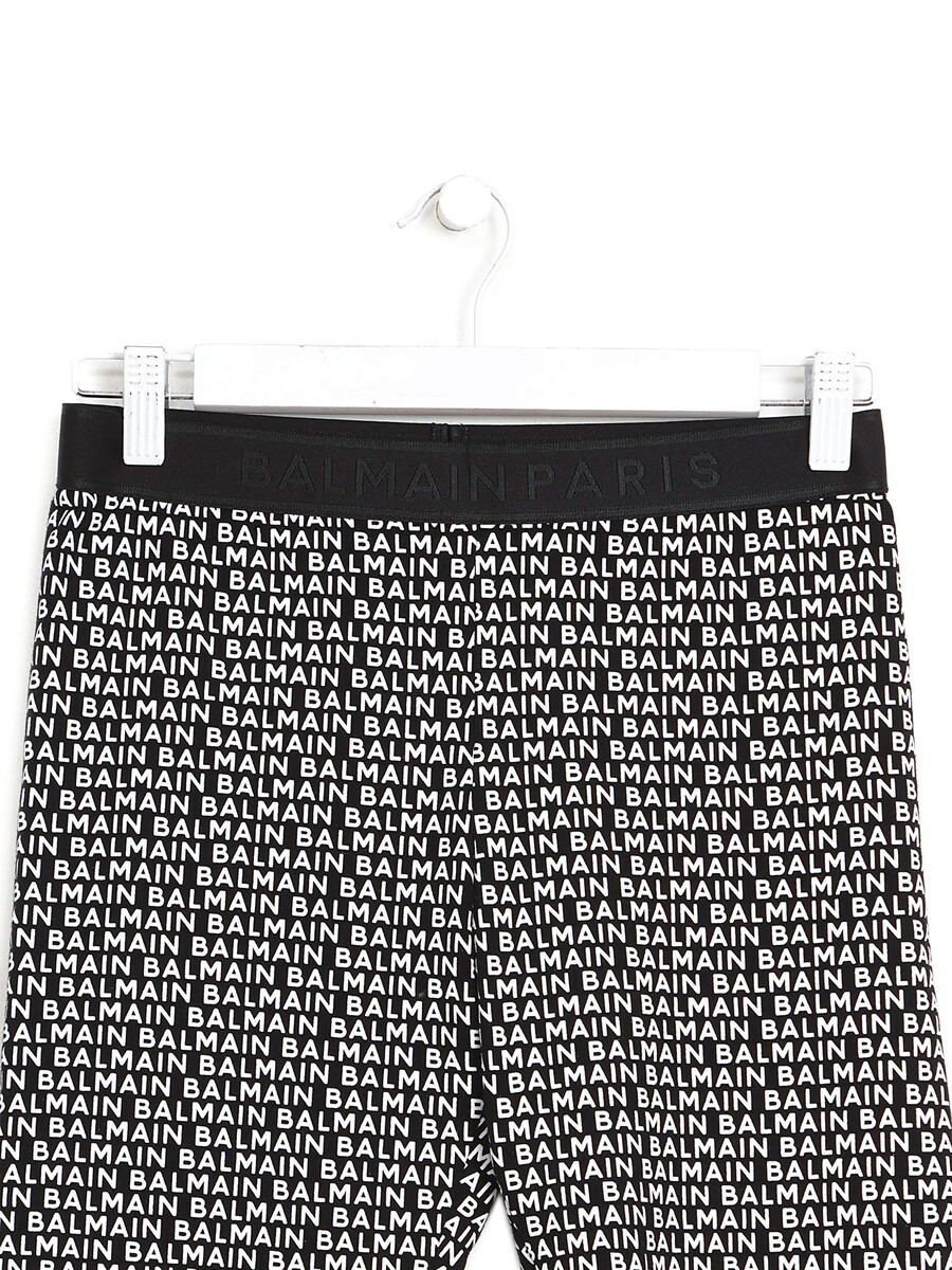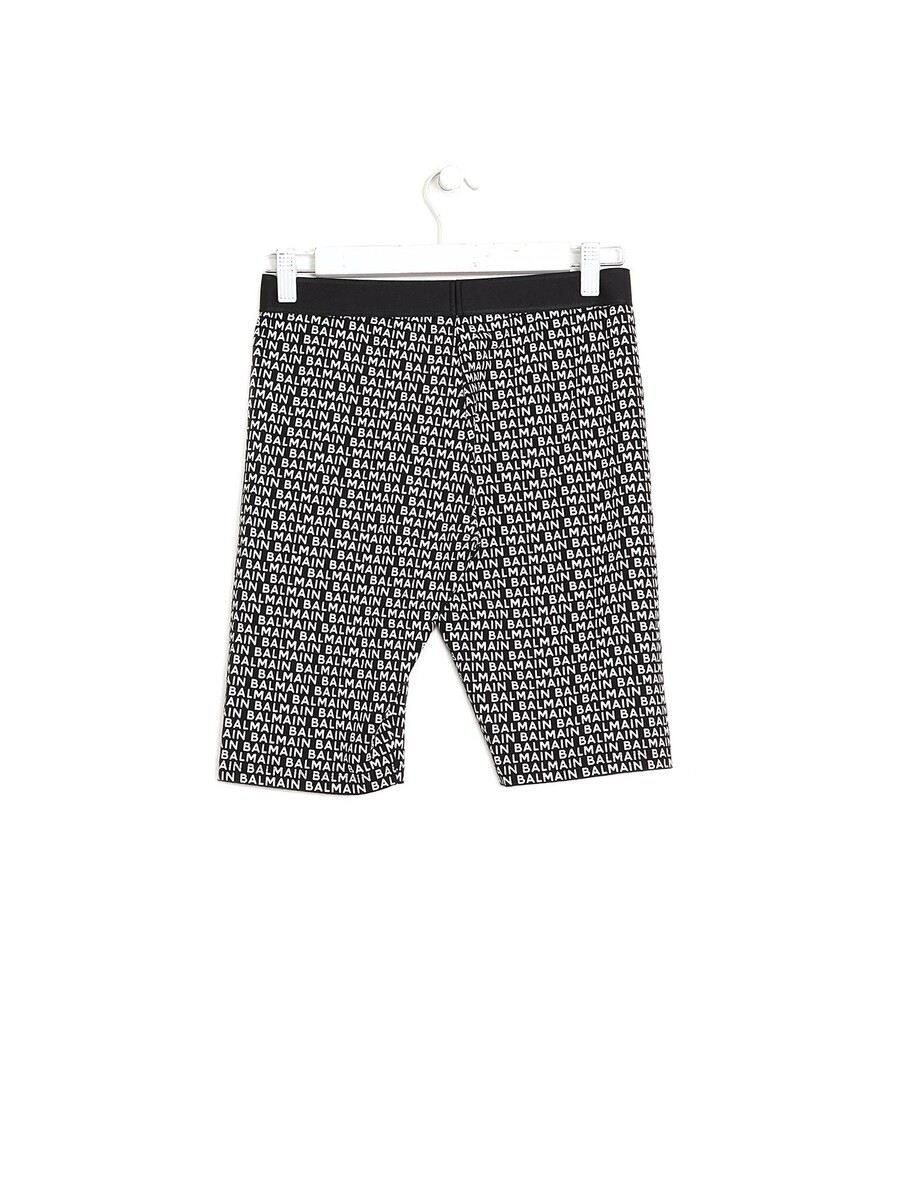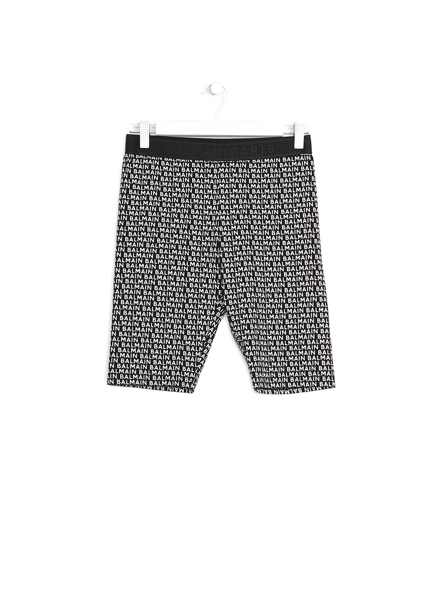Ensemble de sport court sans manches incluant un soutien-gorge et un short à motif graphique noir et blanc. Taille élastique avec logo.