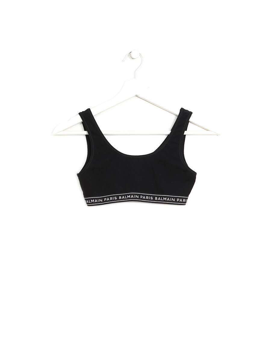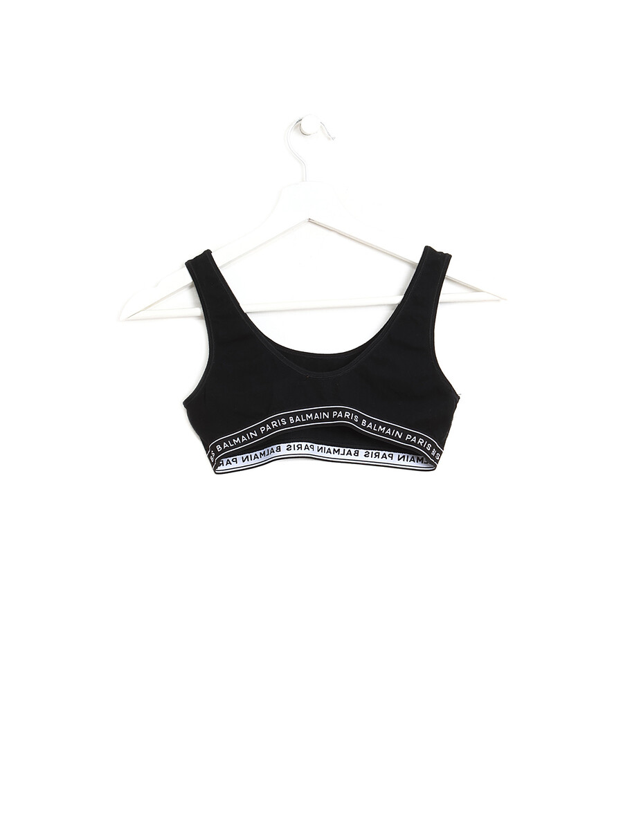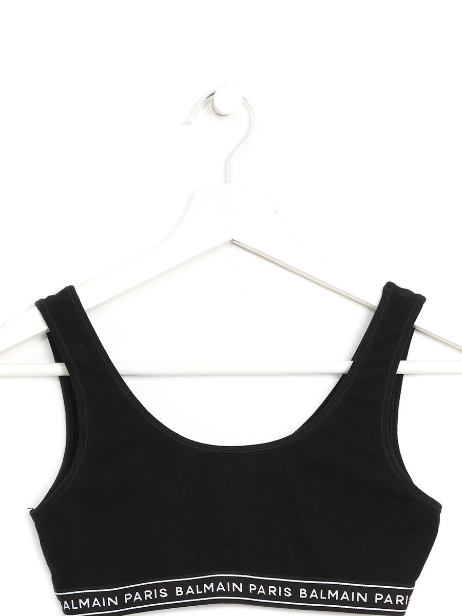 Ensemble de sport court sans manches incluant un soutien-gorge et un short à motif graphique noir et blanc. Taille élastique avec logo.