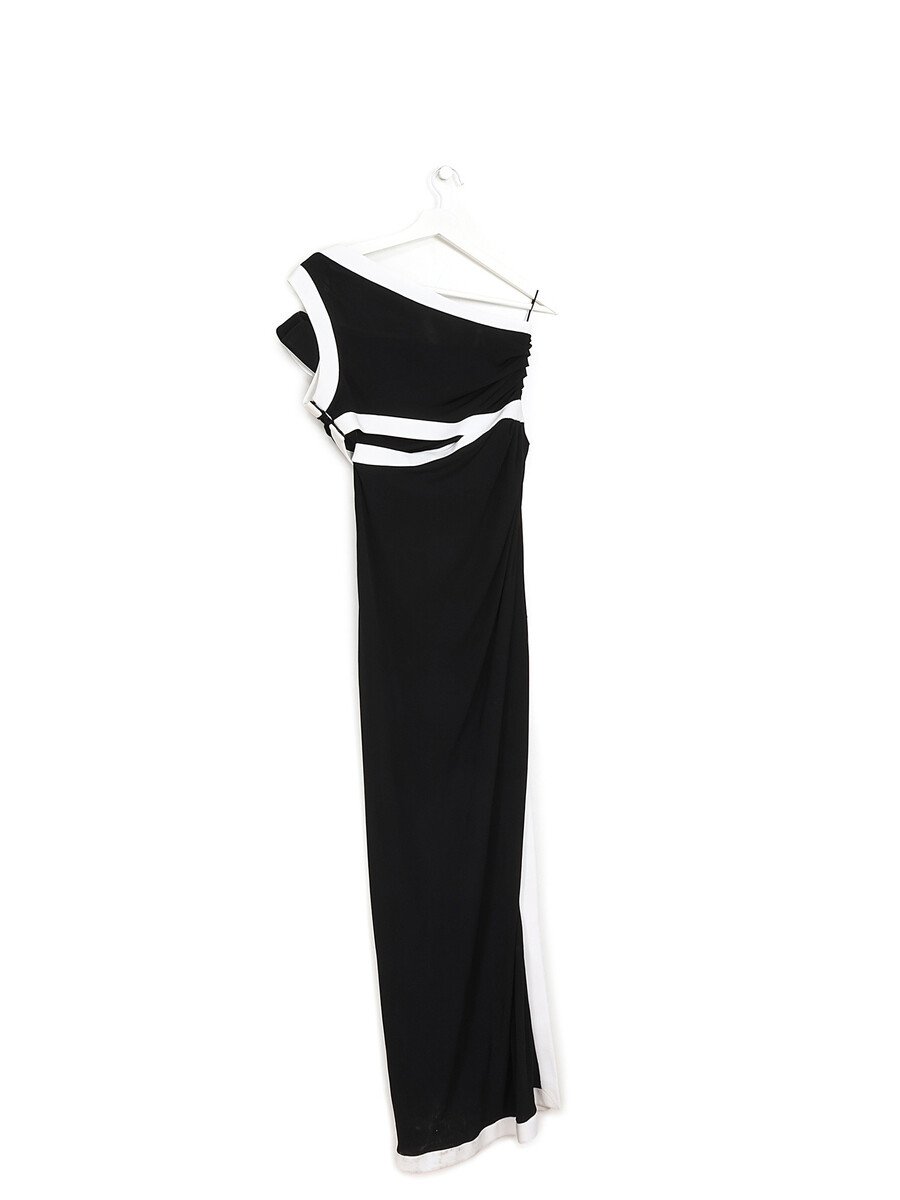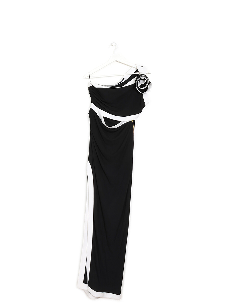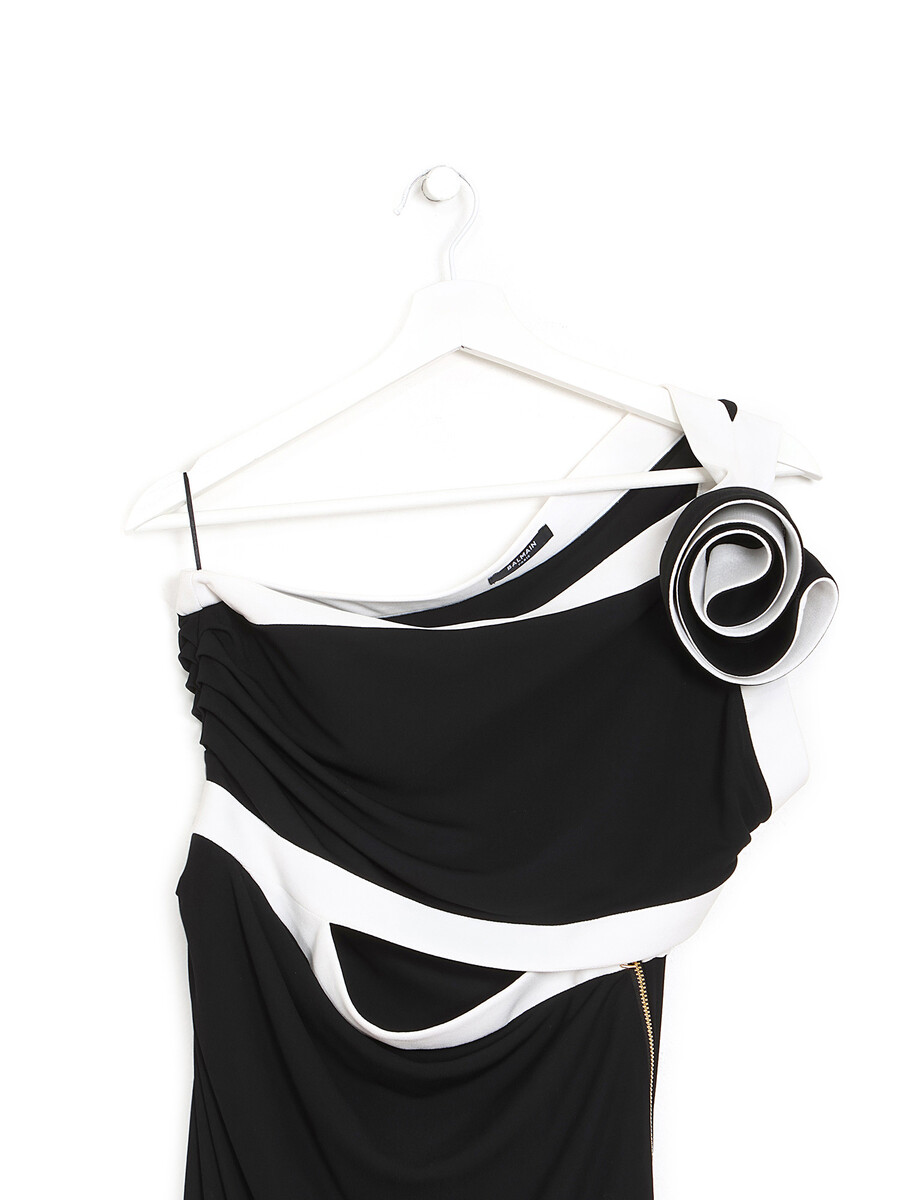 Robe de soirée élégante noire et blanche. Fermeture à glissière au dos. Silhouette ajustée. Tissu fluide.