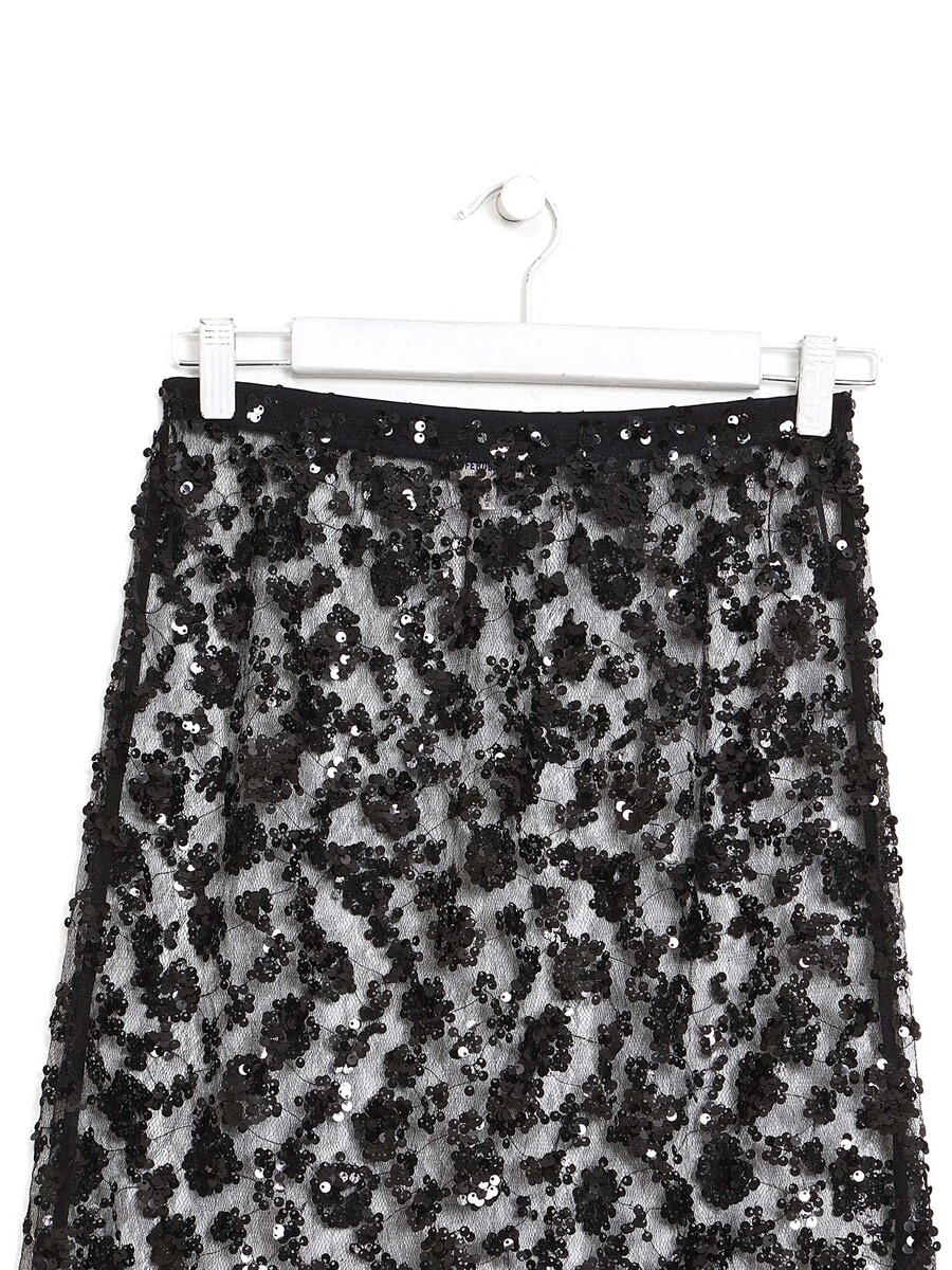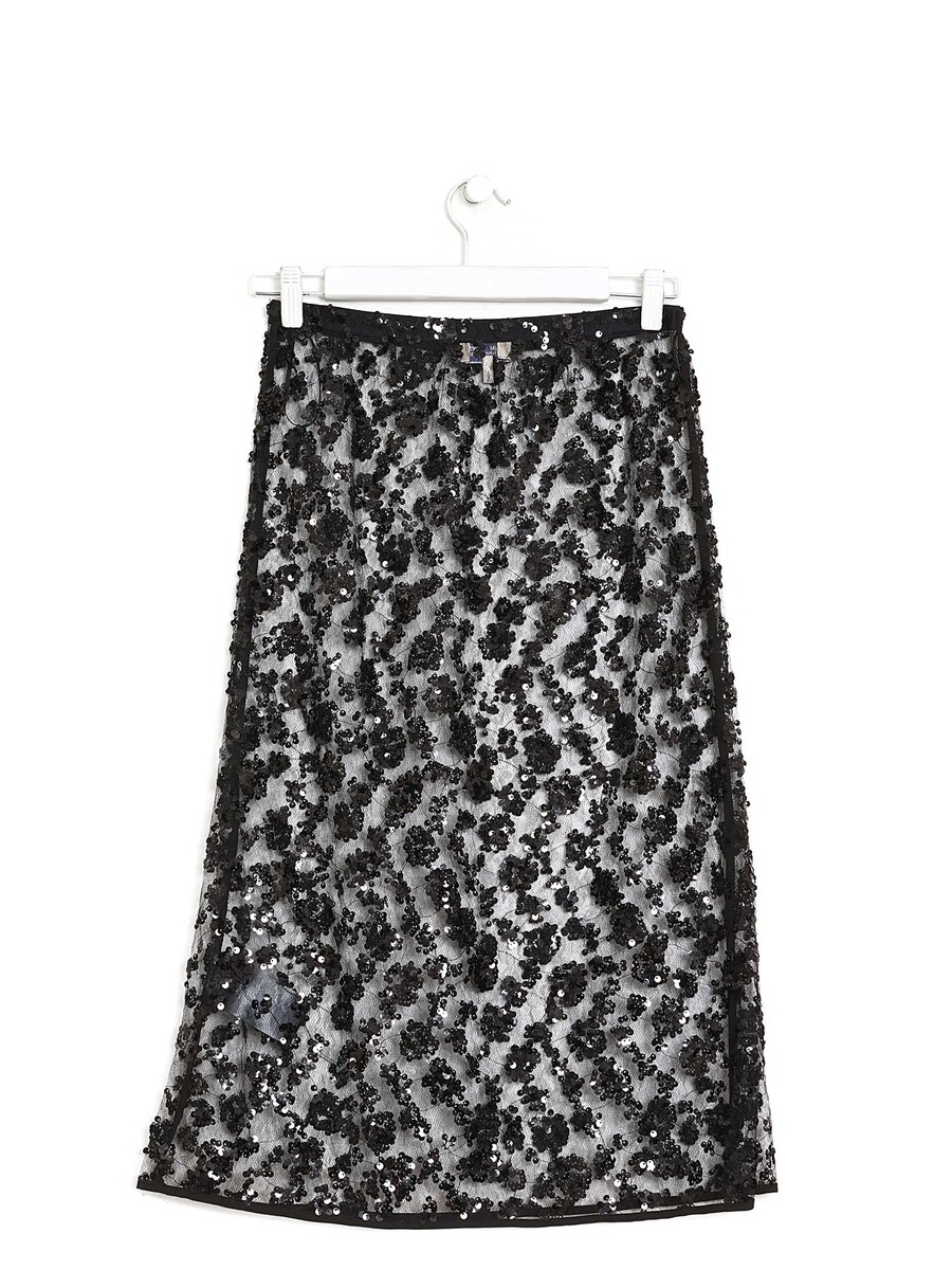 Jupe midi noire ornée de dentelle et de sequins.