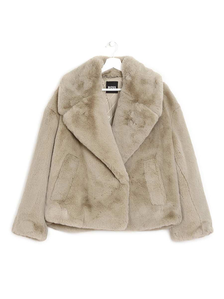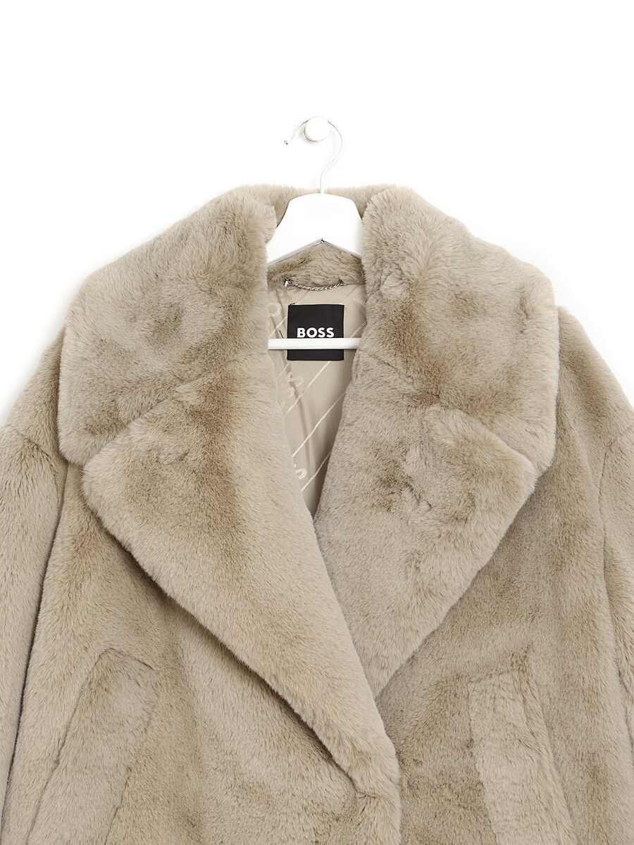 Manteau en fausse fourrure beige avec fermeture à crochets. Col à revers cranté. Poches à rabat sur le devant. Entièrement doublé.