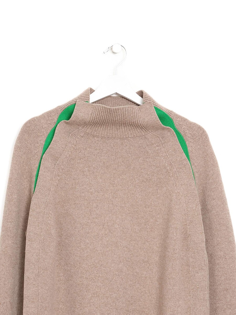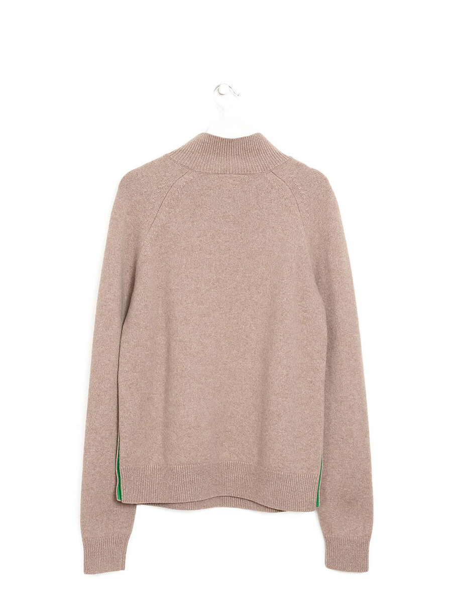 Pull en laine à manches longues beige avec garniture en vert. Fermeture à boutons-pression aux épaules.
